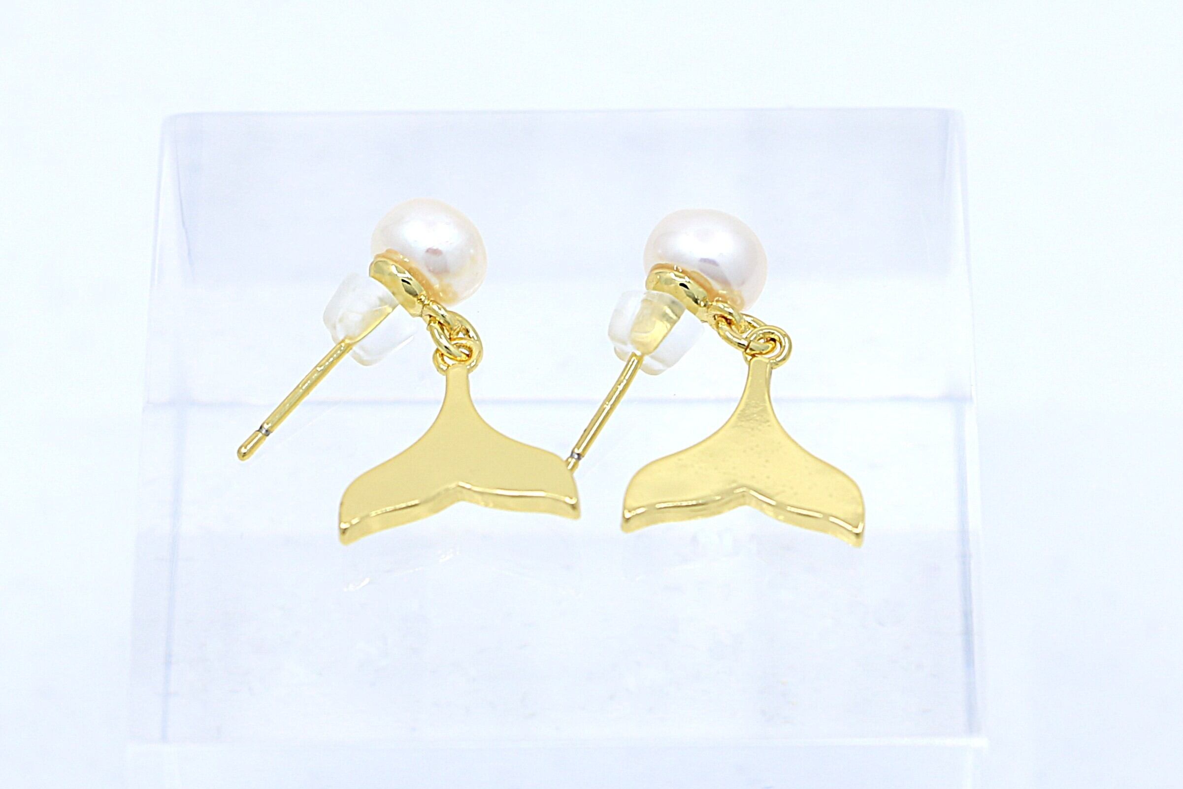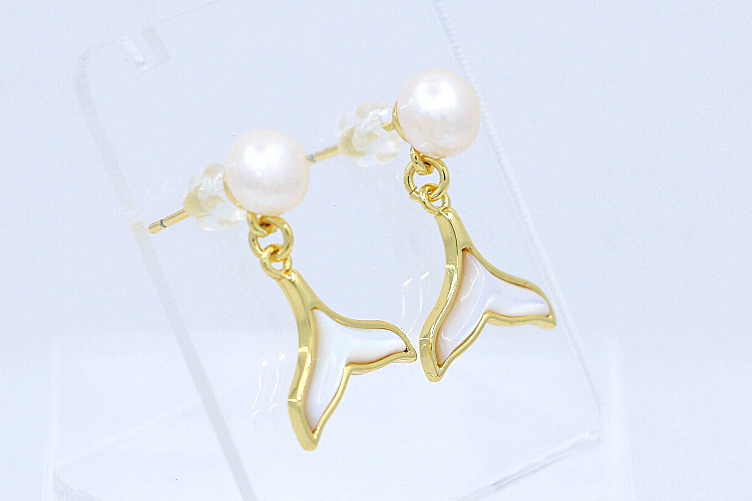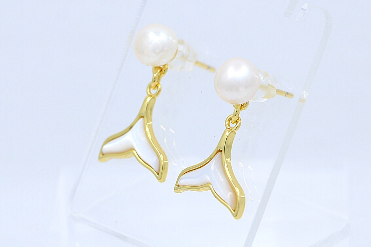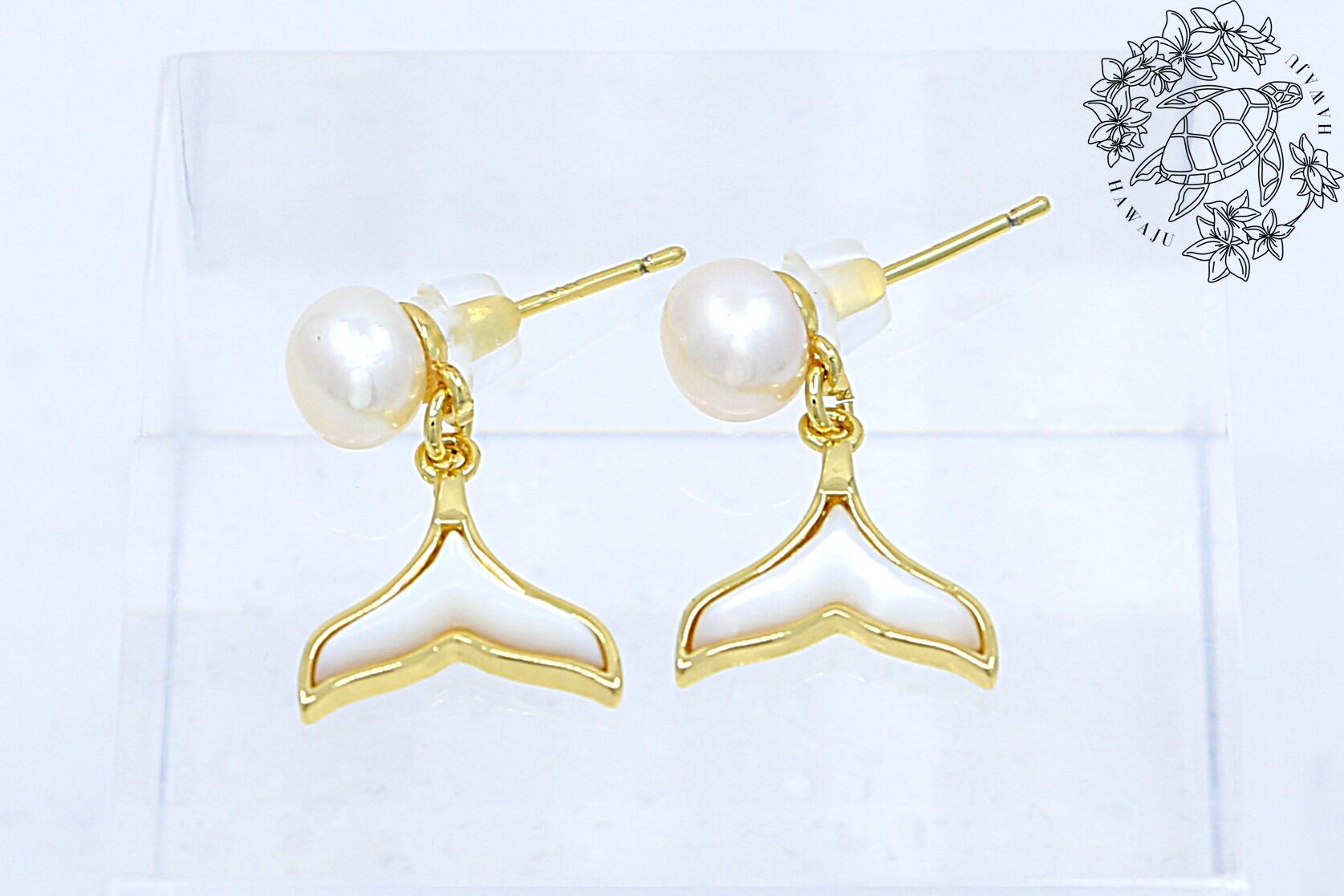 ポスト部分には上品なホワイトパール が付き、その下でホエールテール(クジラの尾) モチーフが優雅に揺れるデザイン。ホエールテール部分にはホワイトシェル(貝)インレイ が施され、海を感じさせるハワイアンテイストのピアスに仕上がっています。