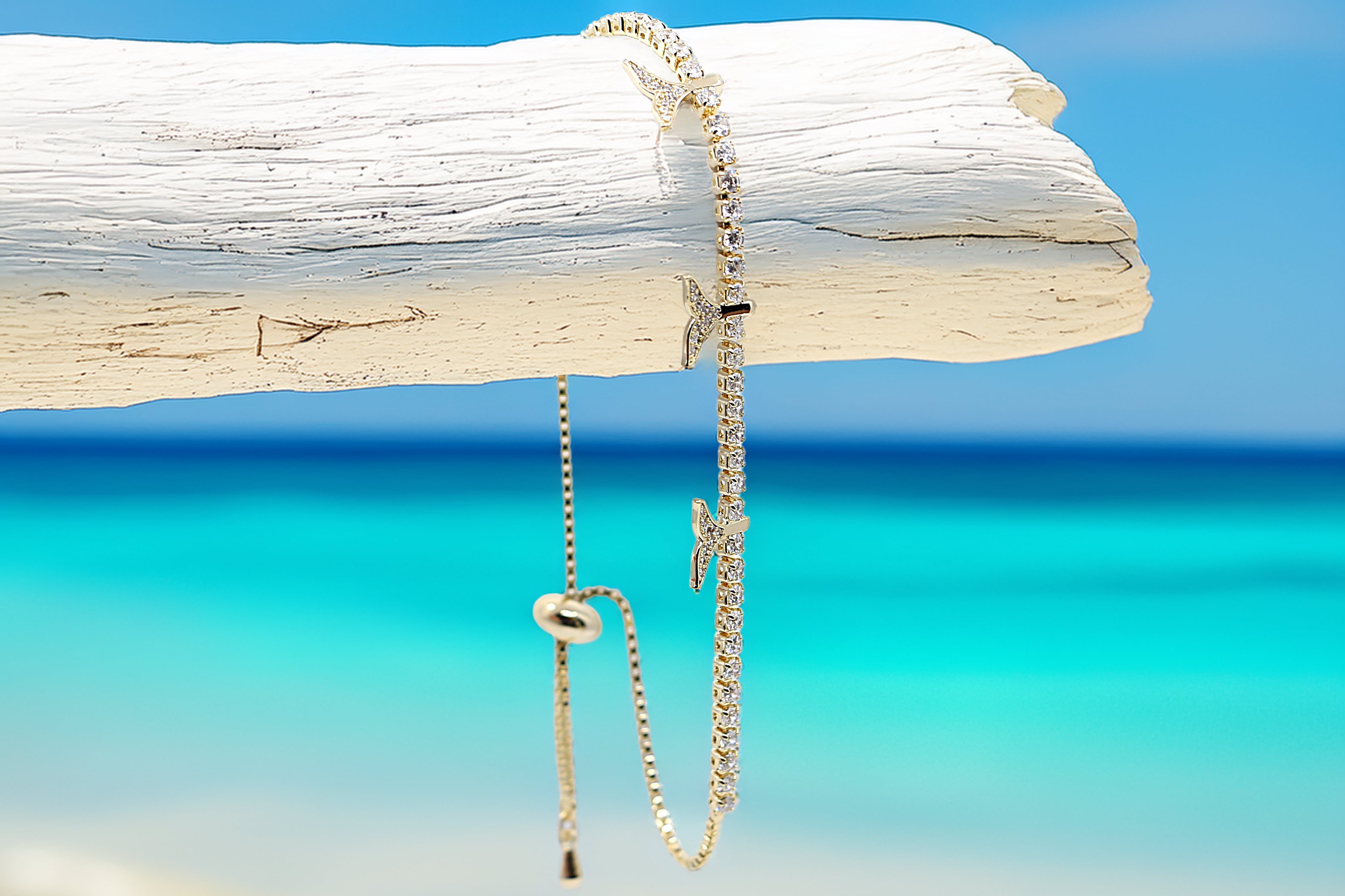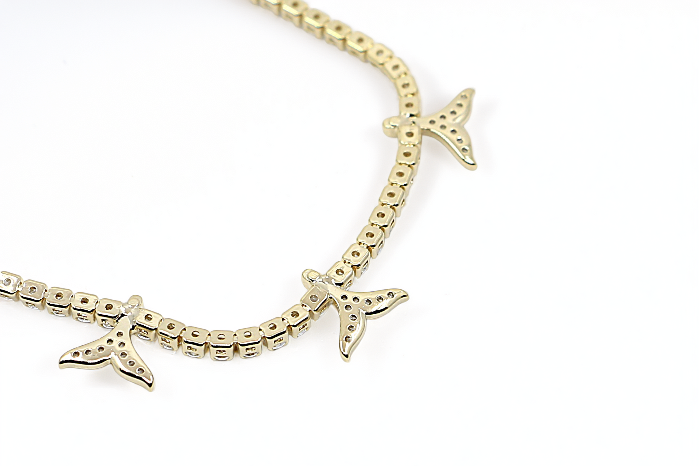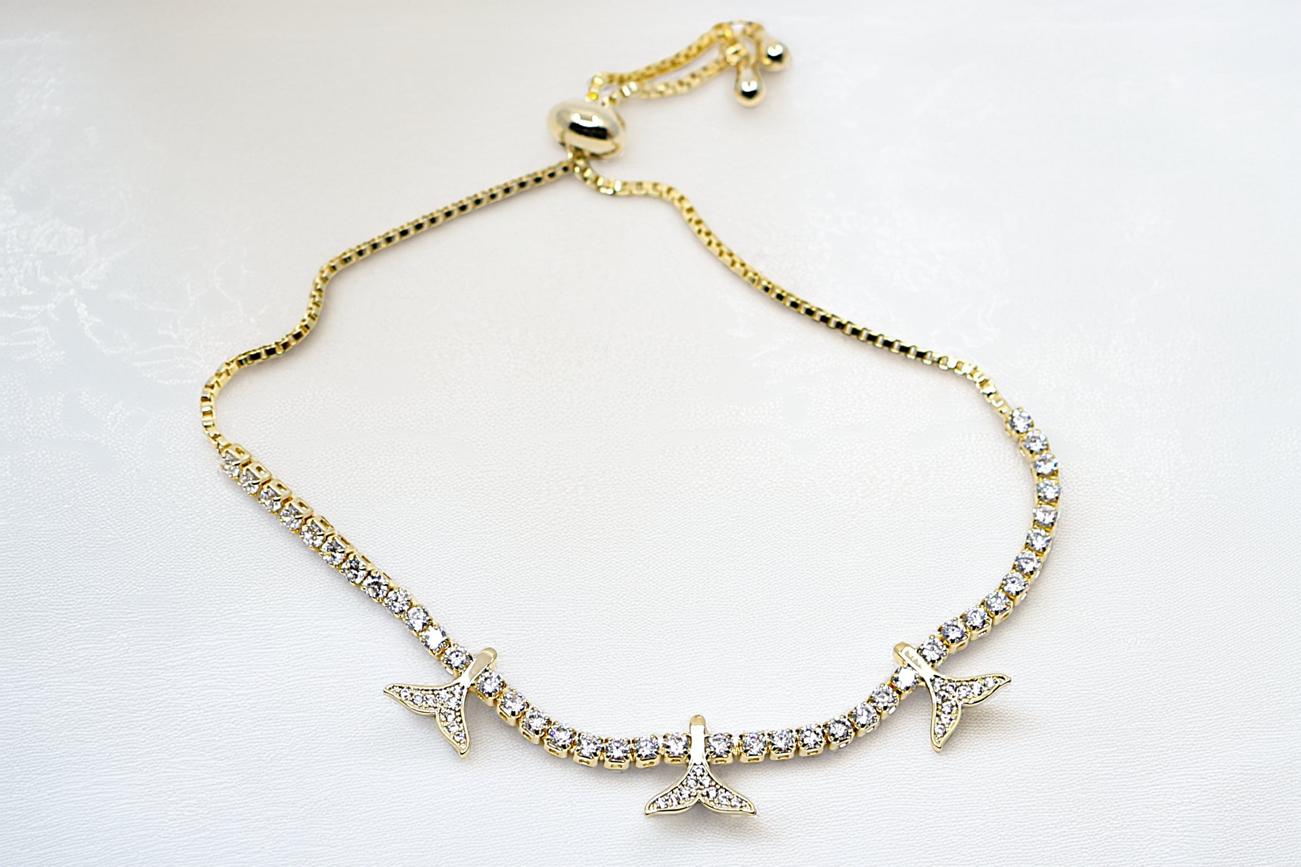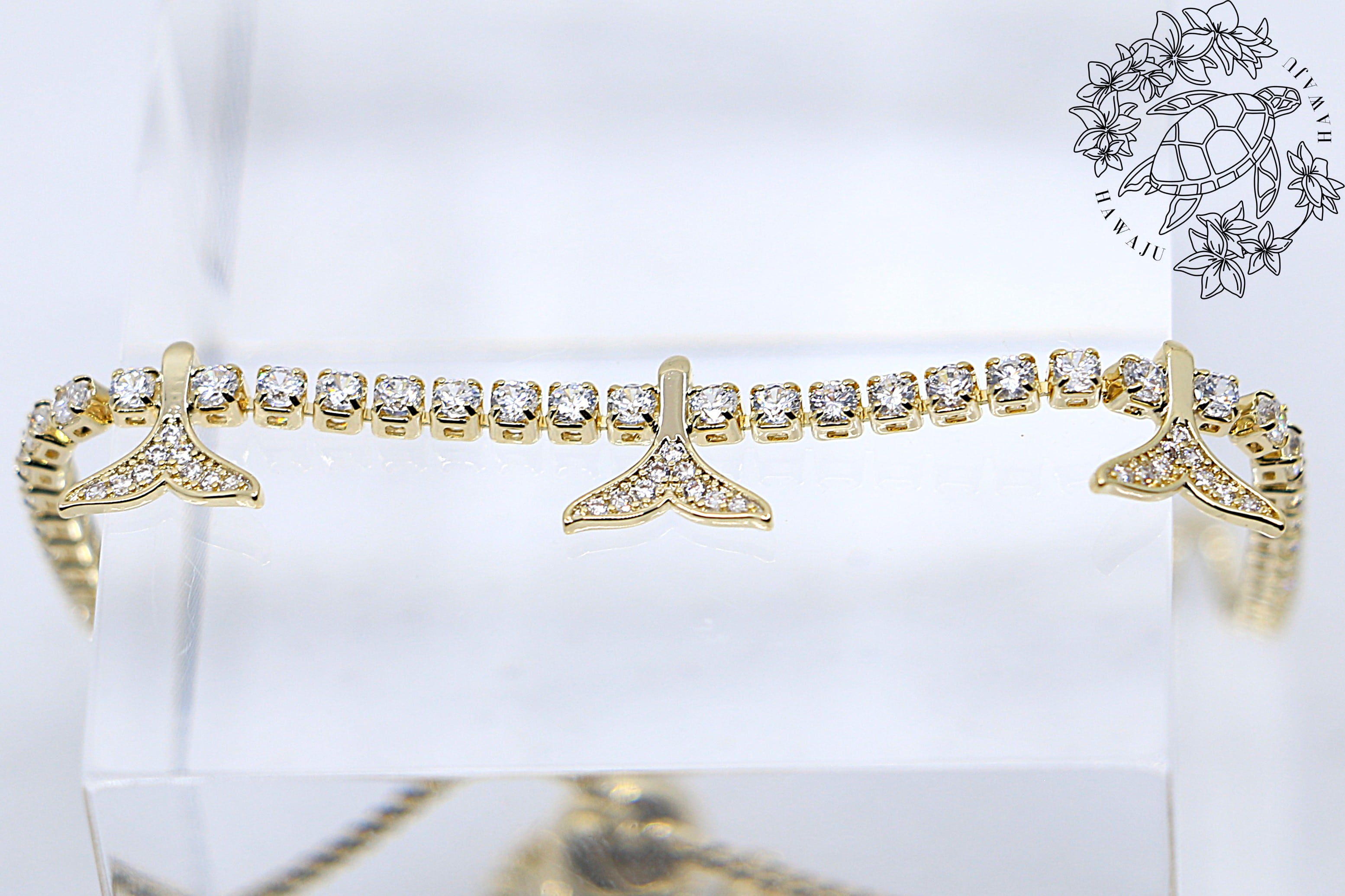 ホエールテールのモチーフが手元に幸運と自由をもたらし、キュービックジルコニアのきらめきで華やかさをプラス。イエローゴールドカラーは肌なじみがよく、日常からリゾート、パーティーまで幅広く活躍します。誕生日や記念日、旅行のお土産としても喜ばれる一品です。