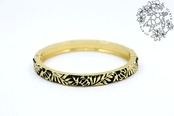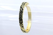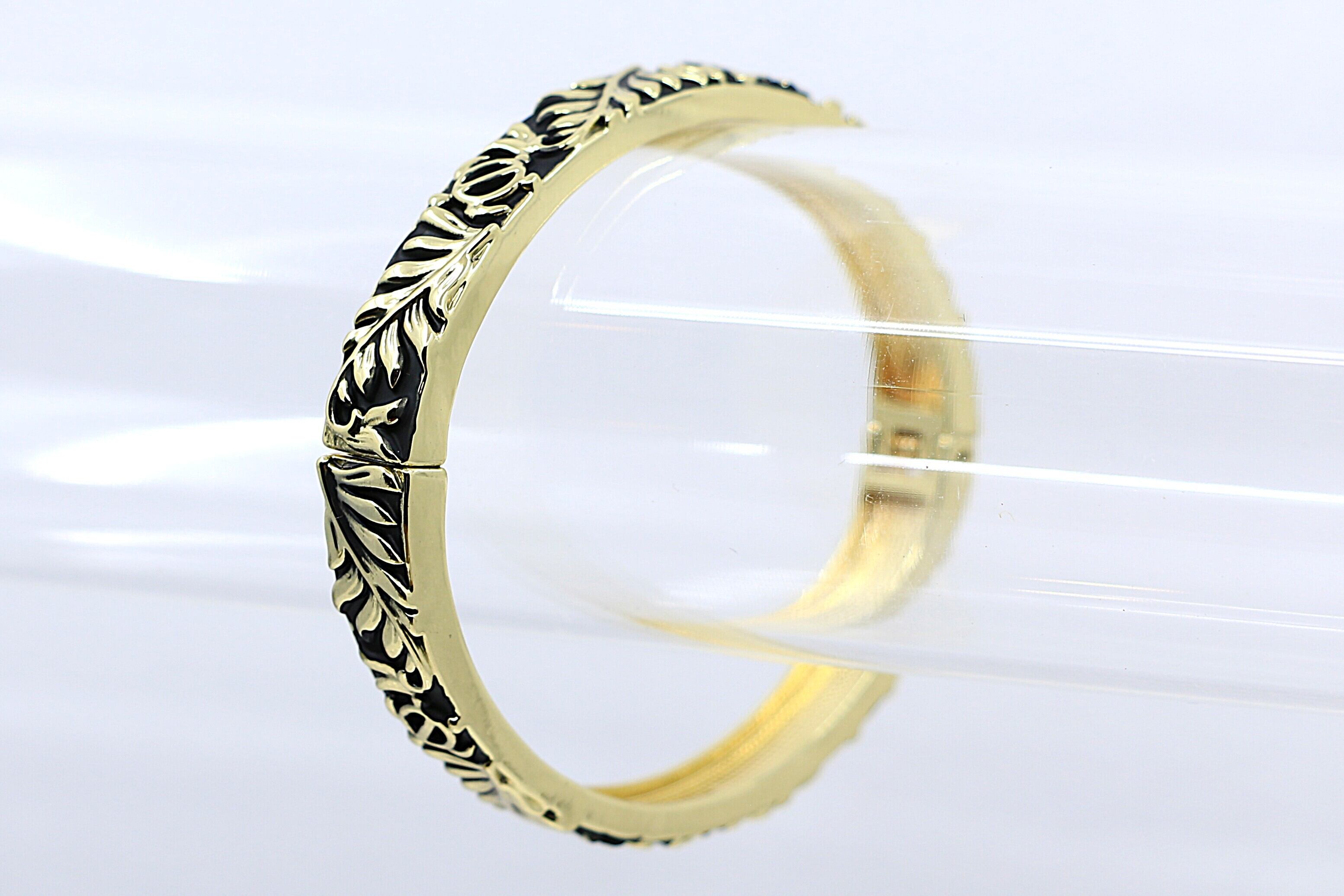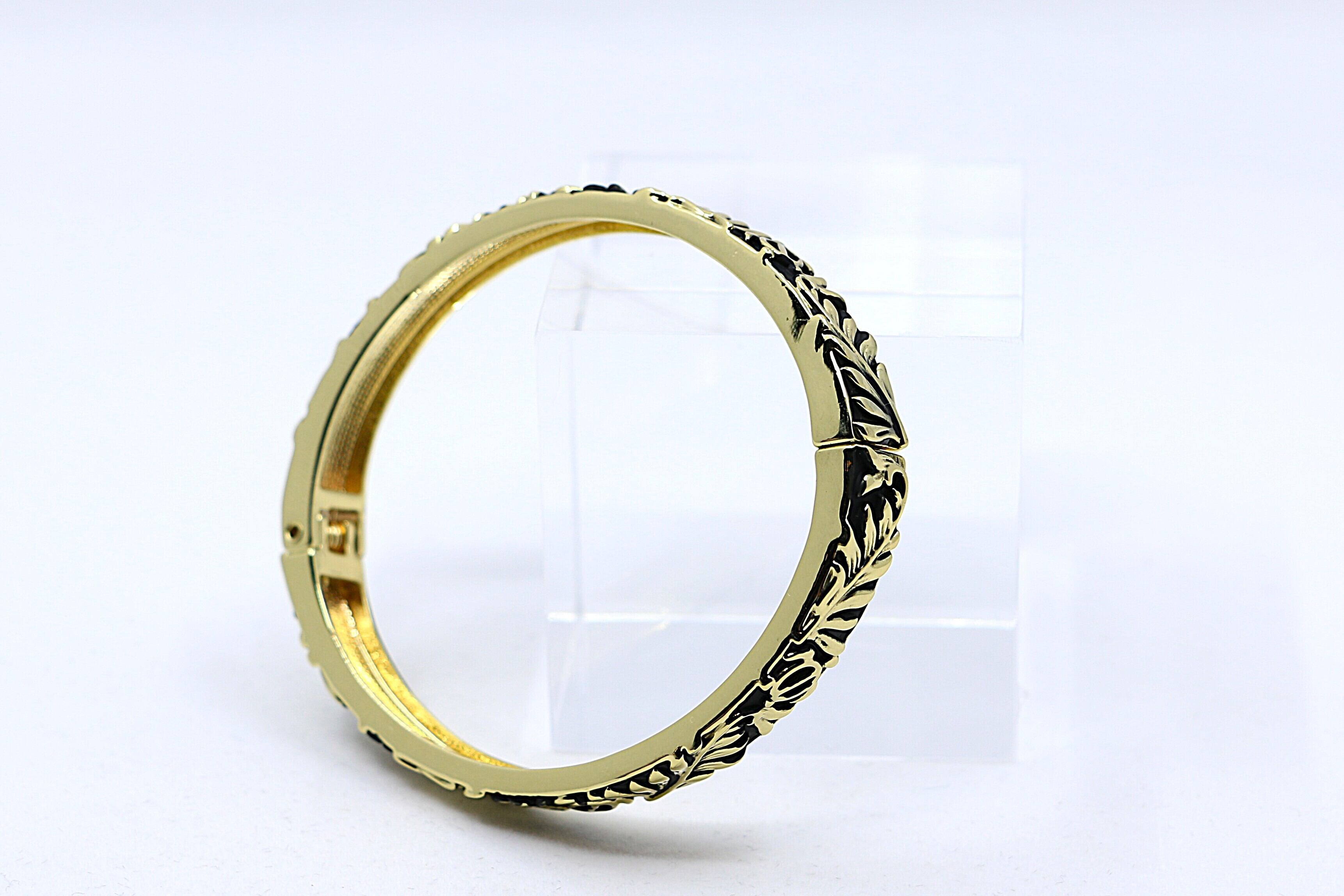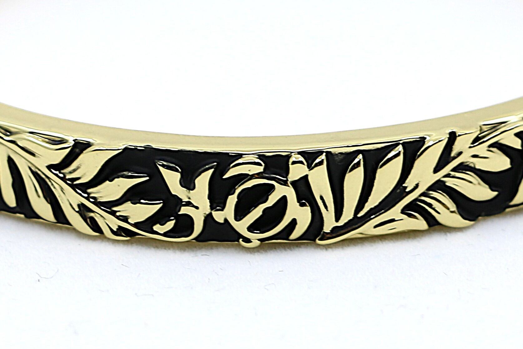 を意味するモチーフとして親しまれています。ブレスレットには繊細な彫刻が施され、手元に自然やハワイアンジュエリーならではの意味合いをプラス。彫刻部分はブラックで彩られ、ゴールドの輝きと美しいコントラストを楽しめます。