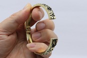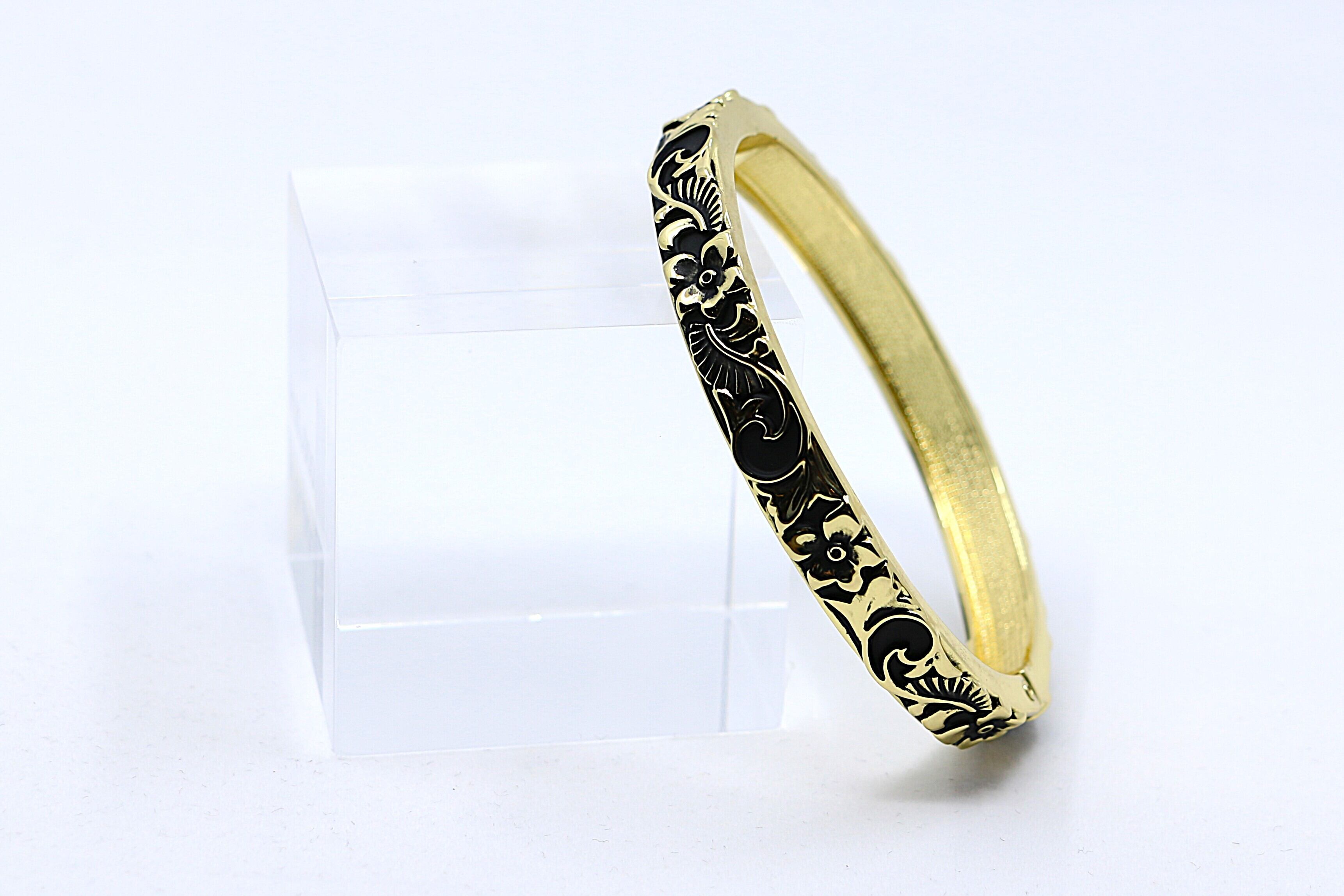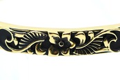 イエローゴールドの温かみとブラックのコントラストが手元を華やかに彩るプルメリア×スクロールバングル。
