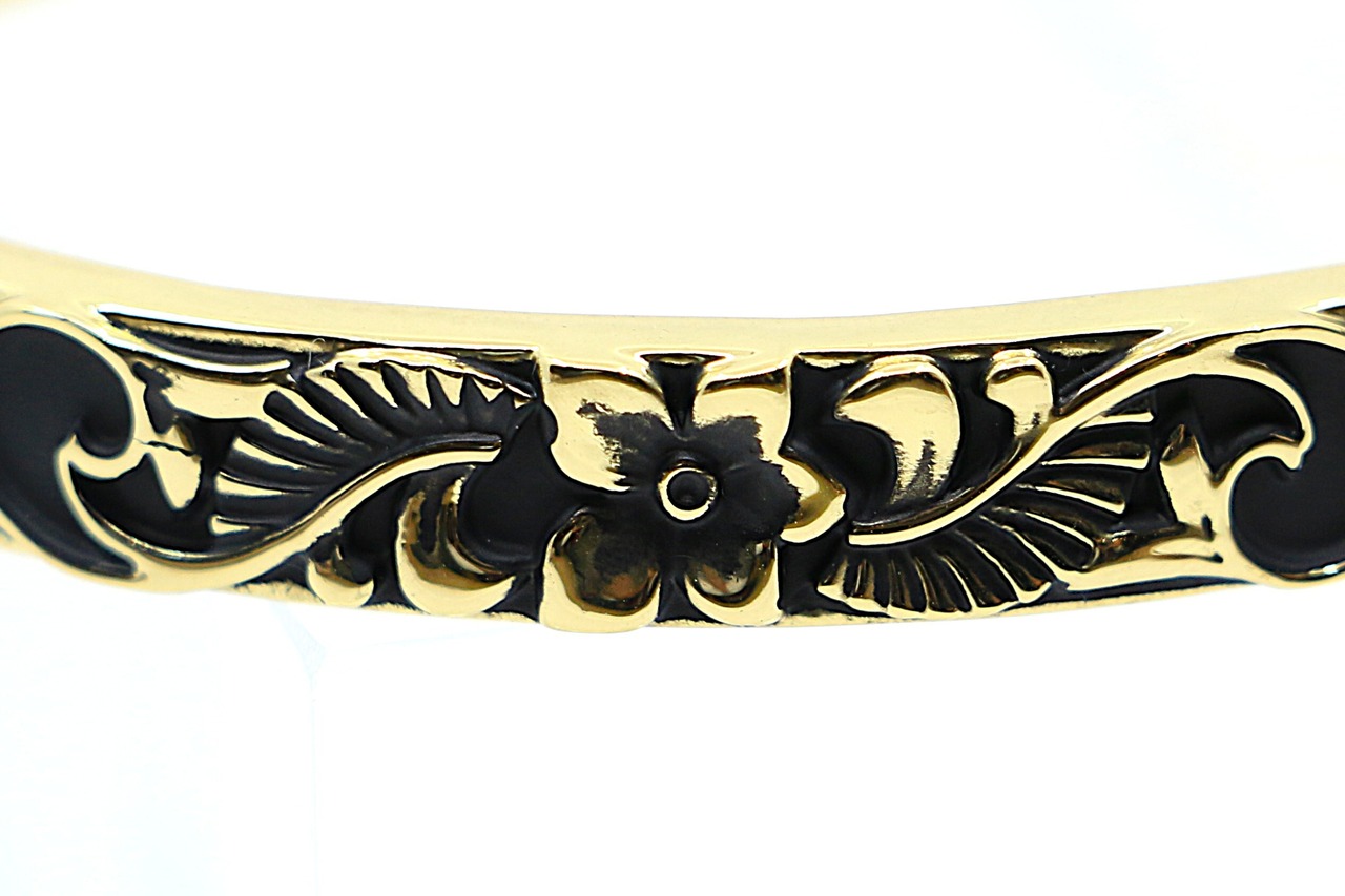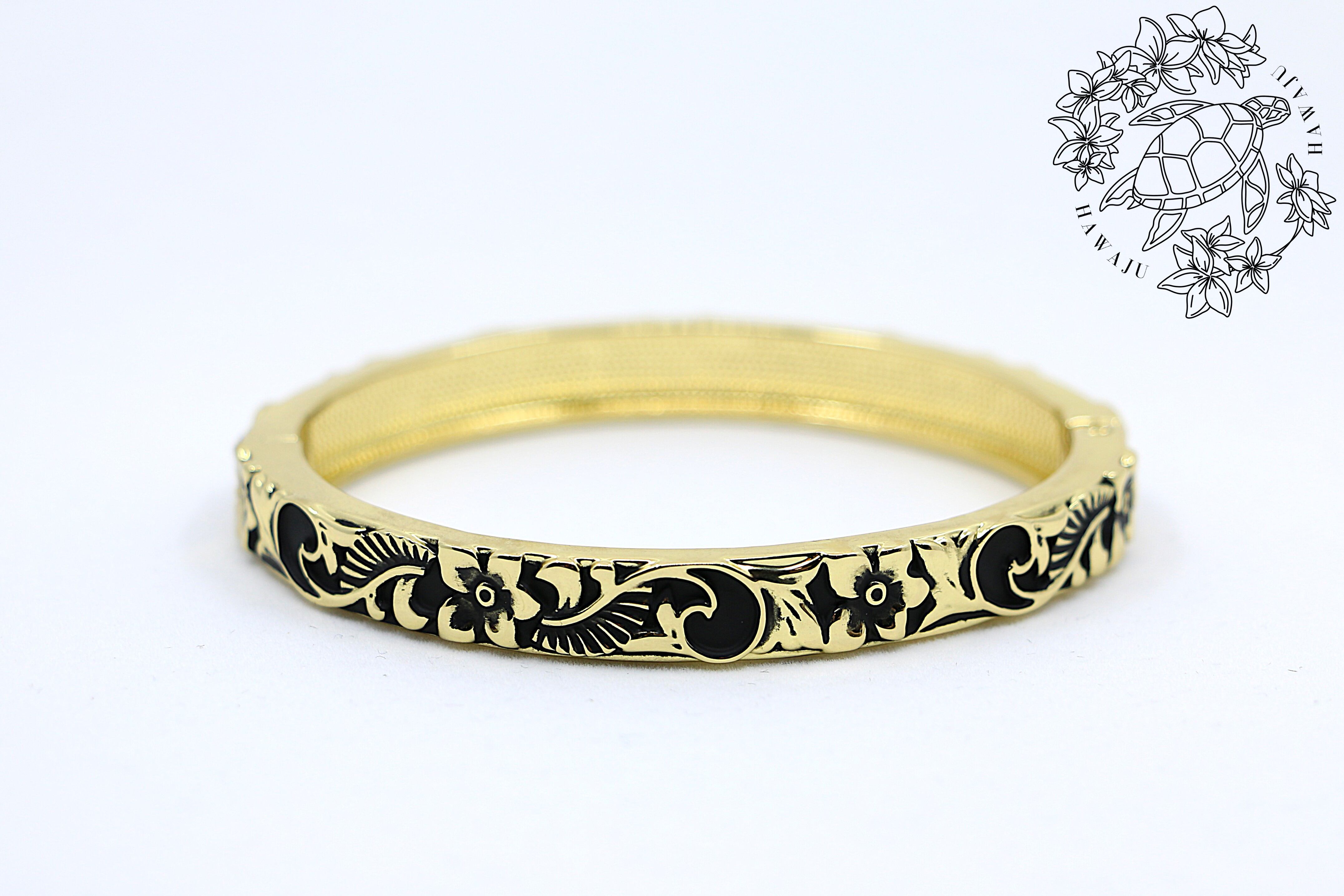 を意味するハワイアンジュエリーならではのモチーフです。ブレスレットには繊細な彫刻が施され、手元に自然やハワイの文化を感じさせる美しいデザインをプラス。彫刻部分はブラックで彩られ、イエローゴールドの輝きとコントラストが際立ちます。