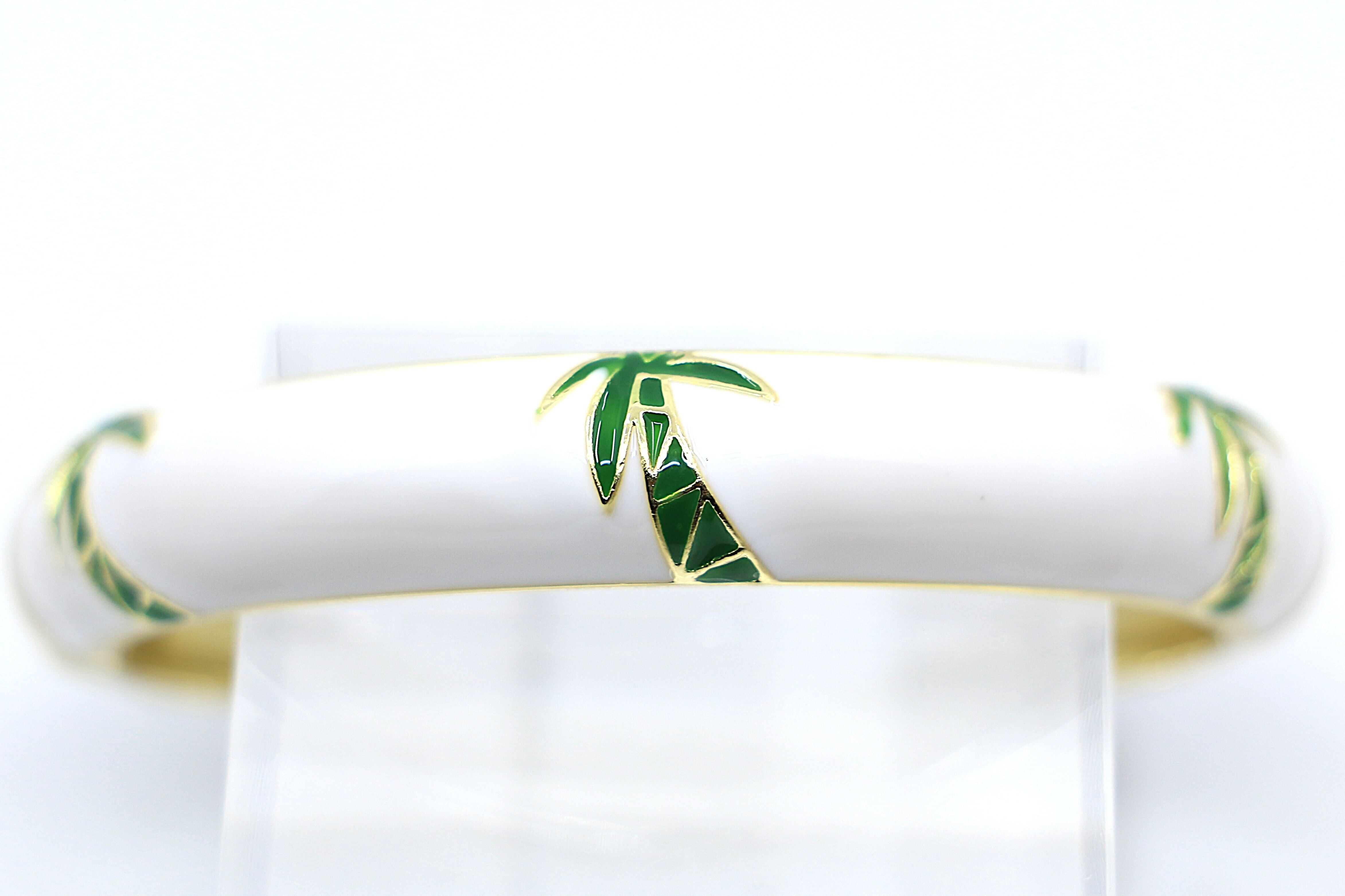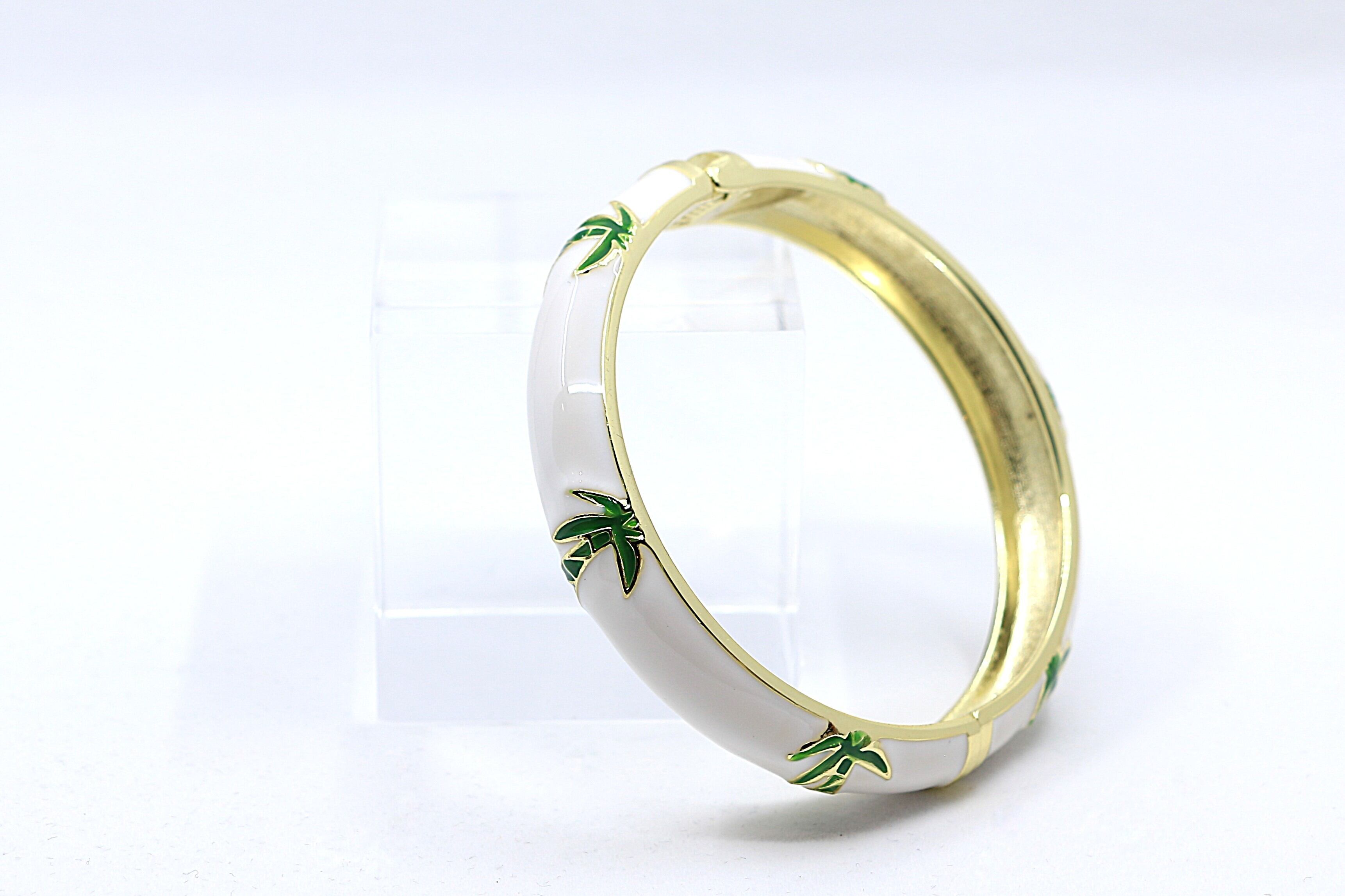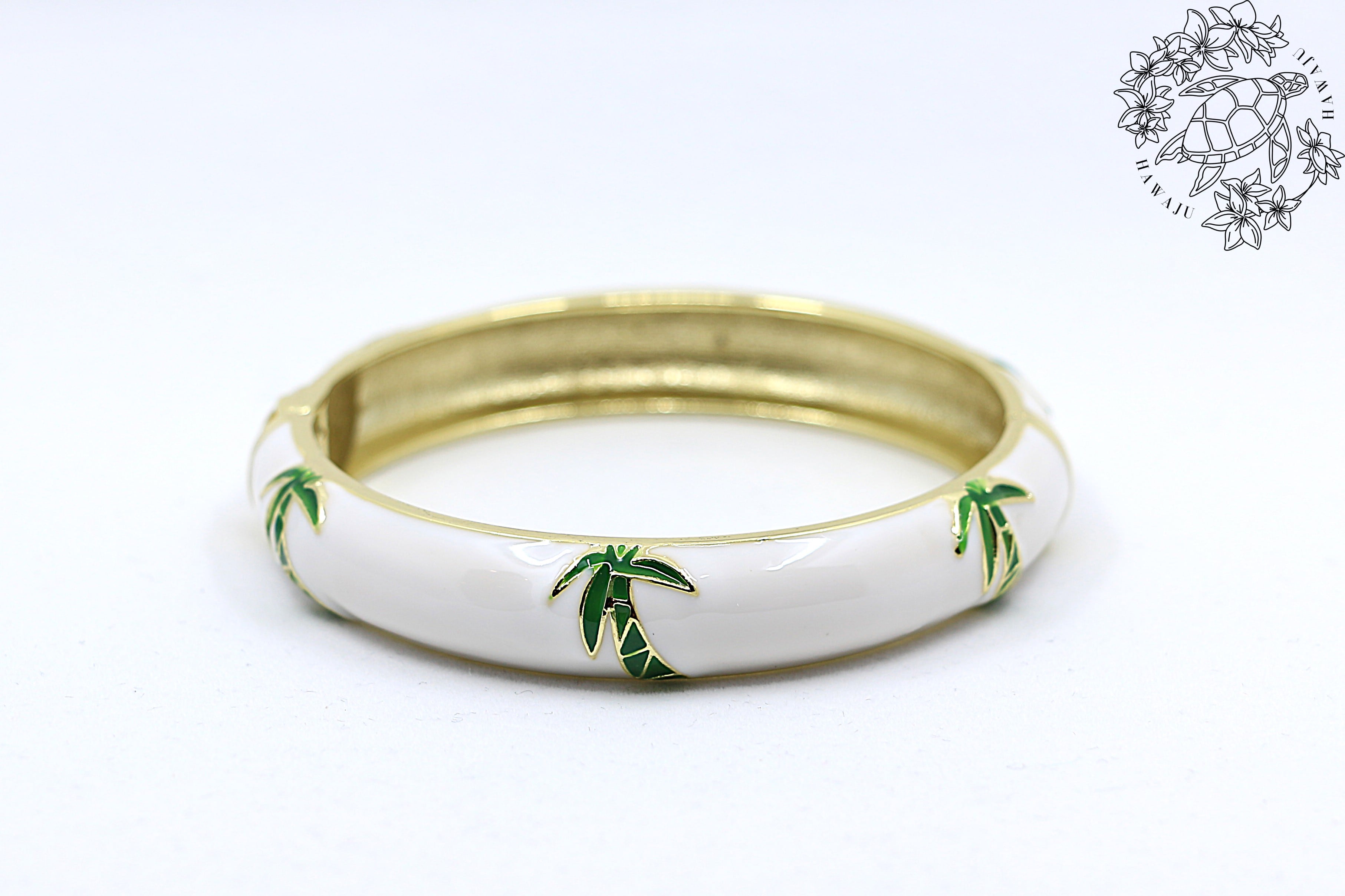 ハワイや南国の風景を象徴する ヤシ(パーム)モチーフ をデザインに取り入れた、美しいバングルです。合金素材にゴールドカラーのコーティングを施し、カラフルなエナメルの上に広がるヤシのデザインが、手元に南国らしい開放感とリゾートムードを添えます。