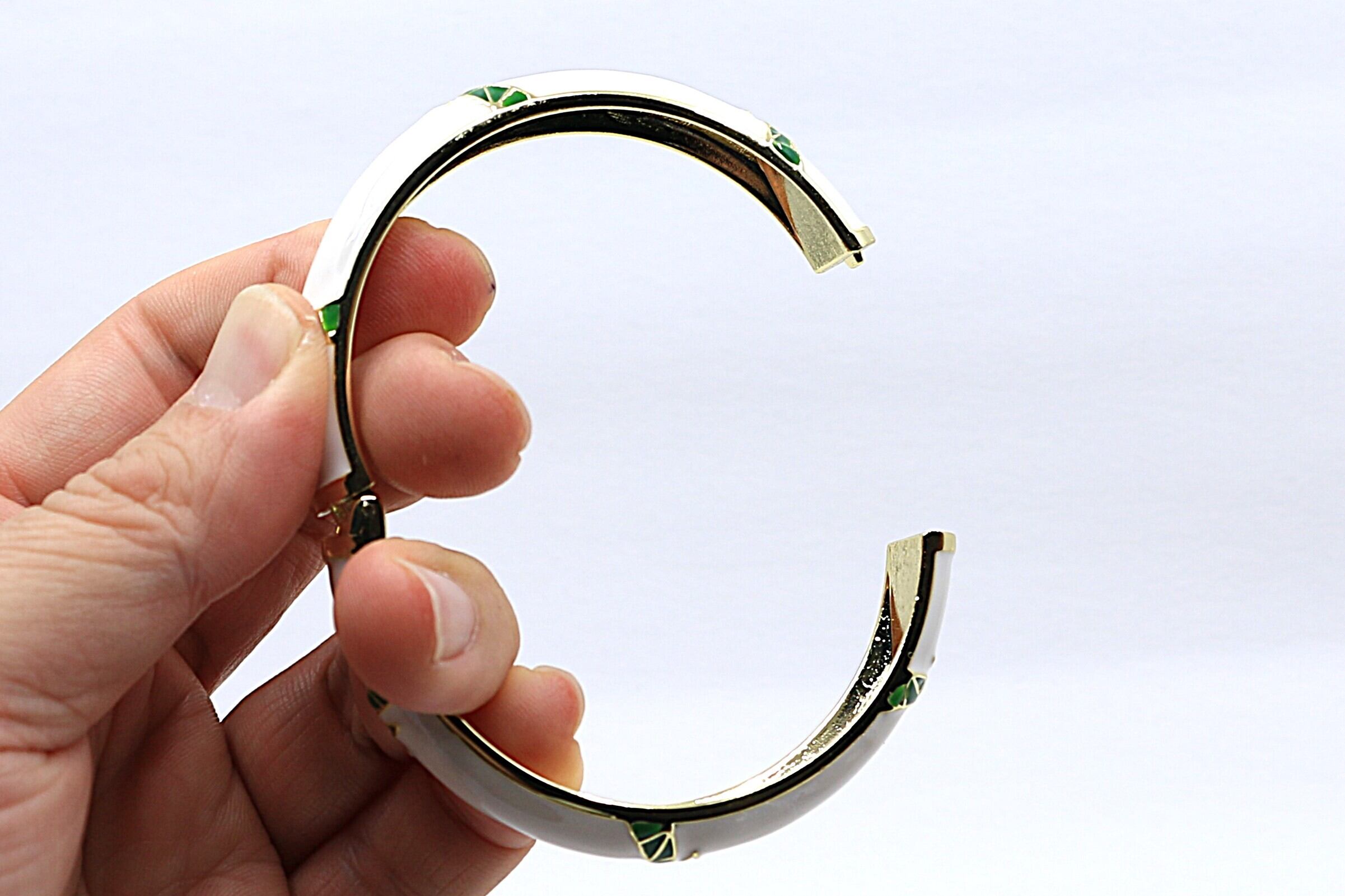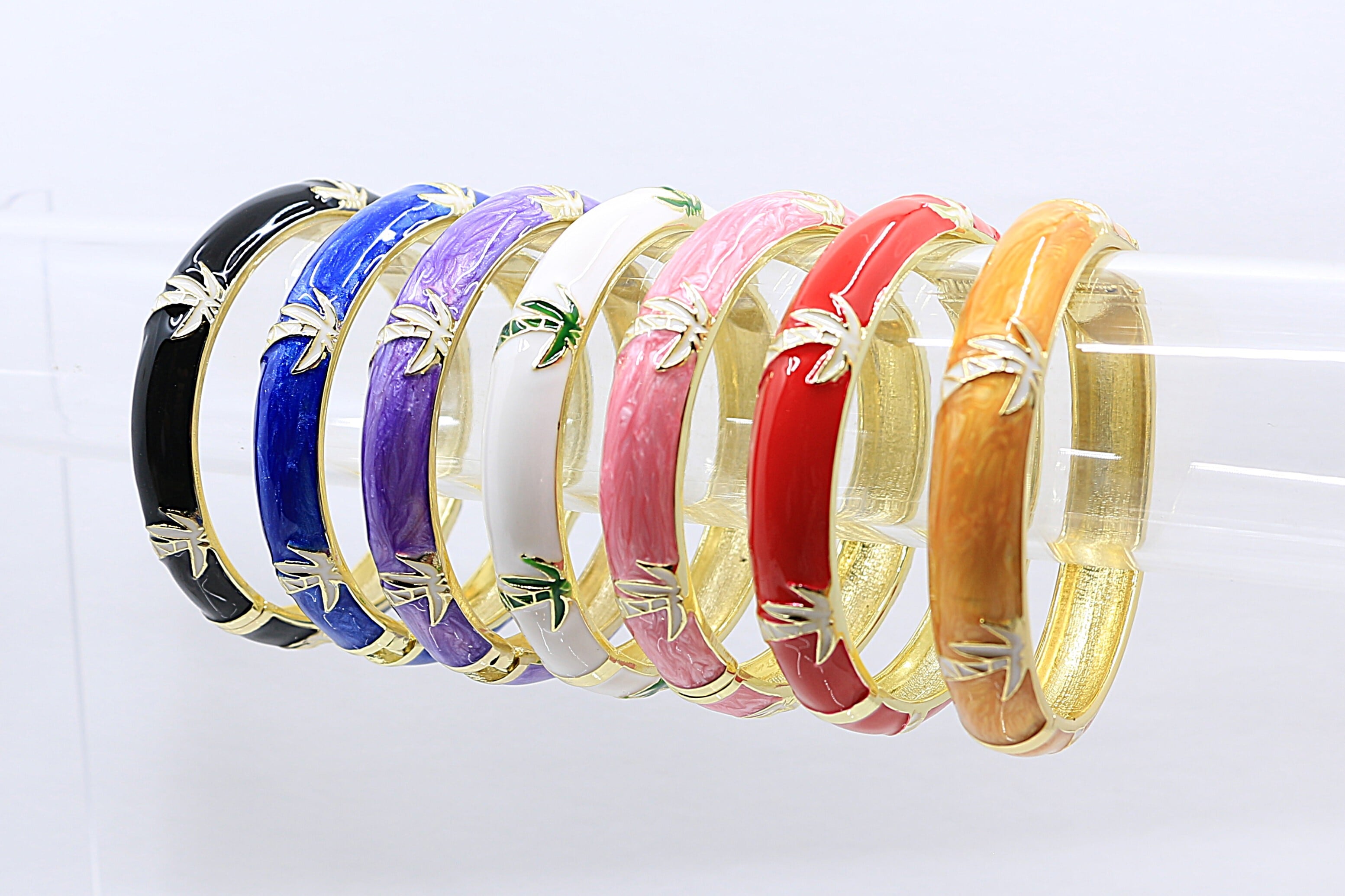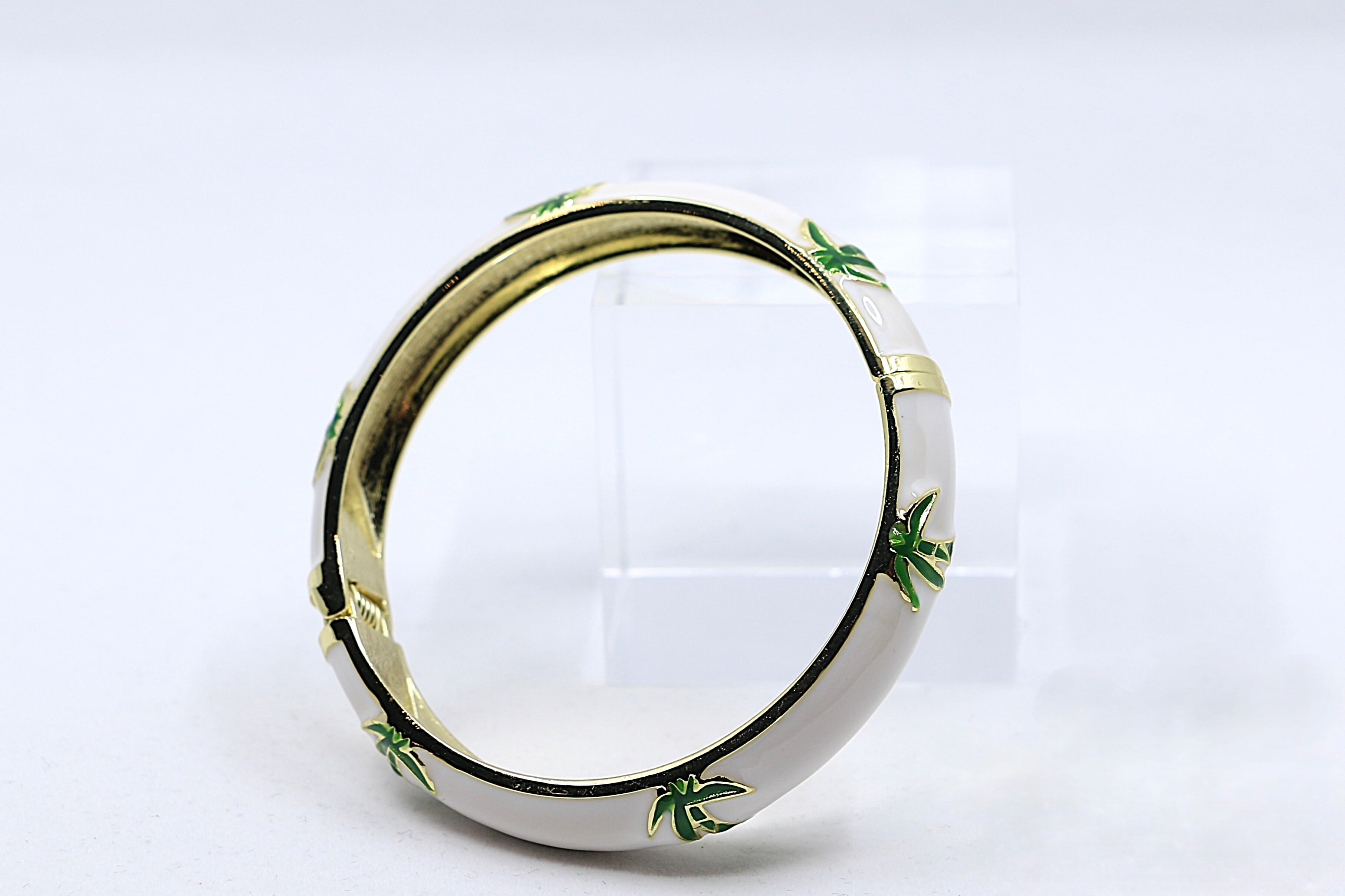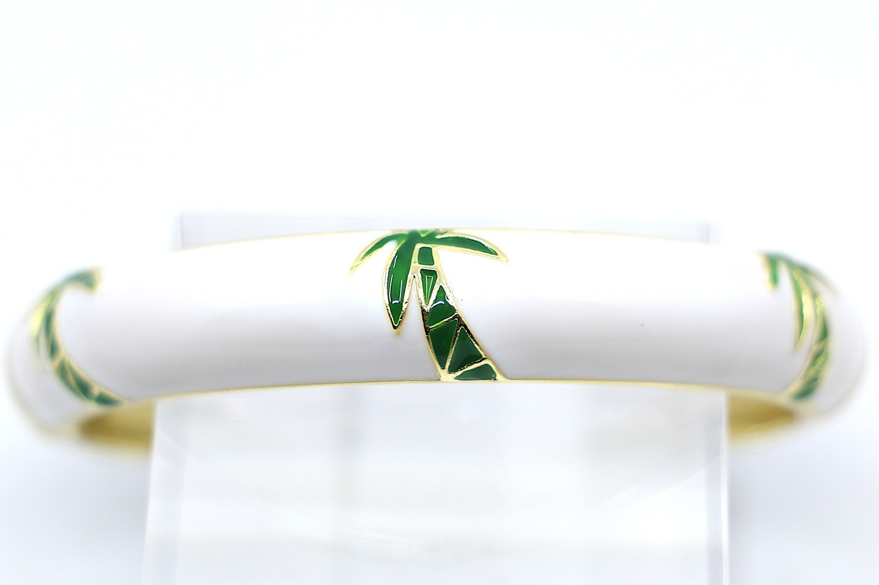 ハワイや南国の風景を象徴する ヤシ(パーム)モチーフ をデザインに取り入れた、美しいバングルです。合金素材にゴールドカラーのコーティングを施し、カラフルなエナメルの上に広がるヤシのデザインが、手元に南国らしい開放感とリゾートムードを添えます。