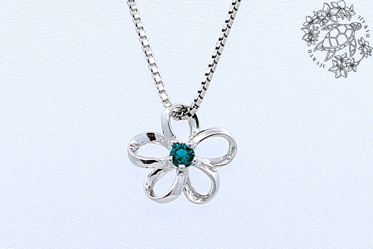 美しいプルメリアデザインが輝くペンダントトップです。中央にあしらわれたグリーンスワロフスキーが、光を受けて鮮やかにきらめき、爽やかで上品な印象を放ちます。スターリングシルバーを使用したこのアイテムは、しっかりとした存在感と高級感を兼ね備え、カジュアルからフォーマルまで幅広いスタイルで活躍する特別なアクセサリーです。