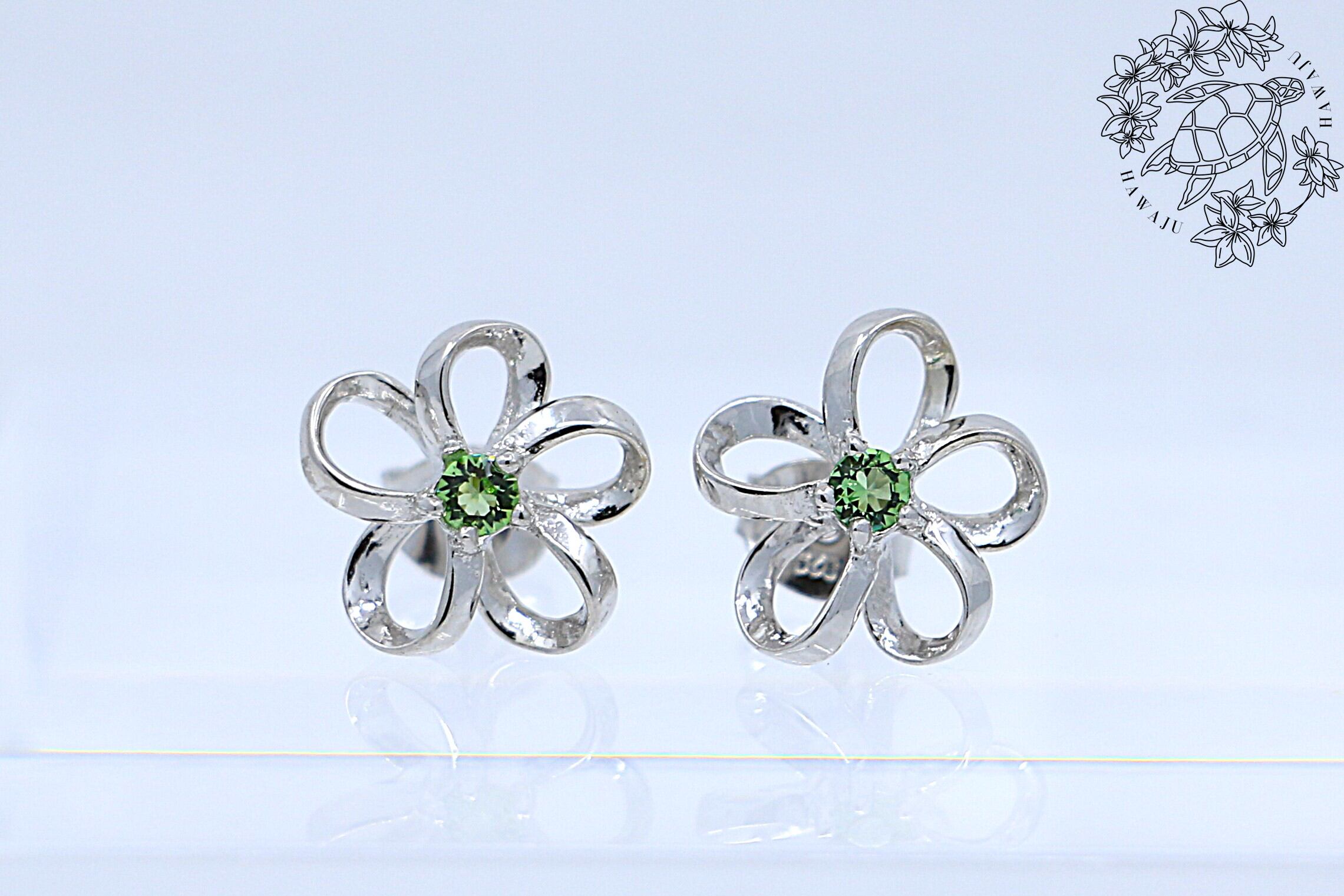 プルメリアデザインの美しいピアスは、中央に輝くライトグリーンスワロフスキーが特徴です。シルバーの魅力を引き立てるこのハワイアンジュエリーは、洗練されたデザインで日常のコーディネートに華やかさを添えます。リゾートスタイルにもぴったりなこのピアスは、シンプルながらも存在感があります。