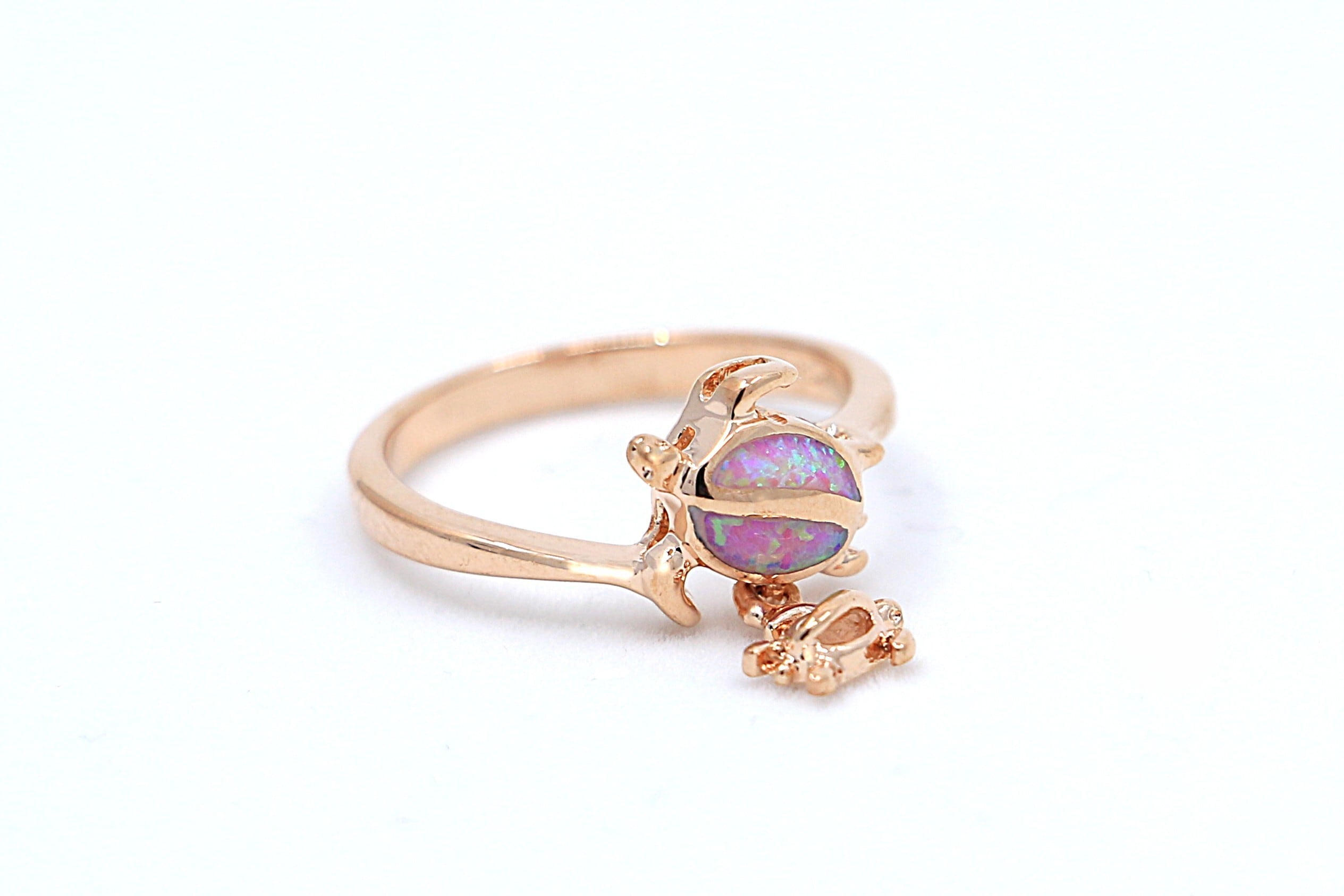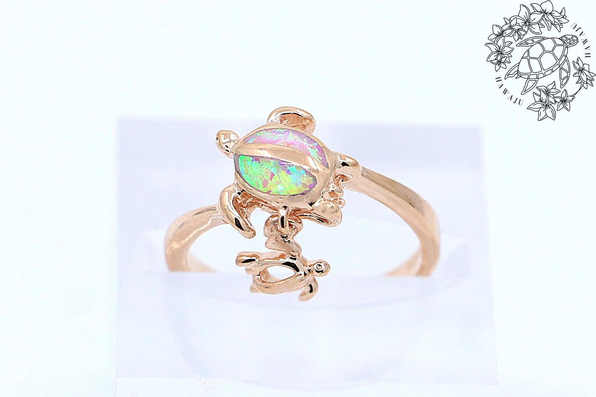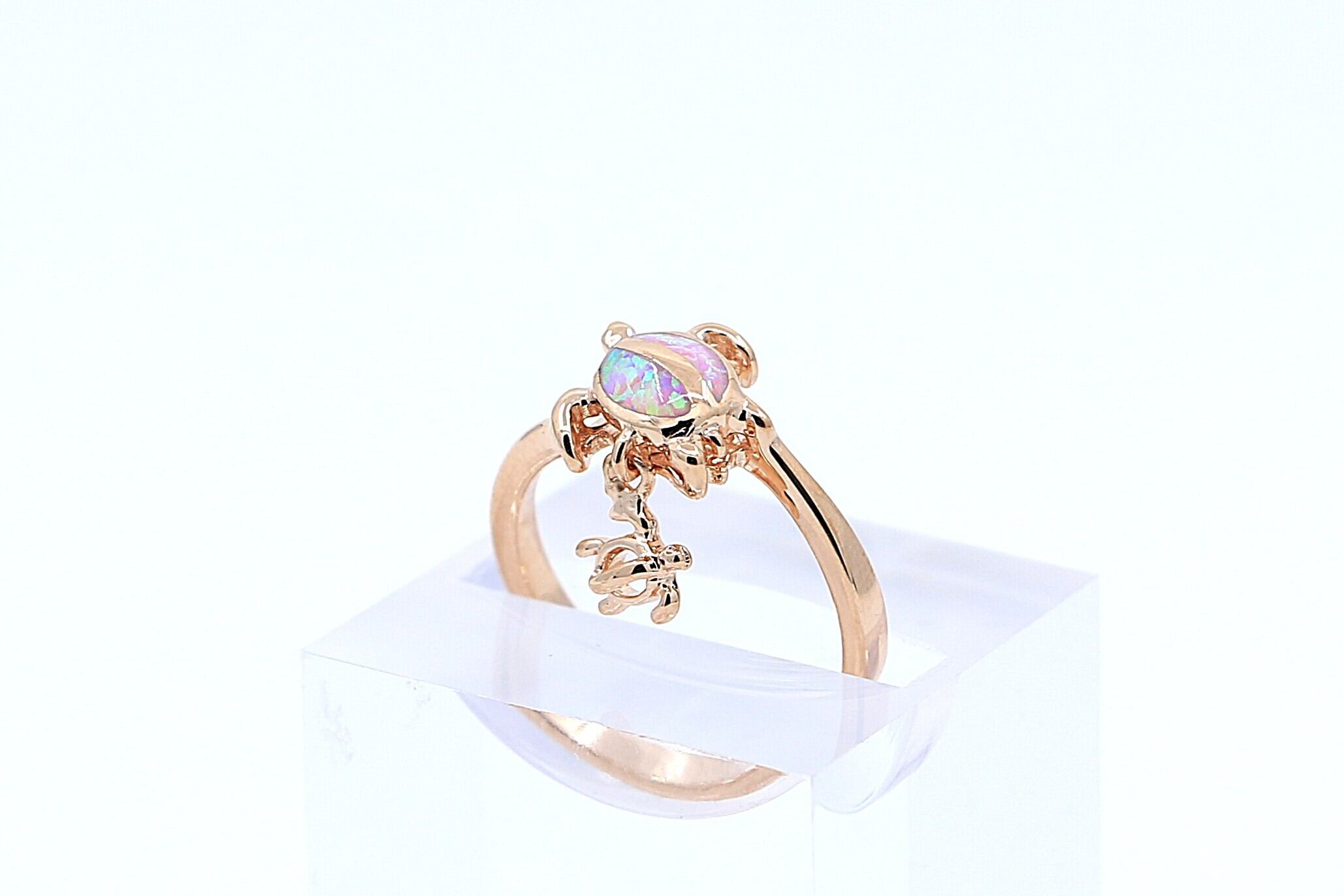 ホヌはハワイで「幸運」「長寿」「守護」を象徴する縁起の良いモチーフです。このリングでは海亀の甲羅部分にピンクオパールをセットし、立体的な造形で甲羅の形を活かしています。小さなホヌのチャームがつながった2連デザインで、動きのある可愛らしいアクセントになっています。ハワイの文化を感じながら、身に着けるたびに幸運と守護を実感できるデザインです。