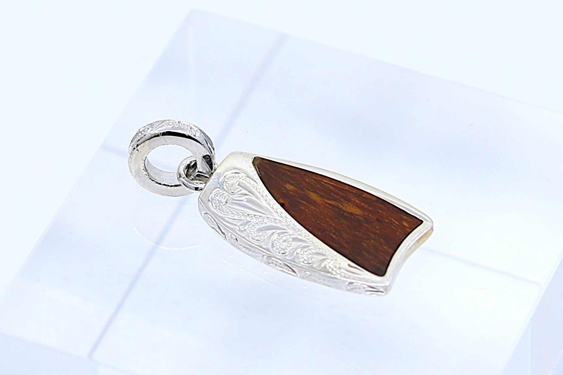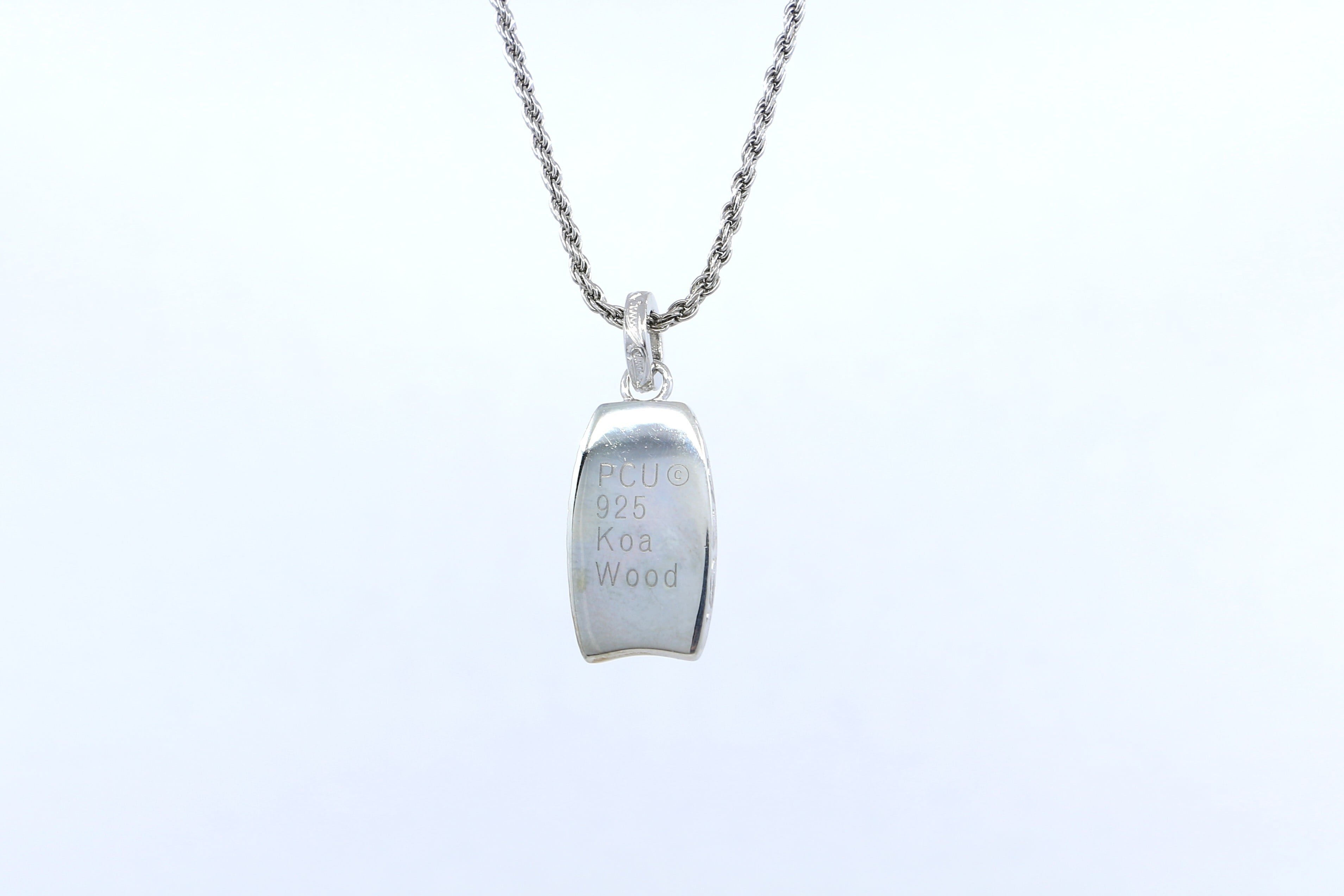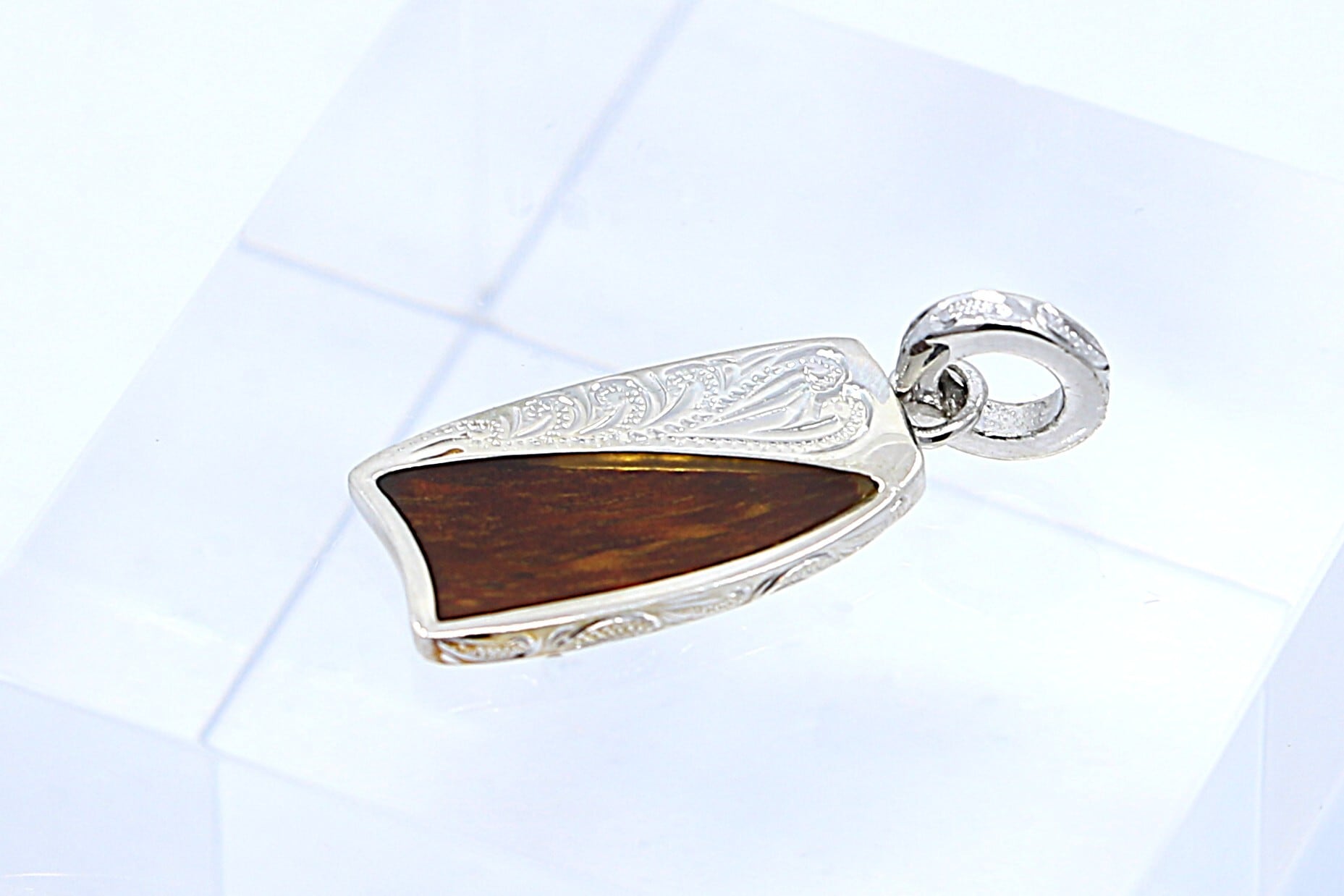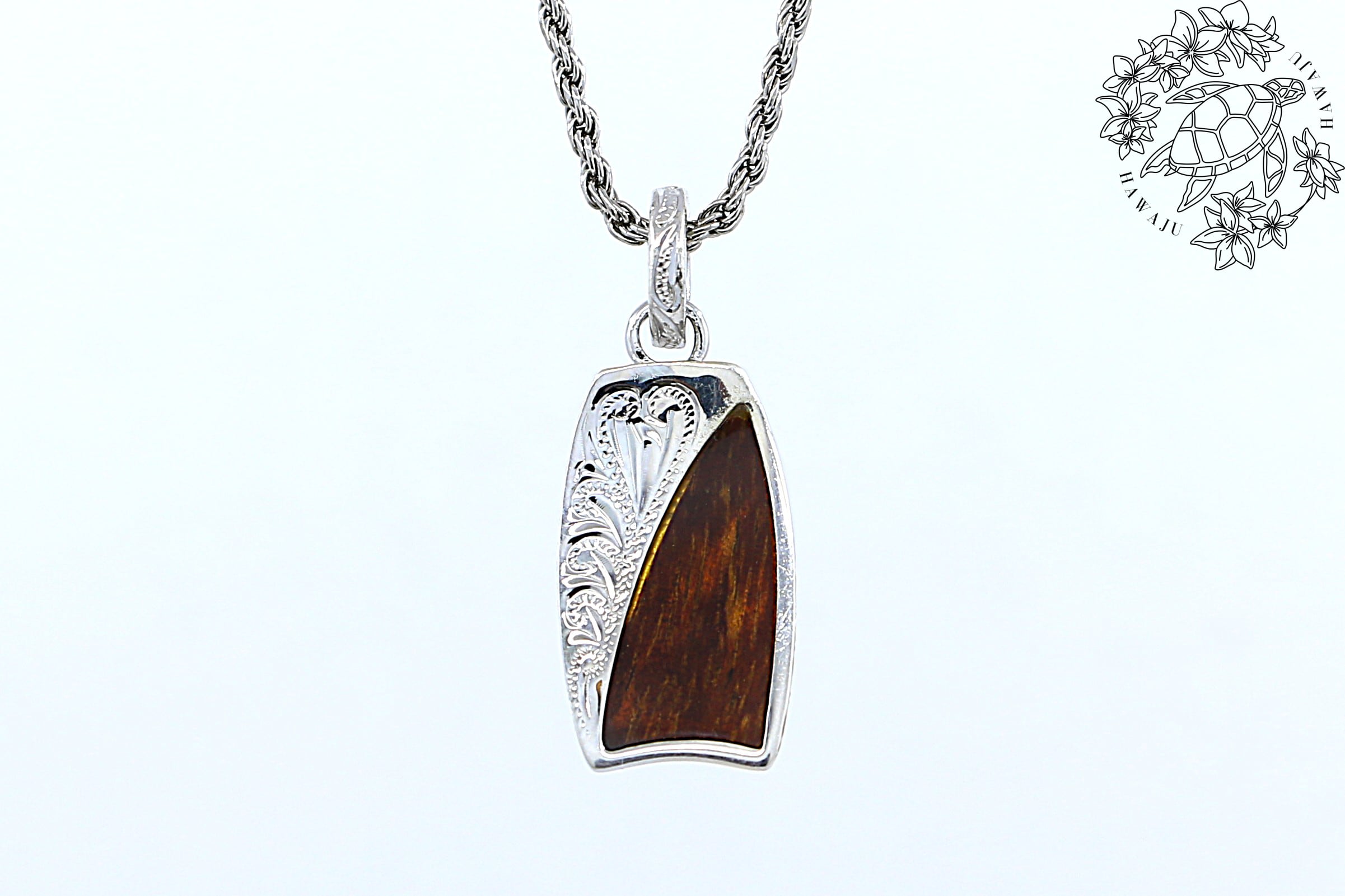 このボディボードデザインのペンダントトップは、ハワイの海文化を象徴するユニークなアクセサリーです。片側にはハワイ固有のコアウッドをはめ込み、もう片側にはハワイアンジュエリー特有のスクロール(波)模様を彫刻。シルバーの洗練された輝きとコアウッドの自然美が調和し、海と自然のエネルギーを感じられる上品な仕上がりです。サーフィンや海を愛する方へのギフトとしても最適なアイテムです。