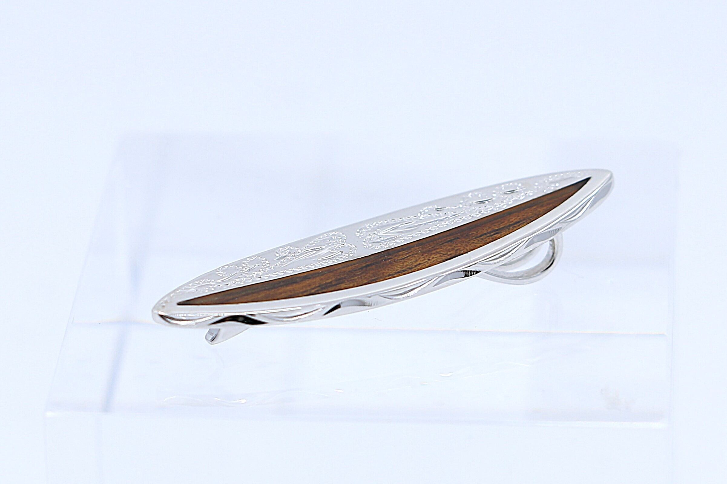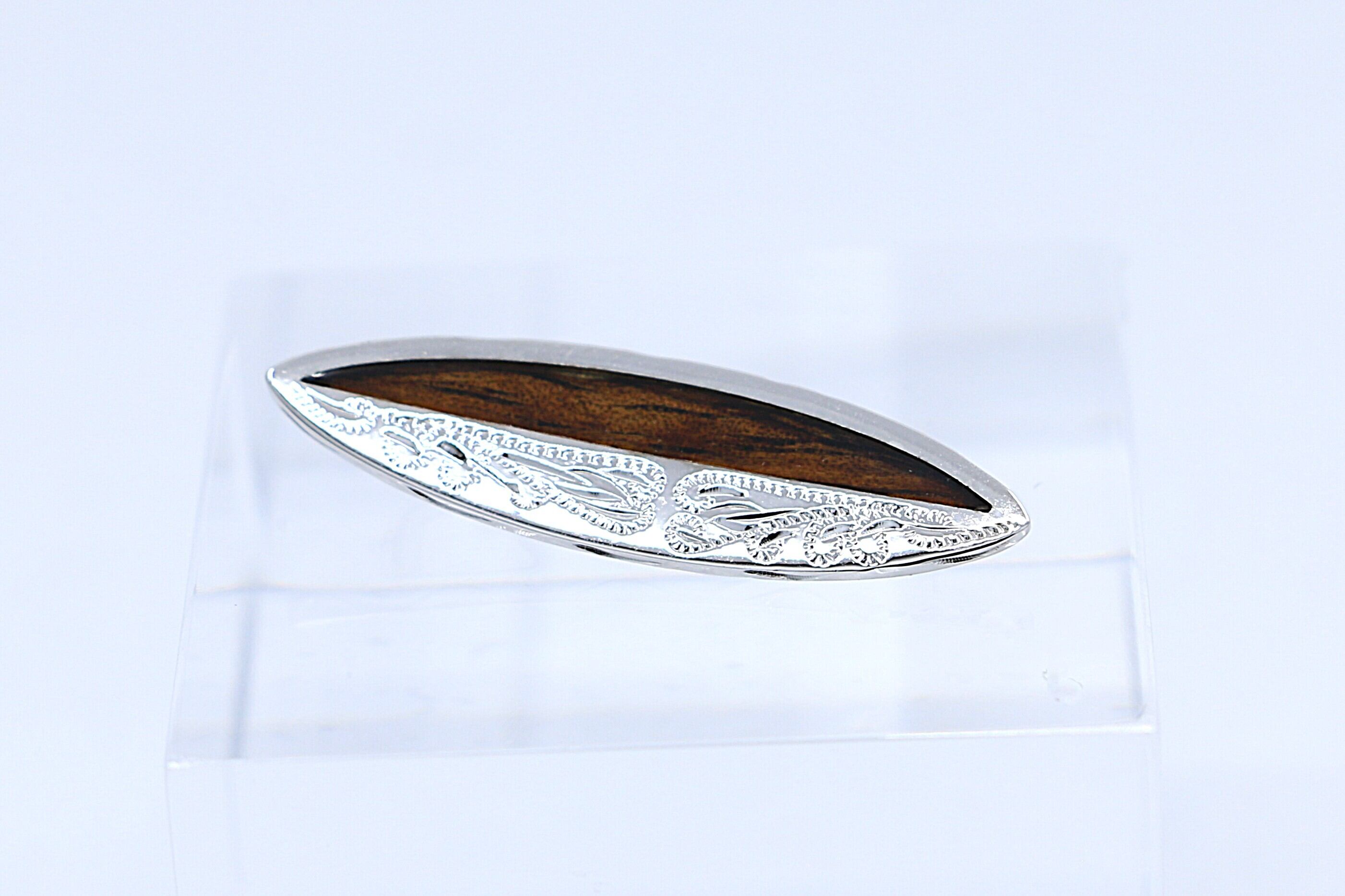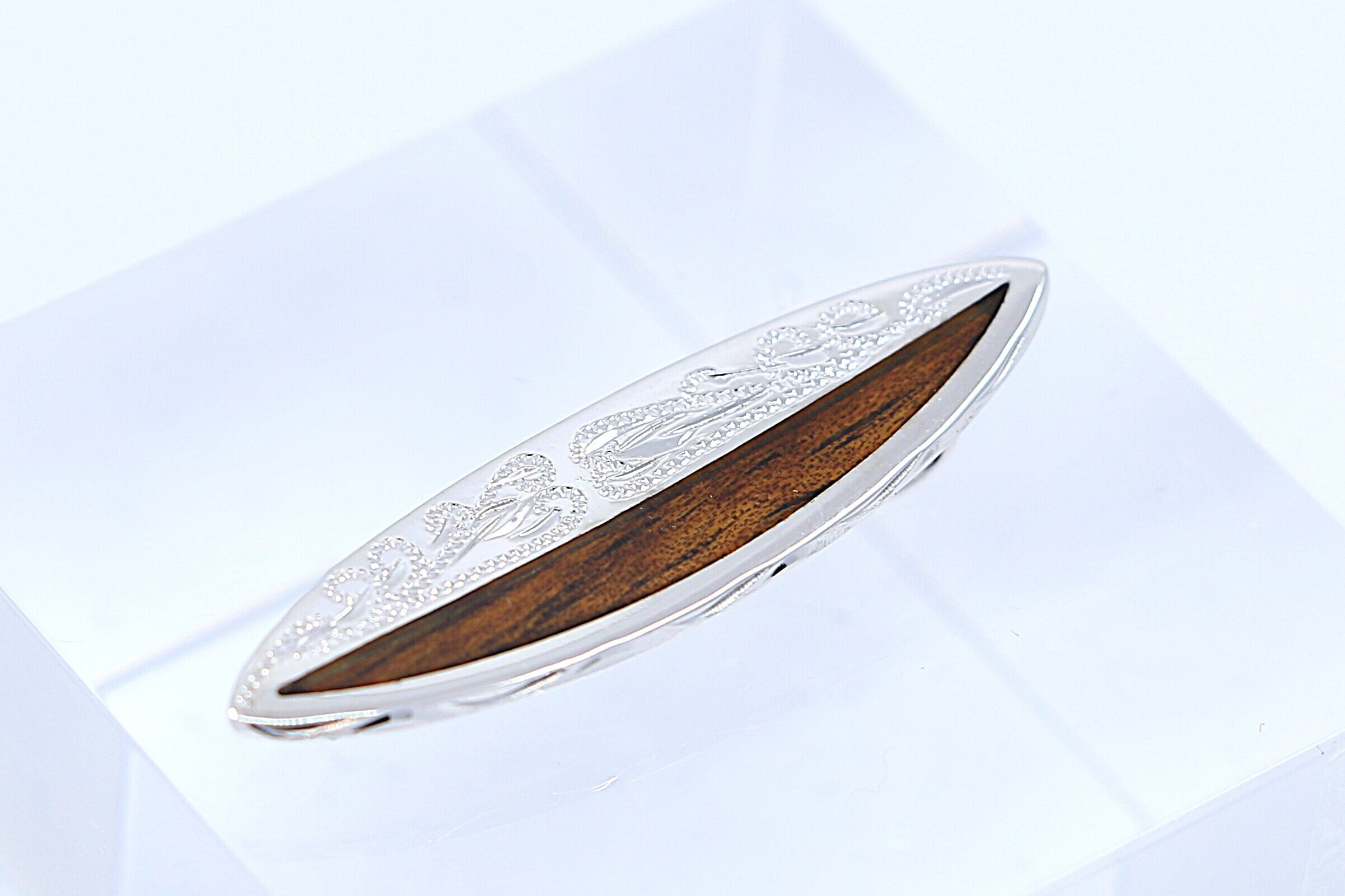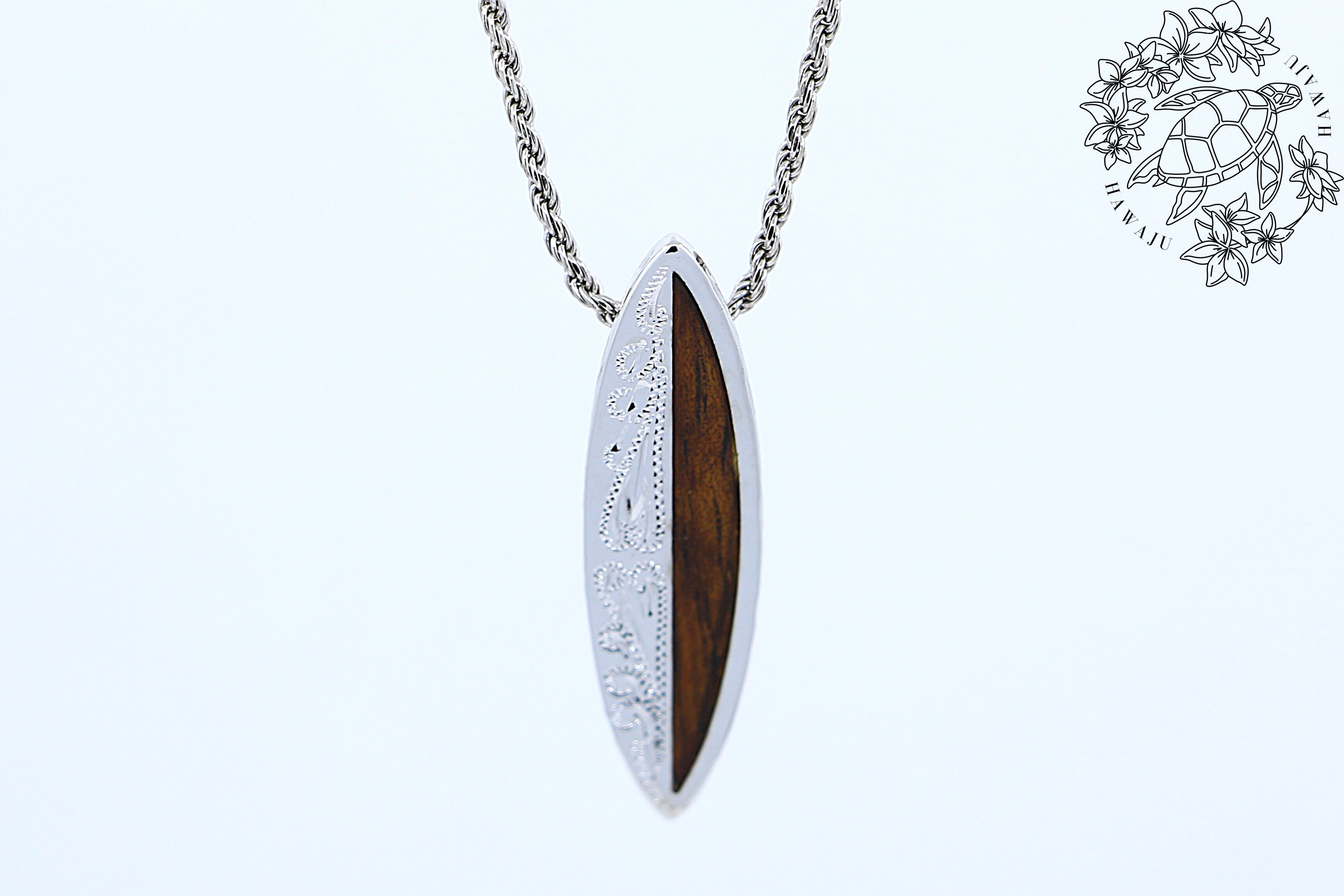 このサーフボードデザインのペンダントトップは、ハワイの海文化を象徴するユニークなアクセサリーです。片側にはハワイ固有のコアウッドをはめ込み、もう片側にはハワイアンジュエリー特有のスクロール(波)模様を彫刻。シルバーの洗練された輝きとコアウッドの自然美が調和し、海と自然のエネルギーを感じられる上品な仕上がりです。サーフィンや海を愛する方へのギフトとしても最適なアイテムです。