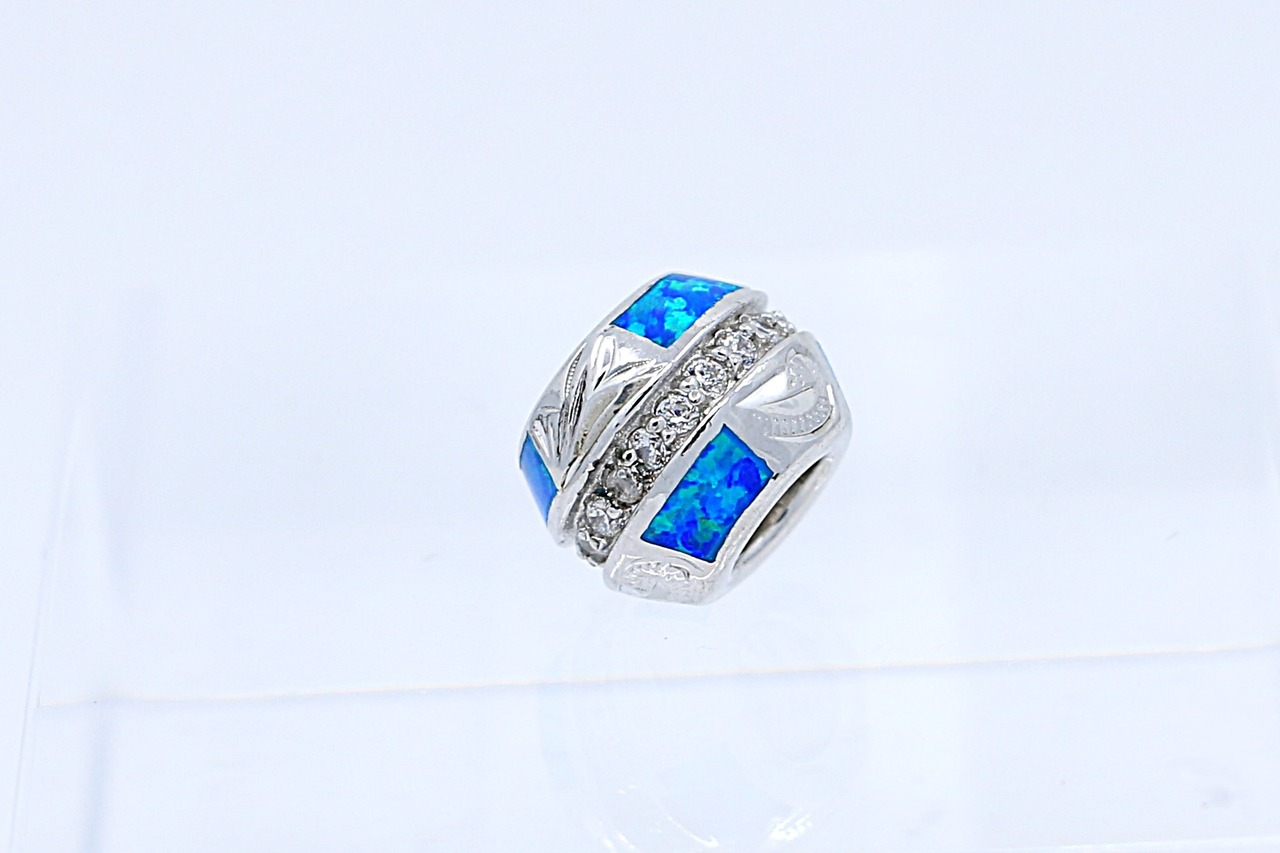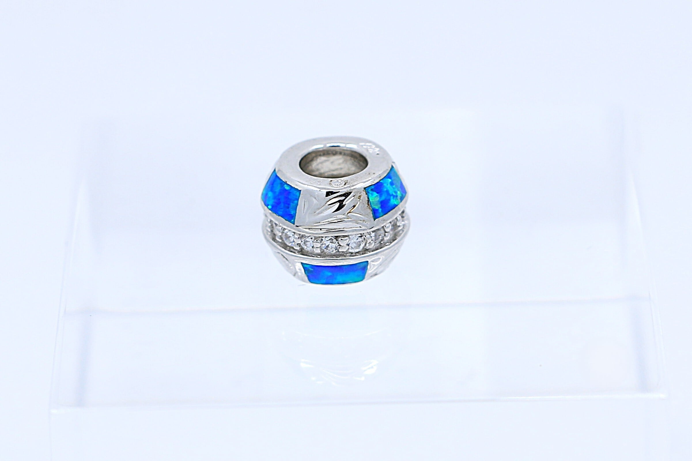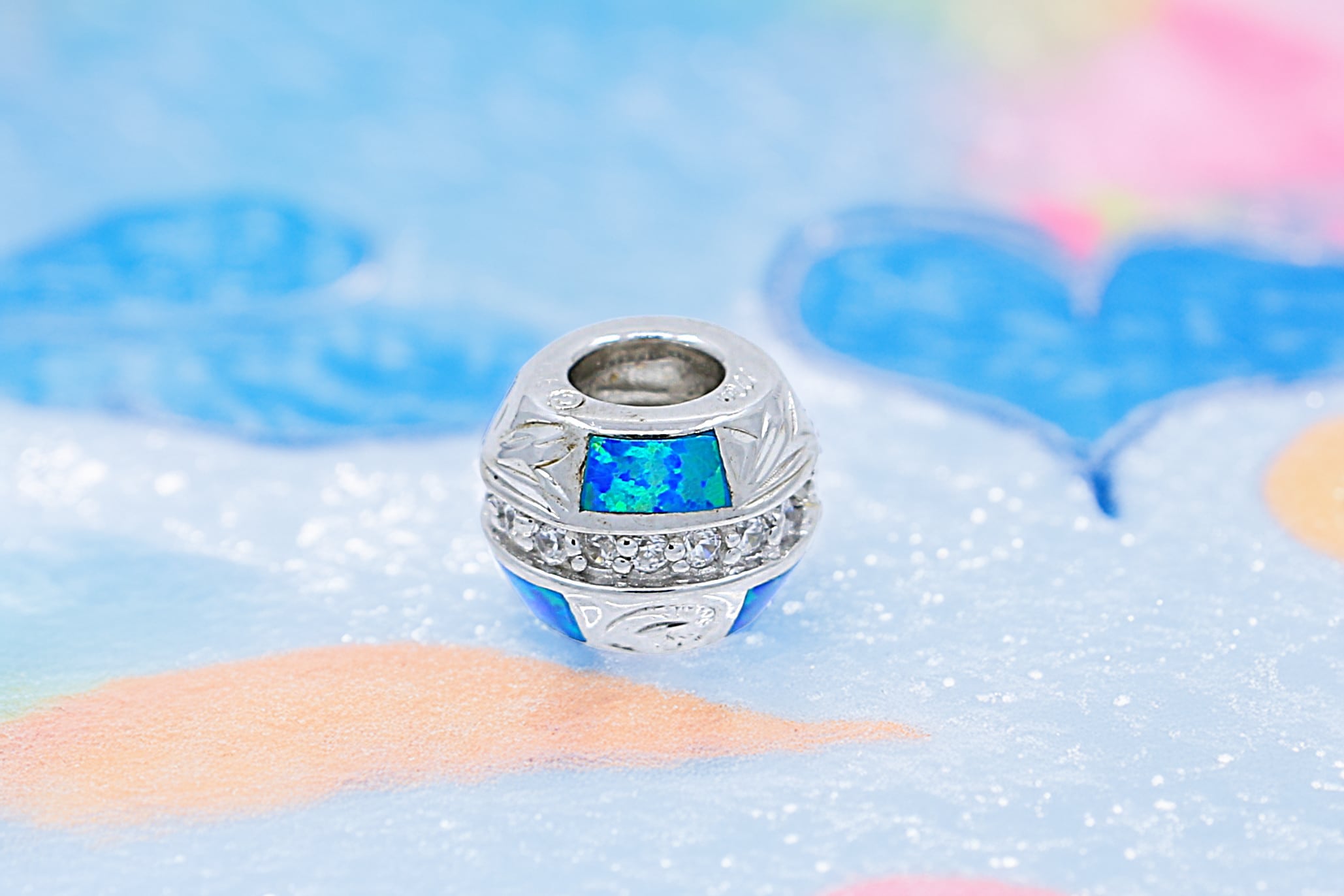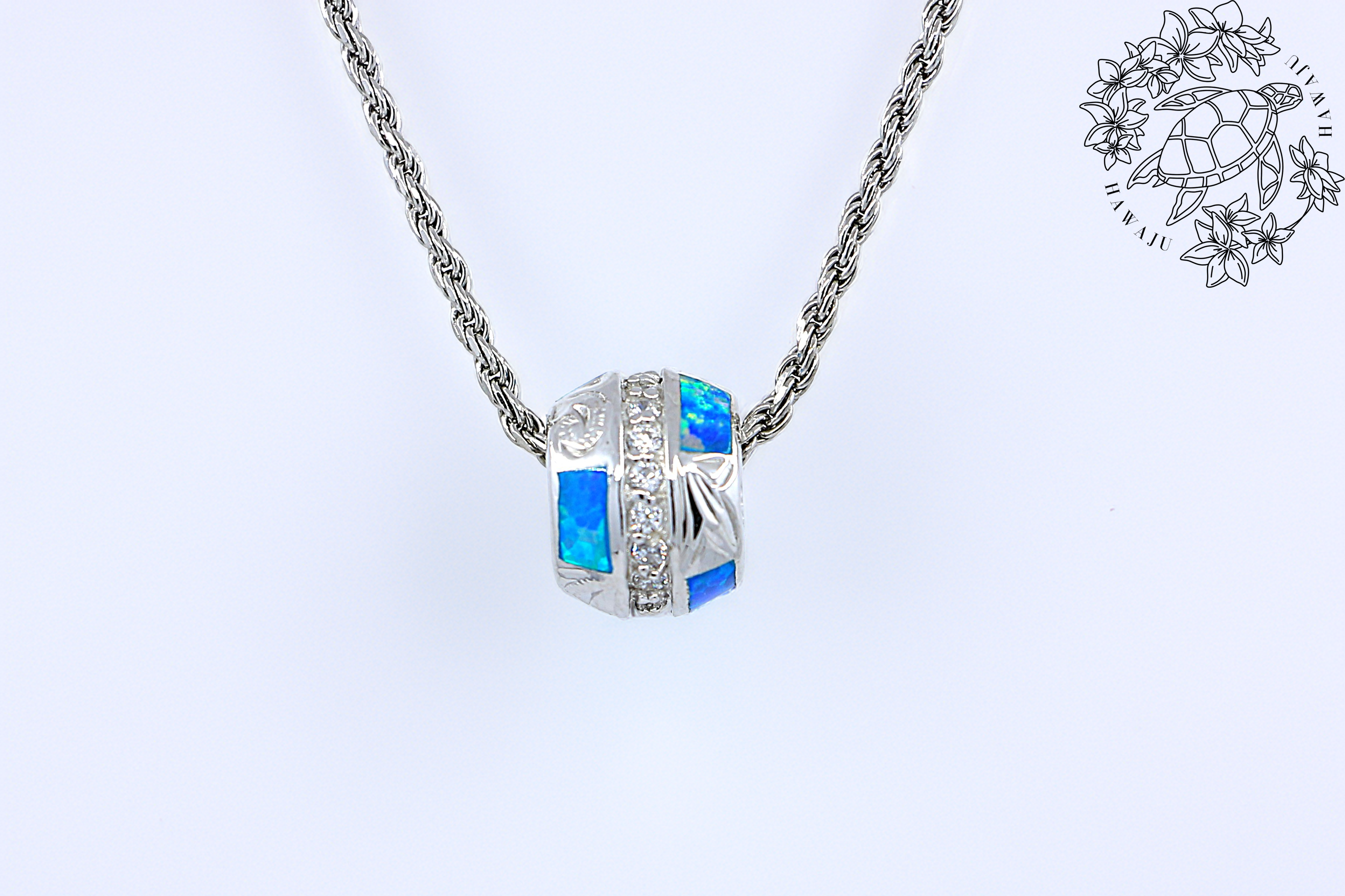 海を思わせるブルーオパールと輝くジルコニア、ハワイアンジュエリーらしいスクロール模様を組み合わせたバレル型ペンダントトップは、日常に上品で華やかなアクセントを添える特別な一品です。