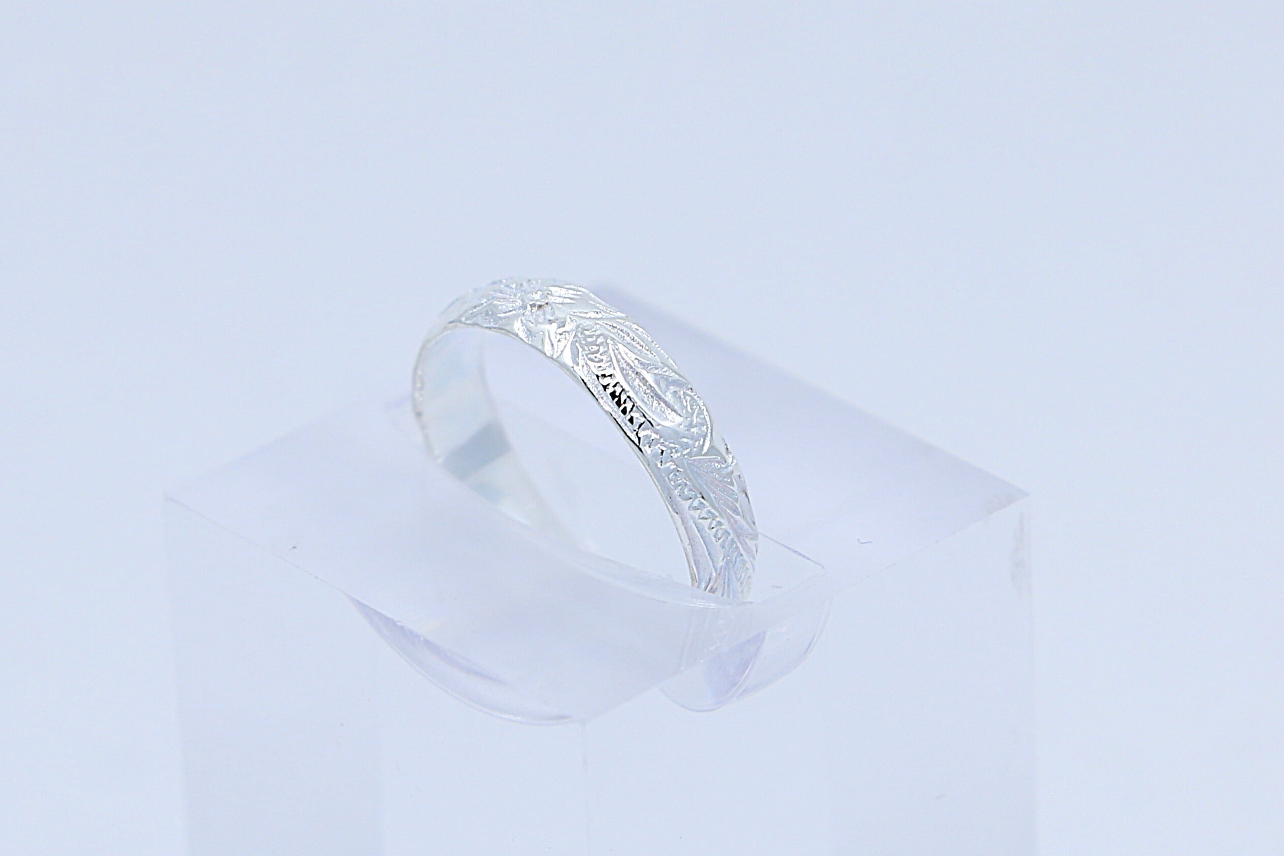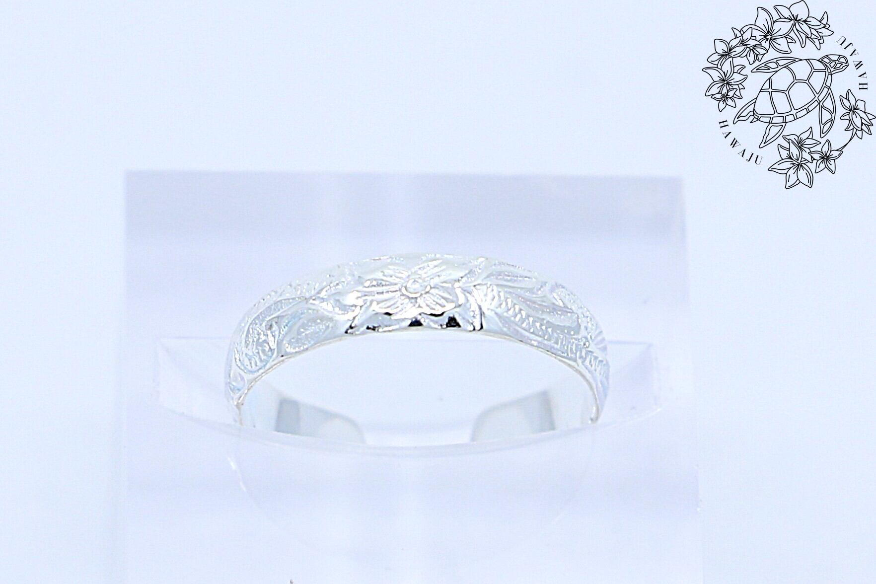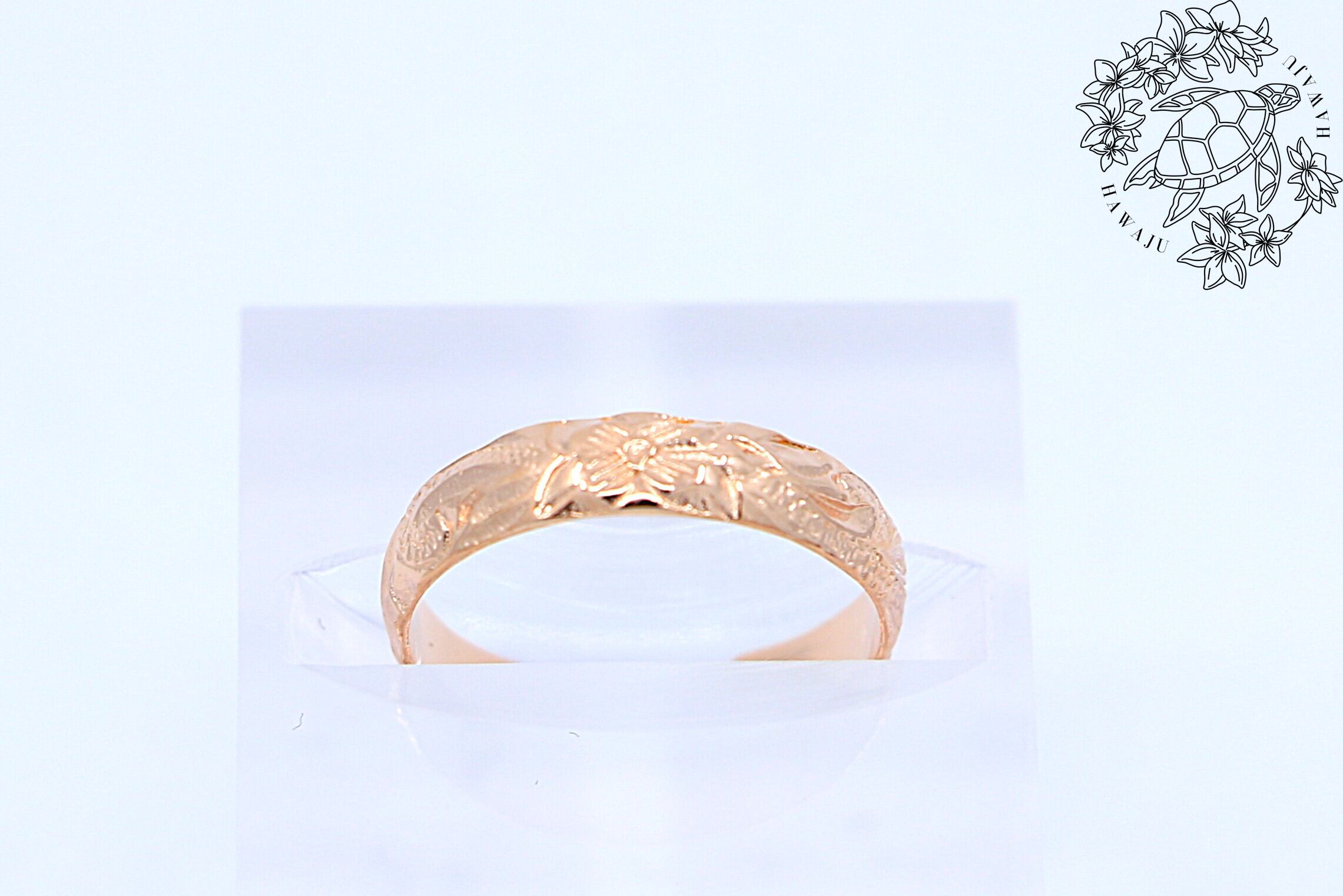 リングの表面にはハワイアンジュエリー特有の彫刻模様を施し、意味を込めたモチーフが足元で輝きます。