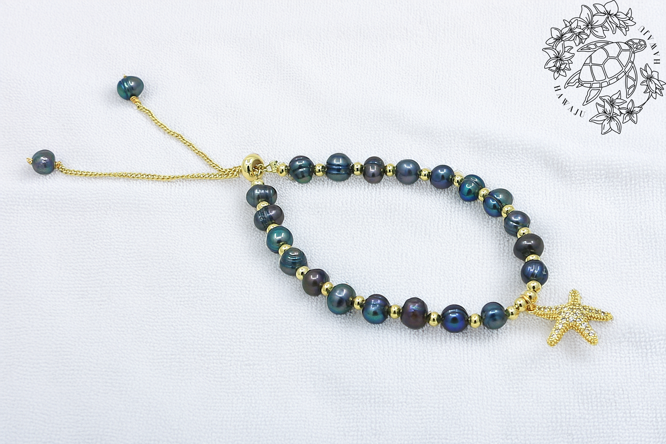 ハワイの海を感じさせるヒトデと、深みのあるブラックパールが調和したブレスレット。