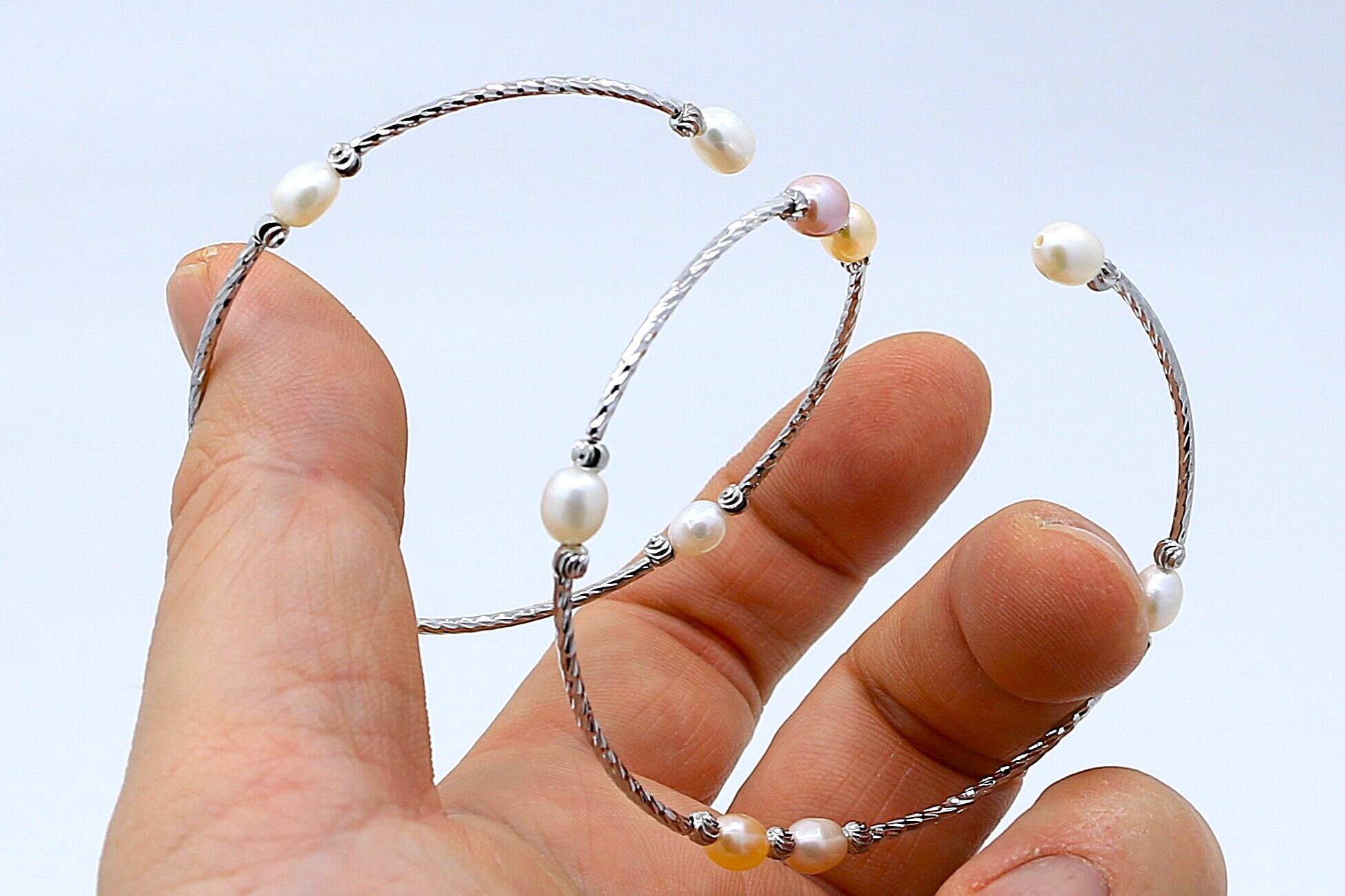 重なり合うラインと、淡水パールのやさしい輝きが調和した