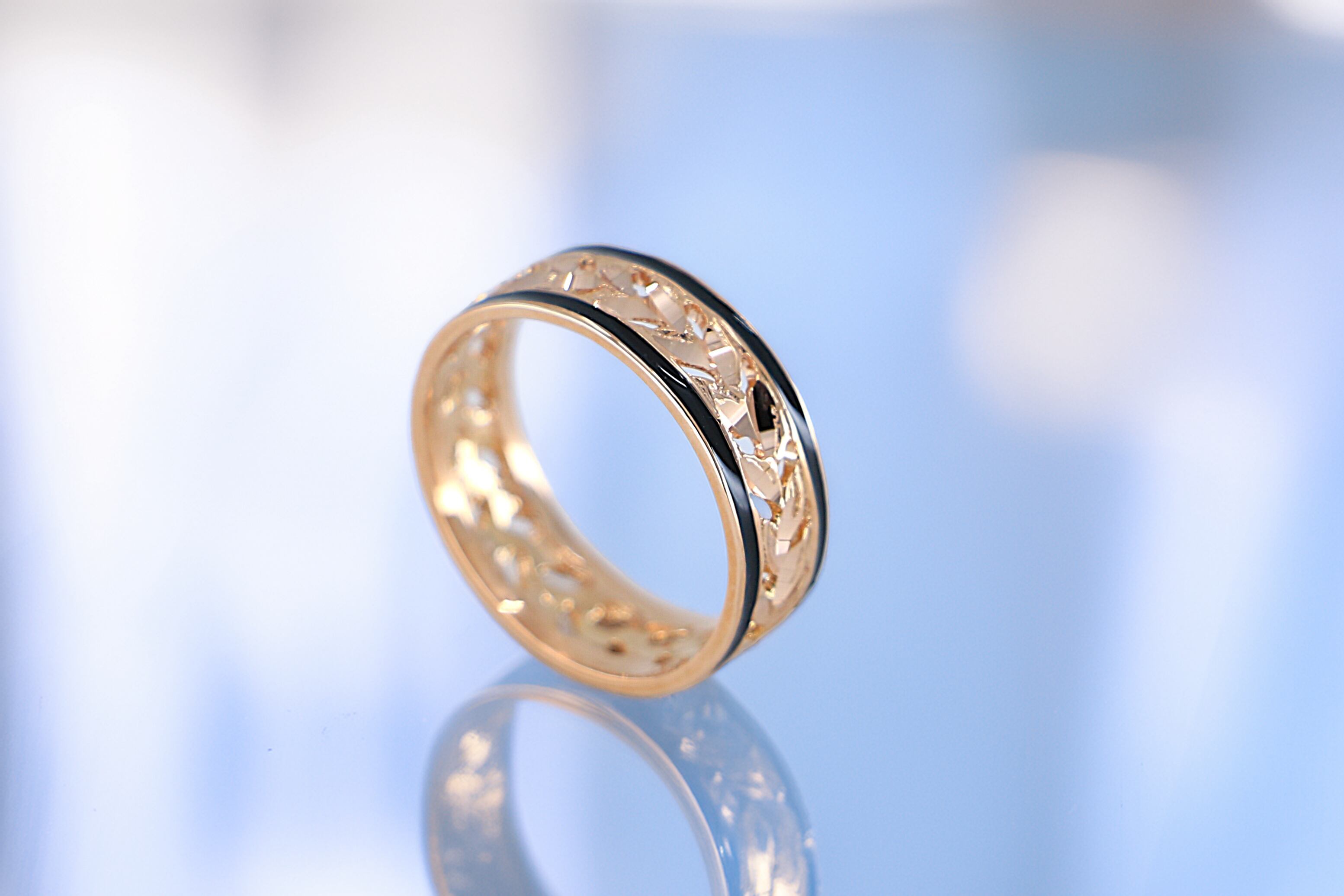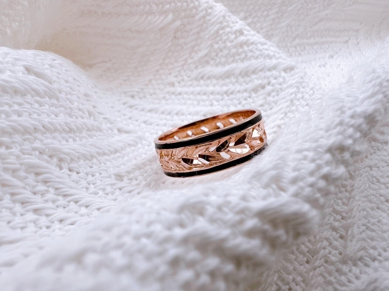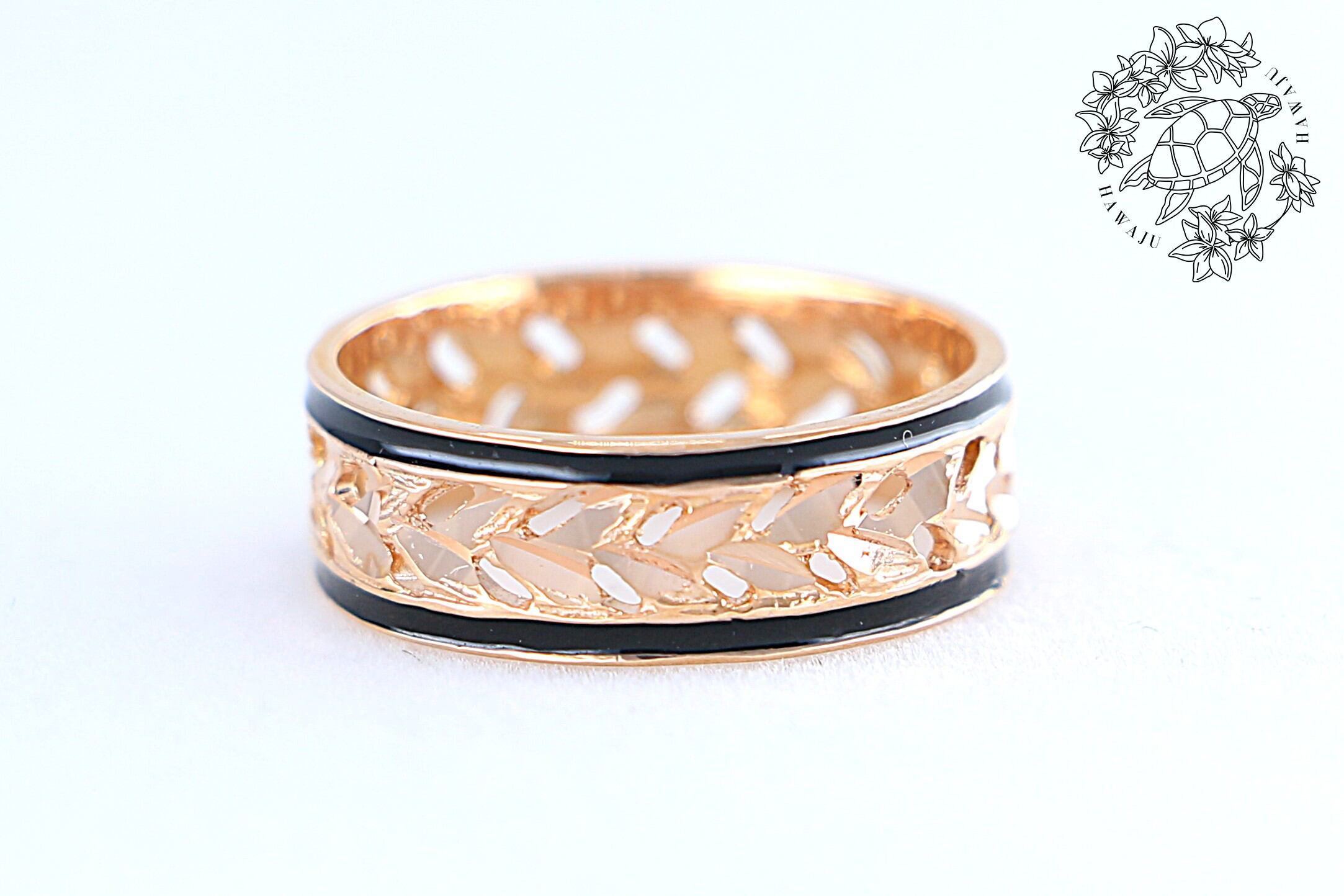 このリングは、ハワイの神聖な植物として知られる「マイレの葉」をモチーフにした14Kピンクゴールドの透かし彫りが施されたリングです。伝統的なハワイアンジュエリーの美しさを受け継ぎながら、繊細な彫刻と優雅なデザインが特徴の逸品となっています。リングには手彫りで施されたマイレの葉の模様が連なり、透かし加工によって軽やかで洗練された印象を演出し、さらに両サイドを引き締めるブラックエナメルのラインが全体のデザインにモダンなアクセントを加えています。ピンクゴールドの温かみのある輝きが肌に馴染みやすく、カジュアルからフォーマルまで幅広いスタイルにマッチするこのリングは、身に着ける人に幸運や絆をもたらすとされ、大切な人への贈り物や自分への特別なジュエリーとしても最適なアイテムです。