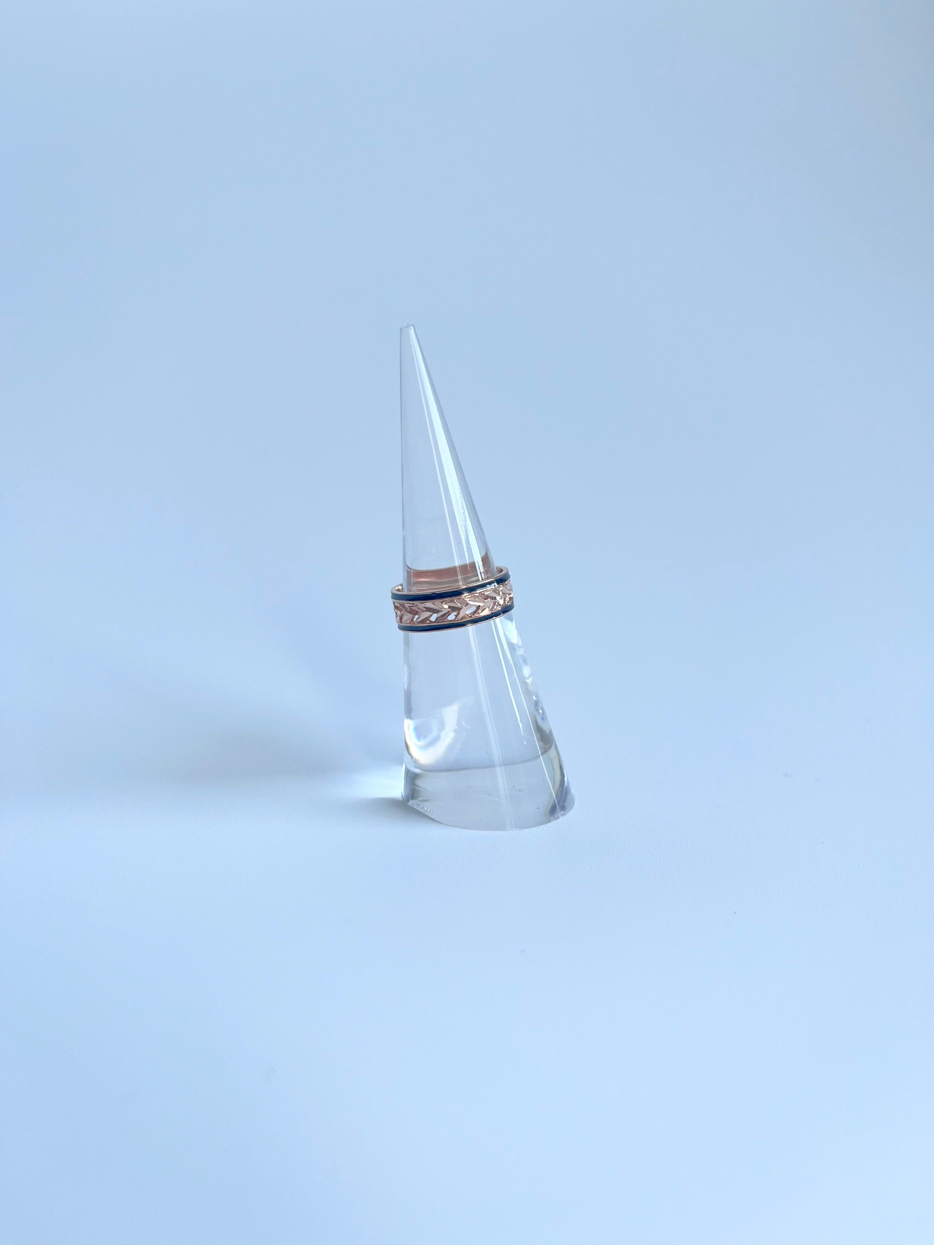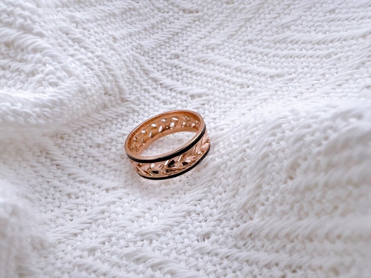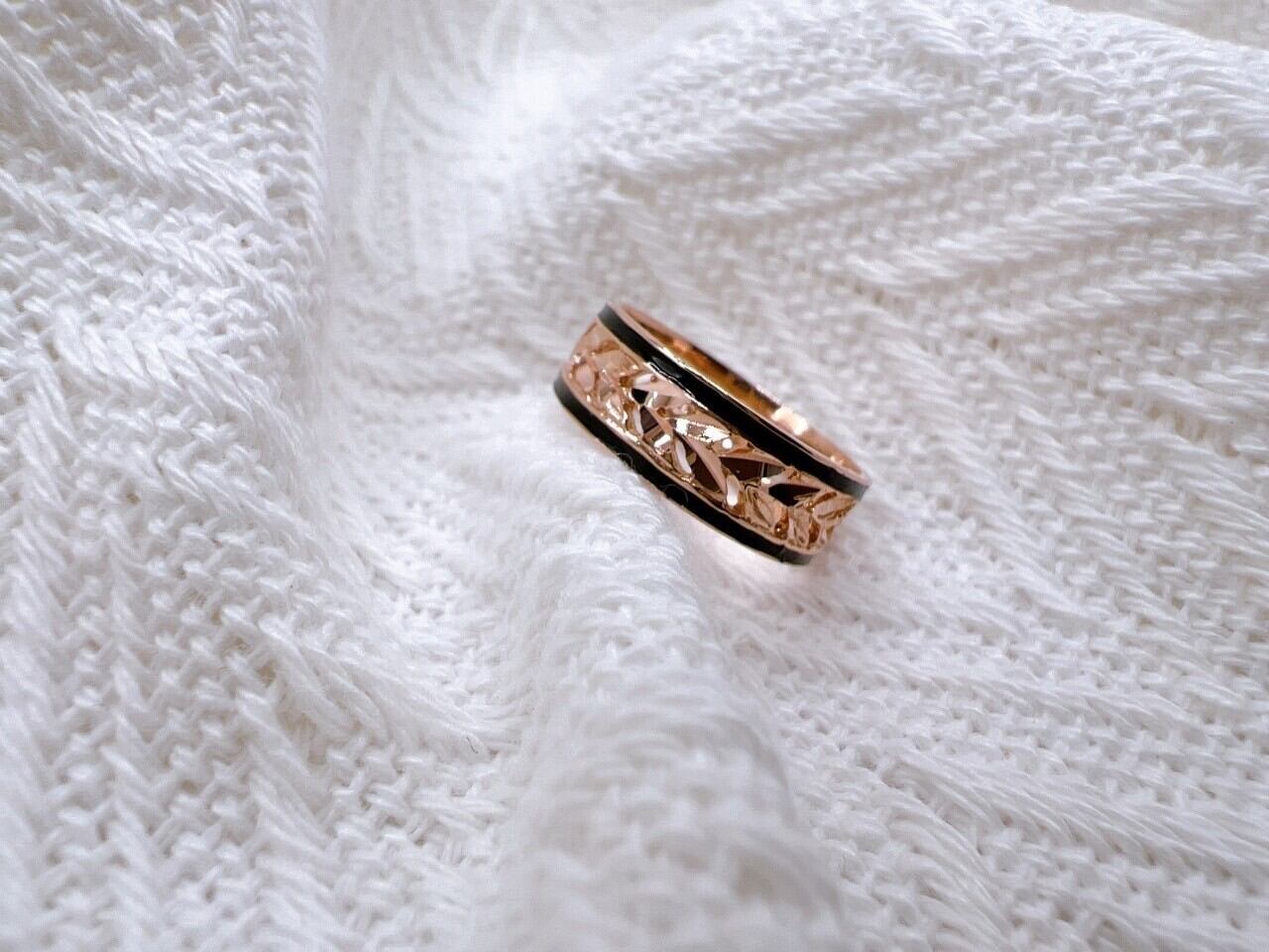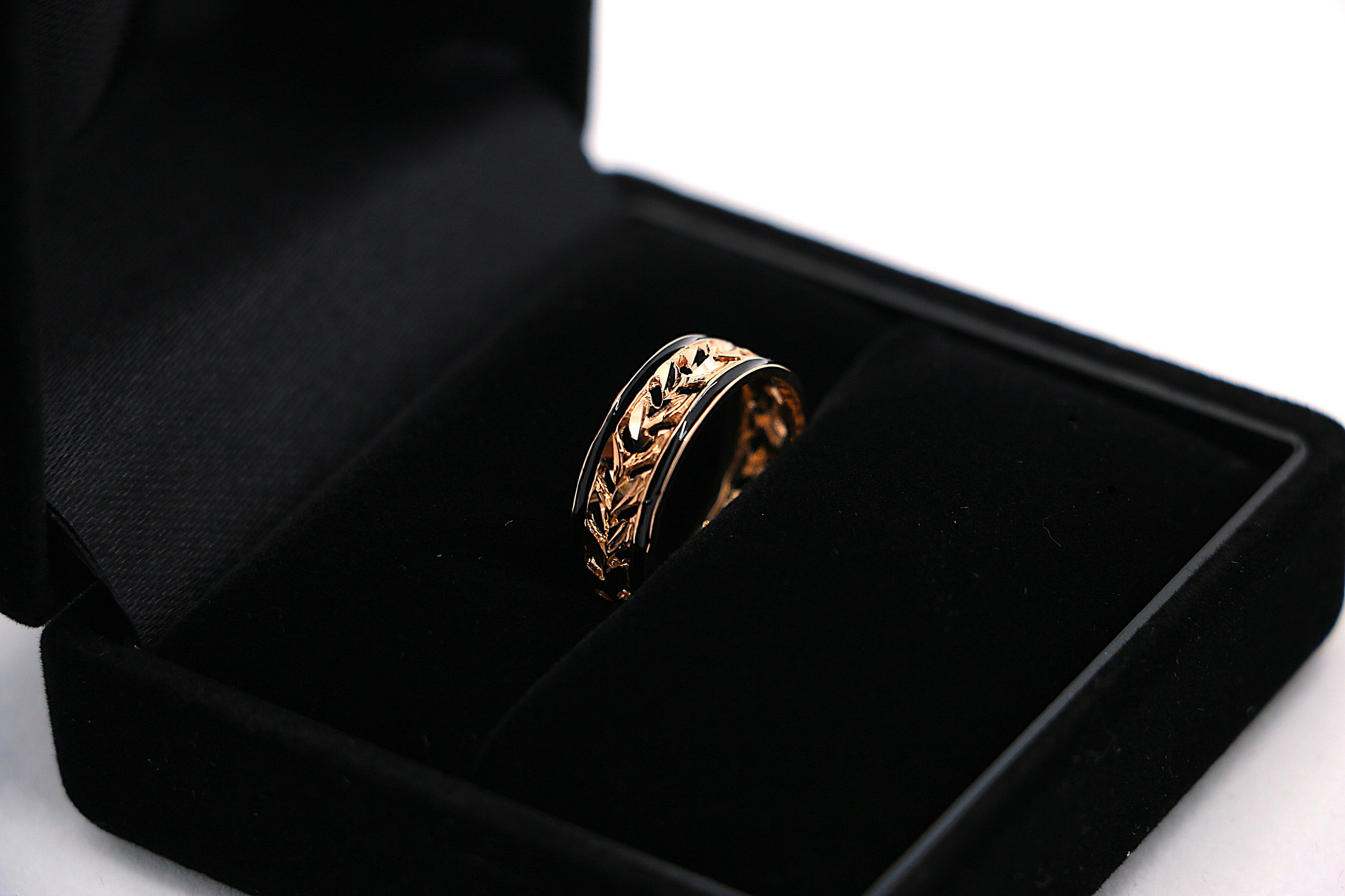 このリングは、ハワイの神聖な植物として知られる「マイレの葉」をモチーフにした14Kピンクゴールドの透かし彫りが施されたリングです。伝統的なハワイアンジュエリーの美しさを受け継ぎながら、繊細な彫刻と優雅なデザインが特徴の逸品となっています。リングには手彫りで施されたマイレの葉の模様が連なり、透かし加工によって軽やかで洗練された印象を演出し、さらに両サイドを引き締めるブラックエナメルのラインが全体のデザインにモダンなアクセントを加えています。ピンクゴールドの温かみのある輝きが肌に馴染みやすく、カジュアルからフォーマルまで幅広いスタイルにマッチするこのリングは、身に着ける人に幸運や絆をもたらすとされ、大切な人への贈り物や自分への特別なジュエリーとしても最適なアイテムです。