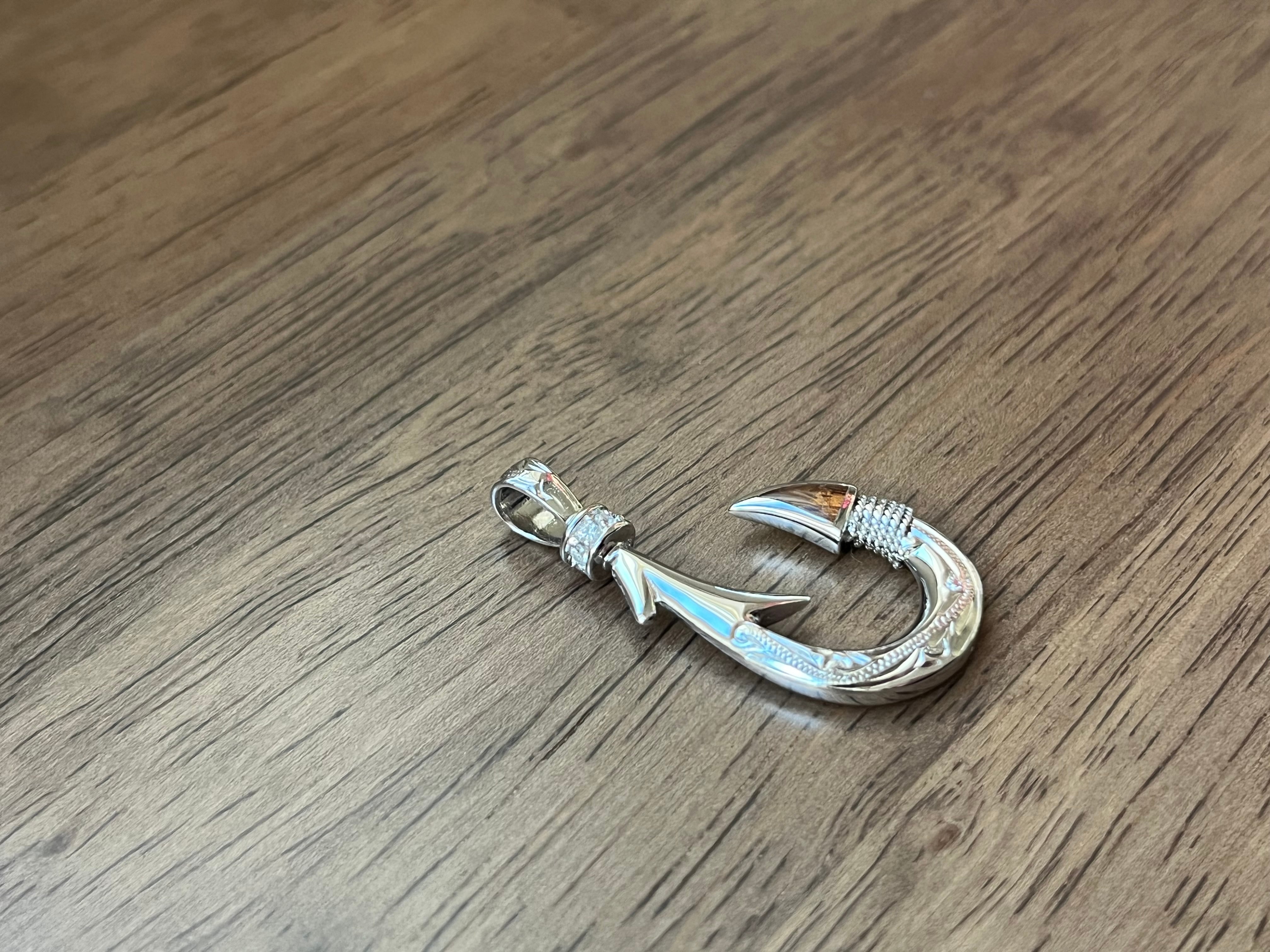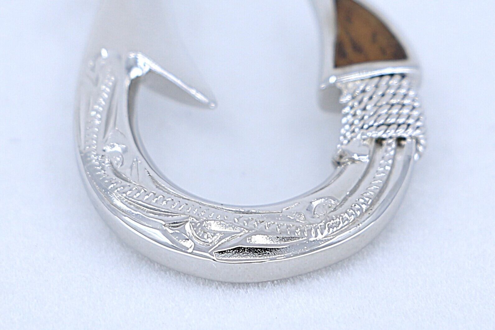 このペンダントトップは、ハワイアンジュエリーの象徴的なデザインであるフィッシュフック(釣り針)をモチーフにした、大きめサイズで存在感のあるシルバー製ジュエリーです。両面に施された繊細な彫刻と、針先にあしらわれたコアウッドが、伝統と高級感を兼ね備えた美しい仕上がりとなっています。