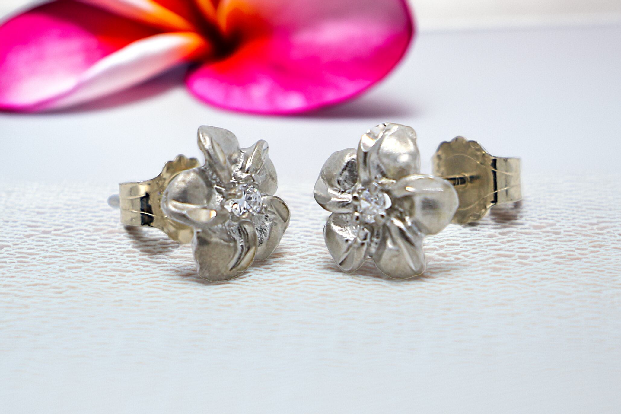 花の中央にはキュービックジルコニアがあしらわれており、キラリと輝くことで、シンプルでありながらも目を引く存在感があります。これにより、プルメリアの花がさらに引き立ち、華やかさとエレガンスを増しています。