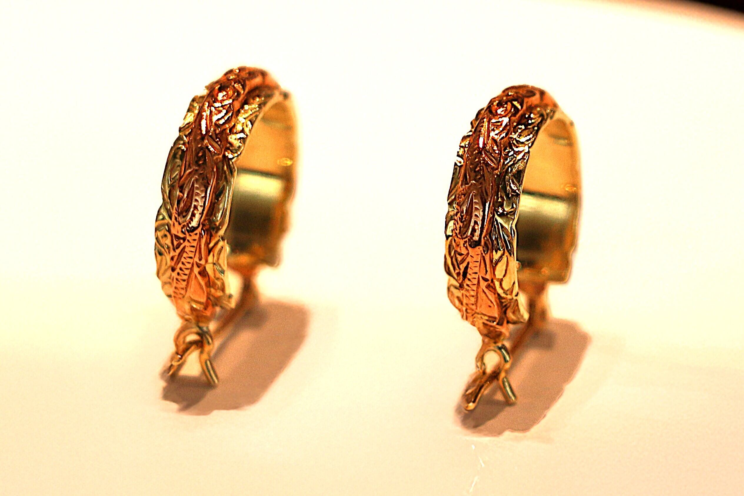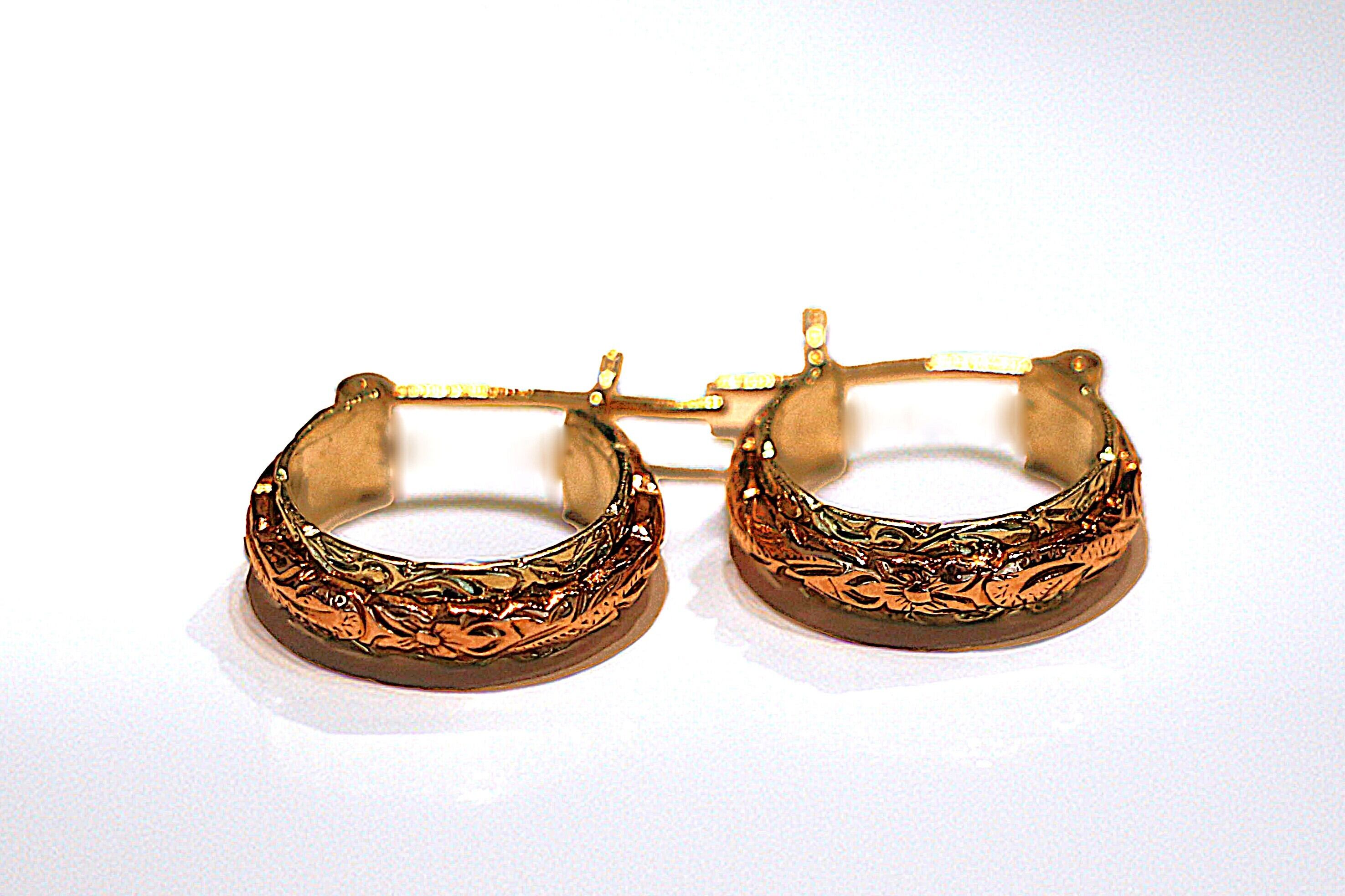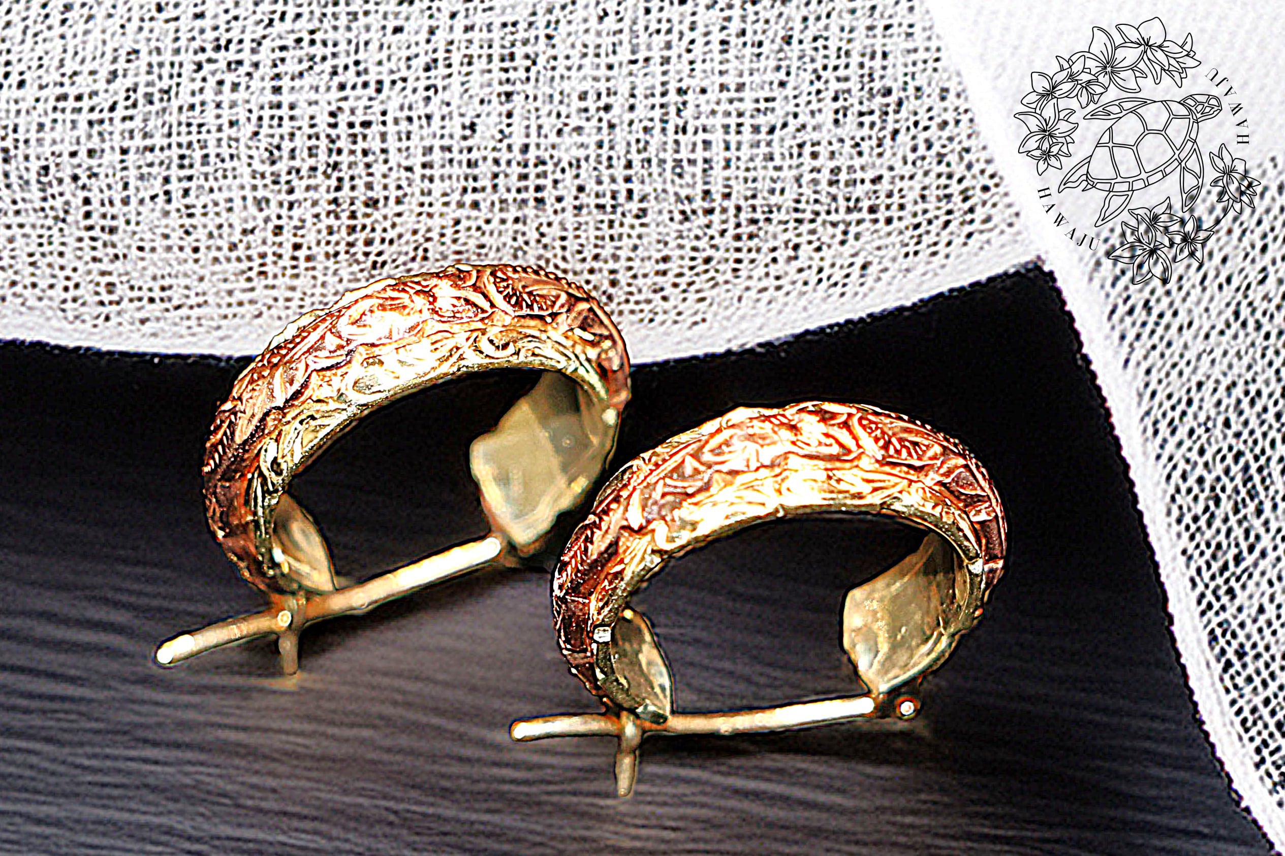 このピアスは、14Kのイエローゴールドとピンクゴールドを組み合わせたもので、ハワイの伝統的なヘリテイジデザインを取り入れ、職人が一つ一つ丁寧に彫刻を施した高級感あふれる逸品です。ツートンカラーの色合いが上品なコントラストを生み出していることで、華やかさと洗練された印象を兼ね備えたデザインとなっており、適度なボリューム感とエレガントな輝きが耳元を美しく彩り、カジュアルな装いからフォーマルなシーンまで幅広く活躍し、ハワイの自然や文化を感じさせるデザインが特別な存在感を放つため、自分へのご褒美や大切な方へのギフトとしても最適なアイテムです。