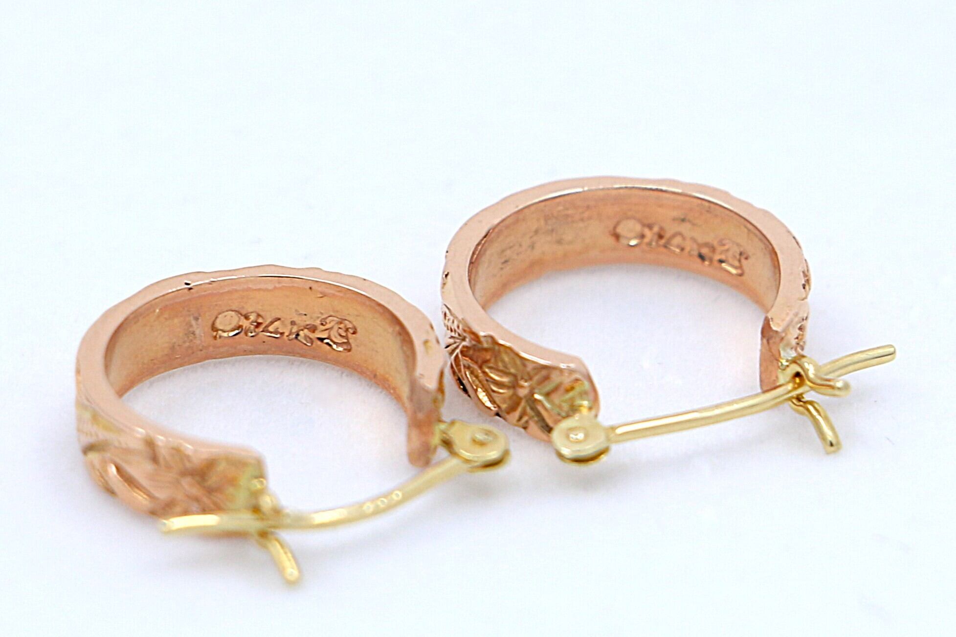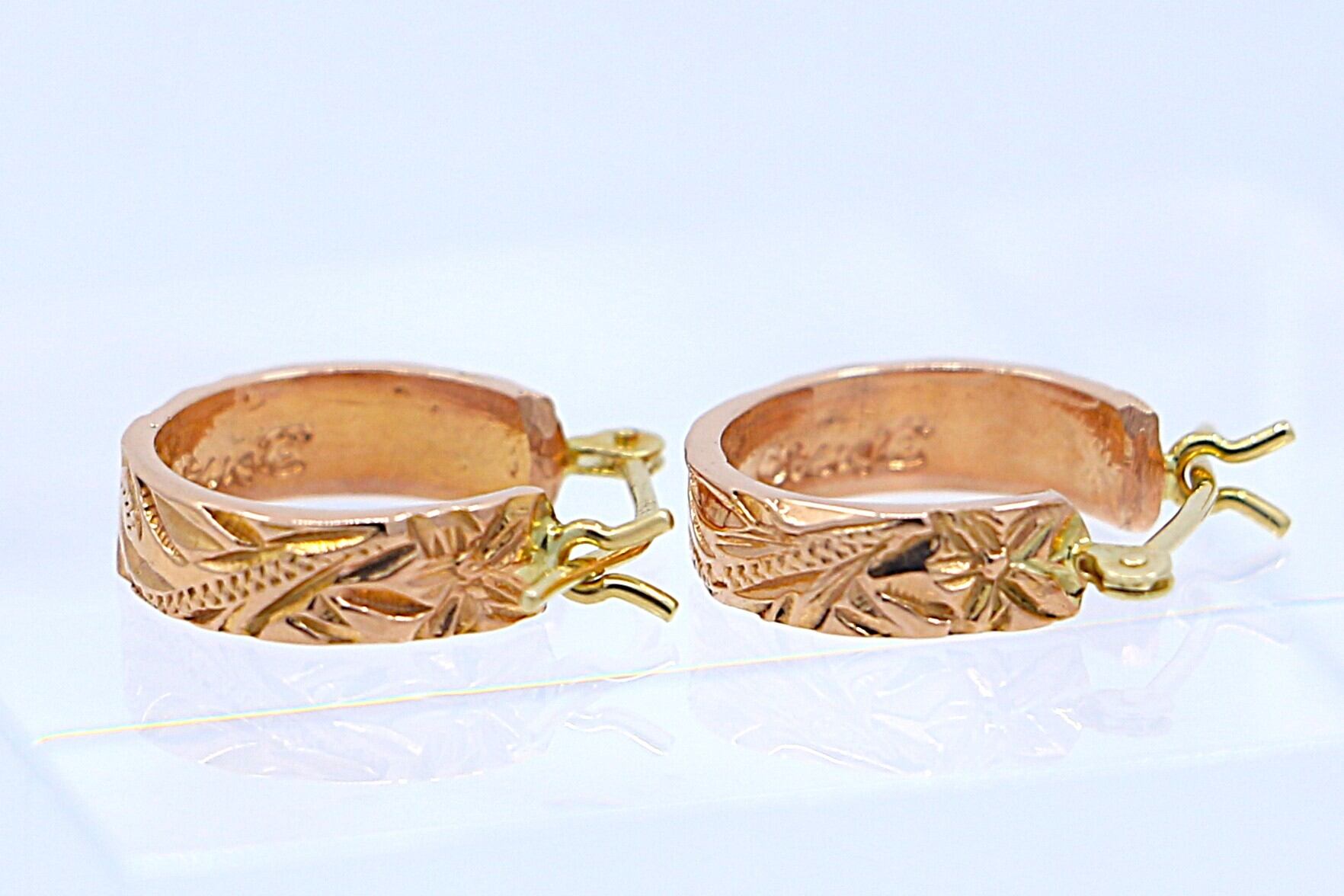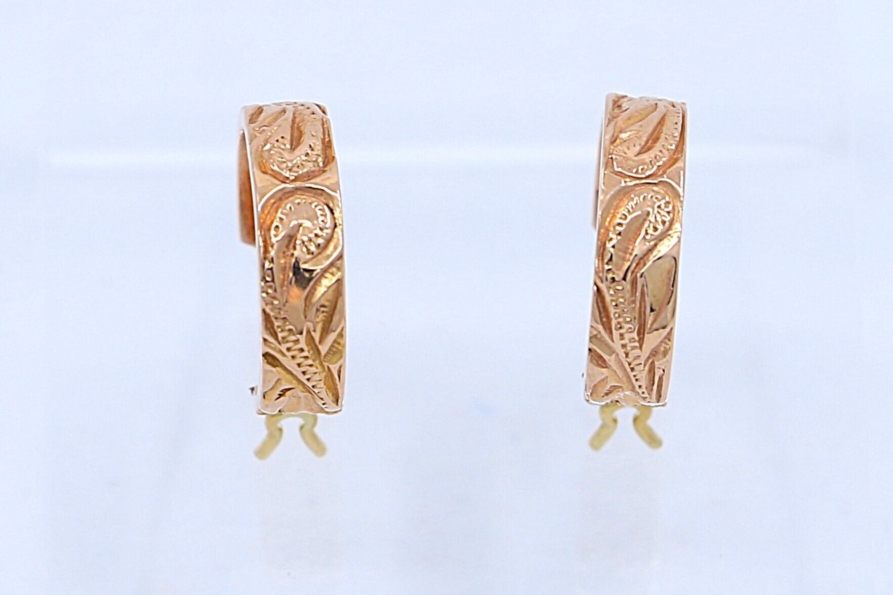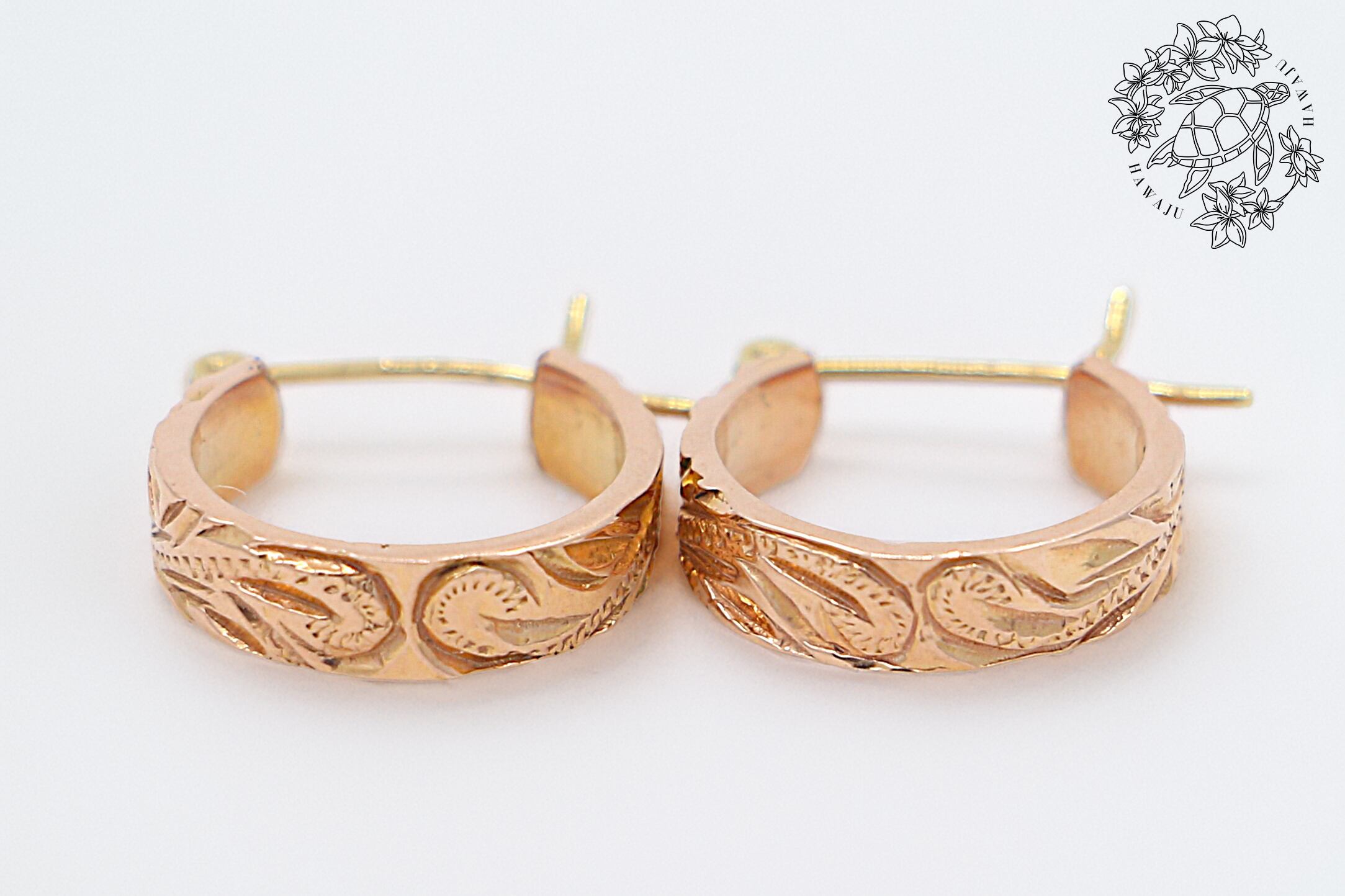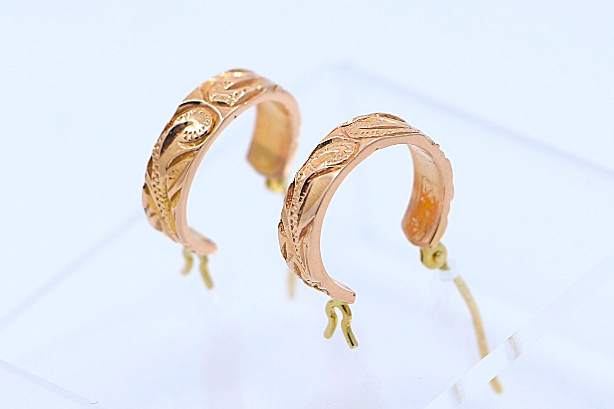 この14Kピンクゴールドのピアスは、ハワイアンジュエリーの伝統を受け継いだ繊細なヘリテイジデザインの彫刻が魅力の逸品です。熟練の職人による手彫りの模様が、上品で優雅な輝きを放ちます。温かみのあるピンクゴールドの色合いが肌になじみやすく、耳元に華やかなアクセントを加えます。