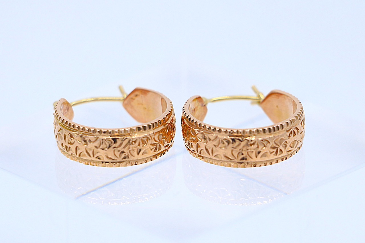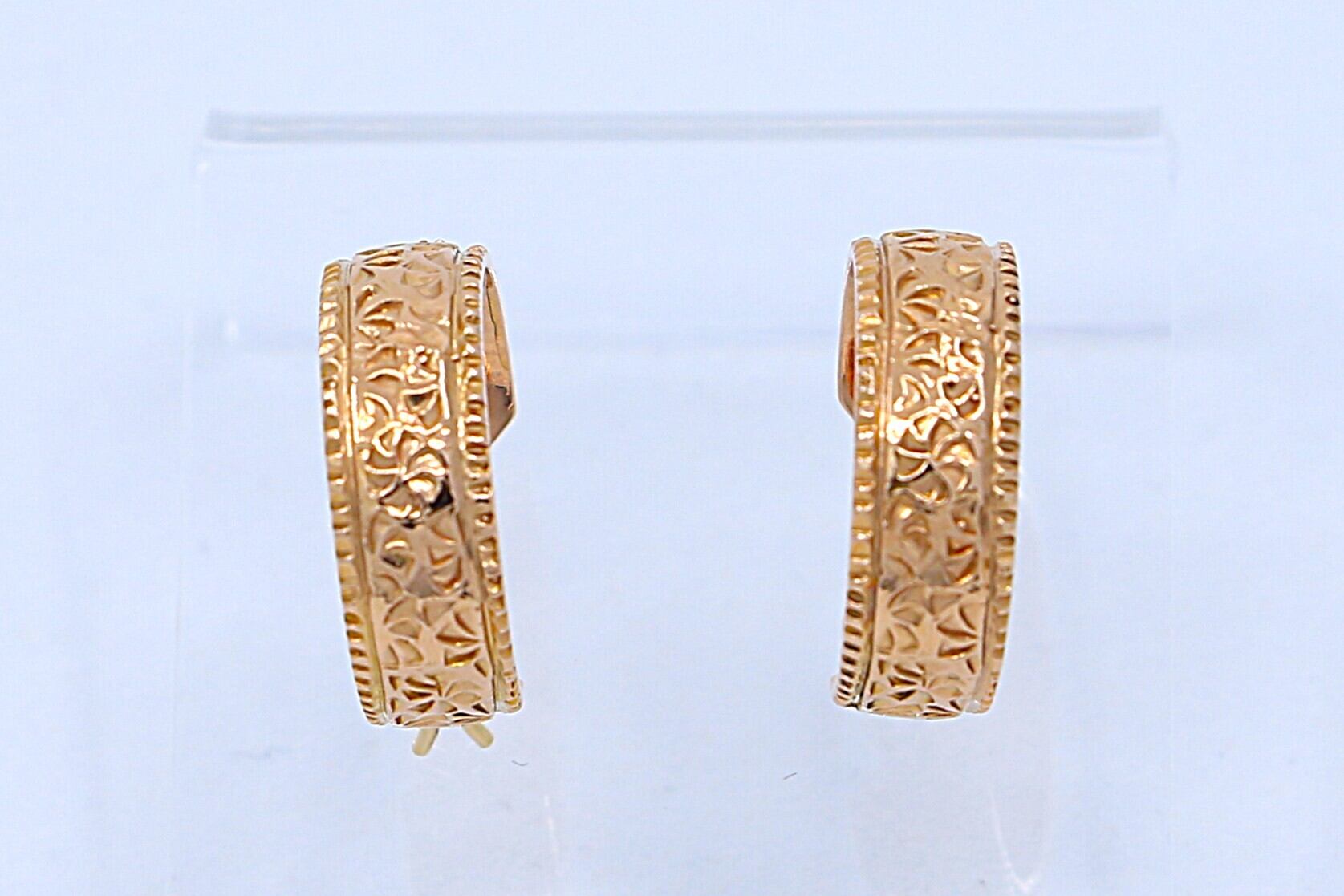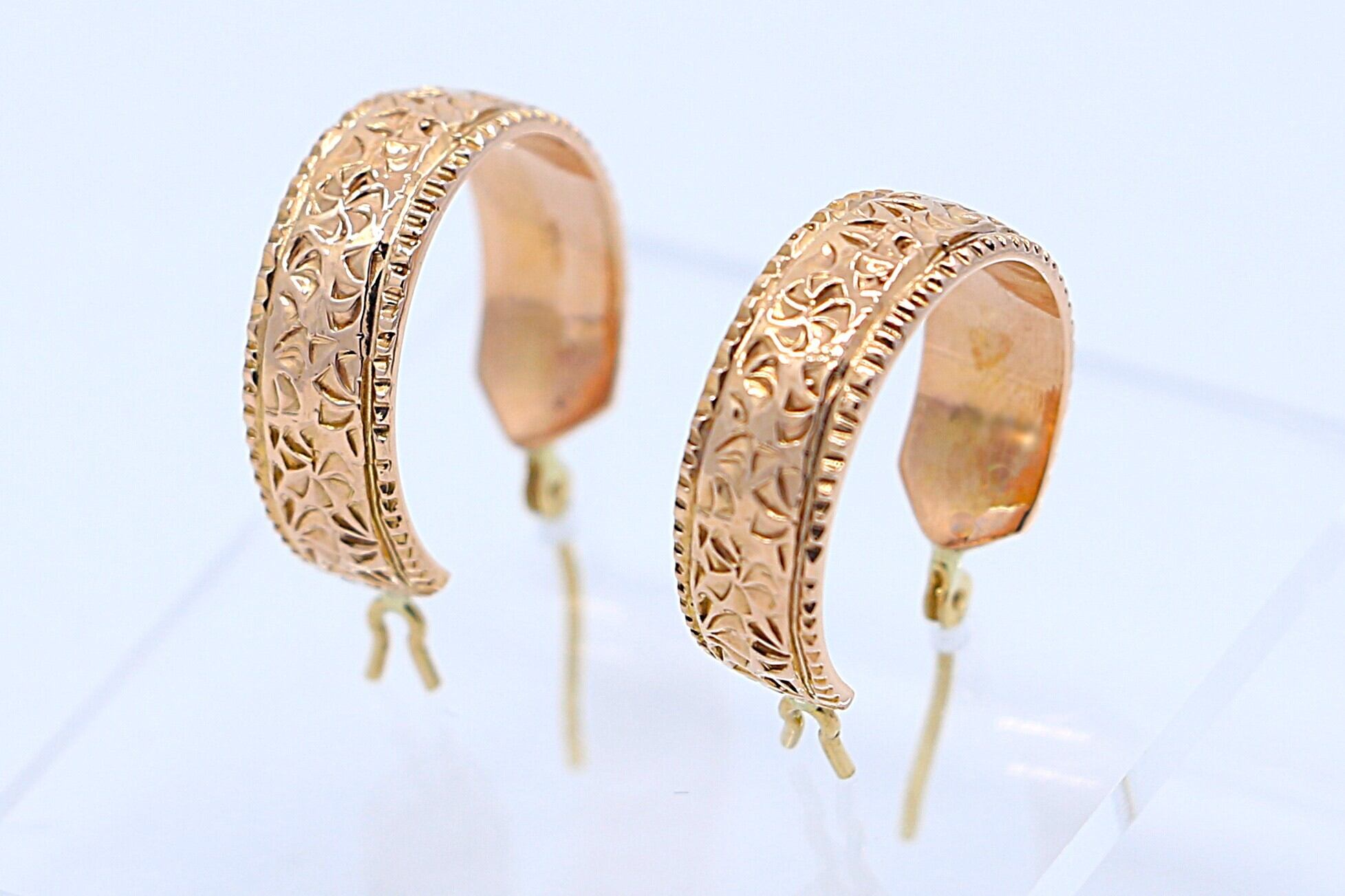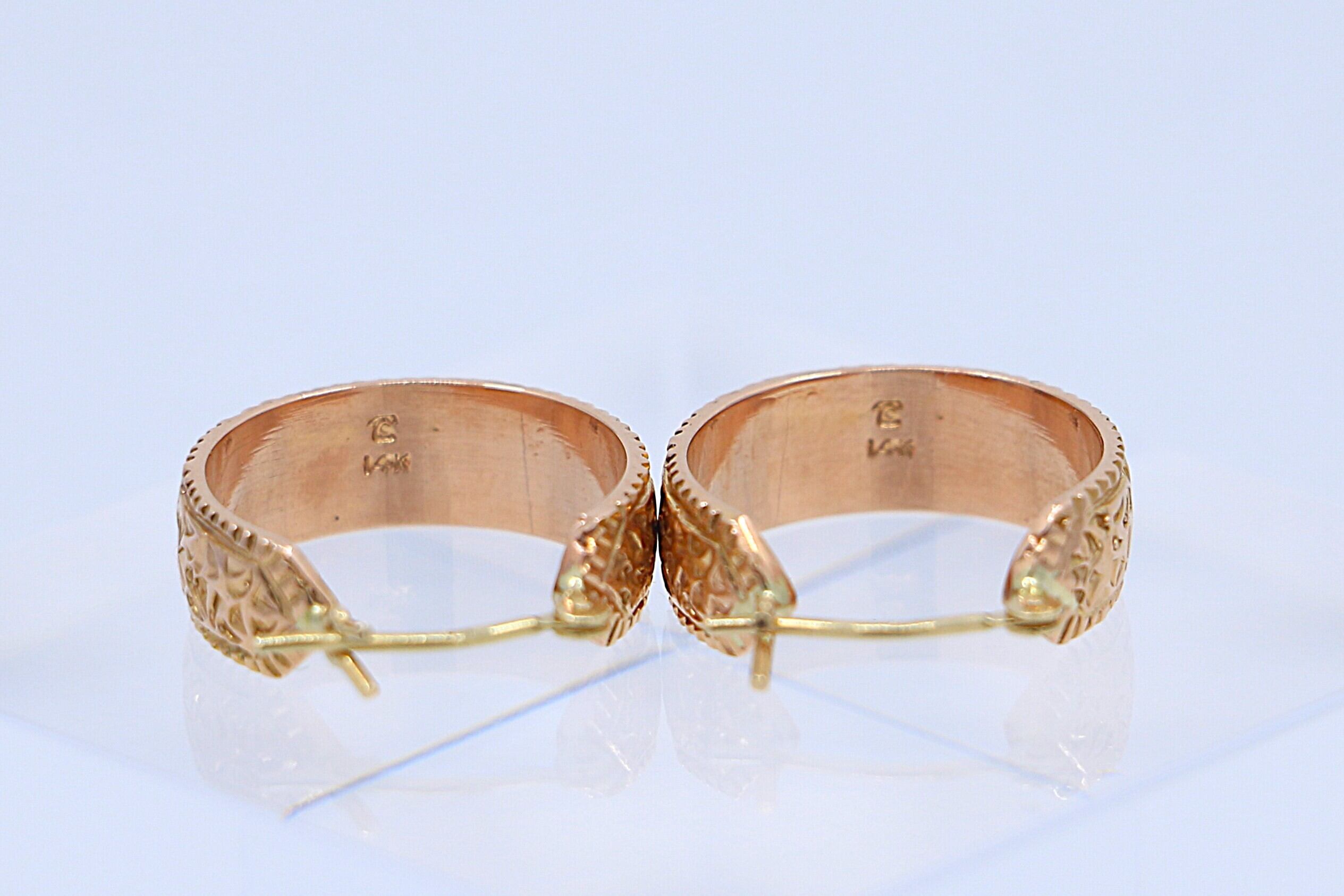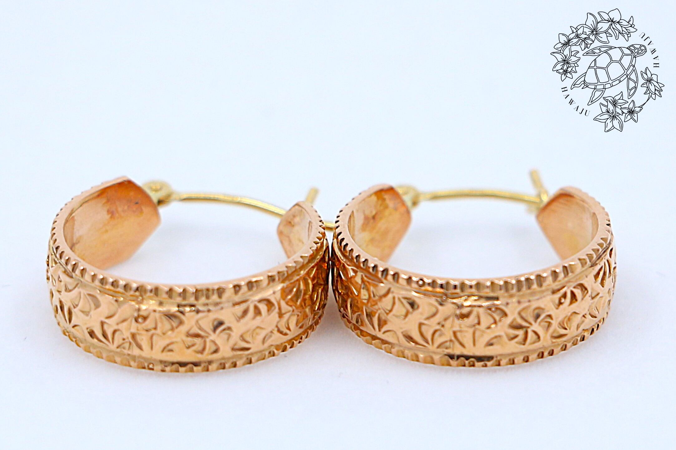 この14Kピンクゴールドのピアスは、南国の美しさを象徴するティアレの花をモチーフにしたデザインの彫刻が魅力の逸品です。熟練の職人による手彫りの模様が、上品で優雅な輝きを放ちます。温かみのあるピンクゴールドの色合いが肌になじみやすく、5.20gのしっかりとしたボリュームが上品な存在感を演出し、耳元に華やかなアクセントを加えます。
