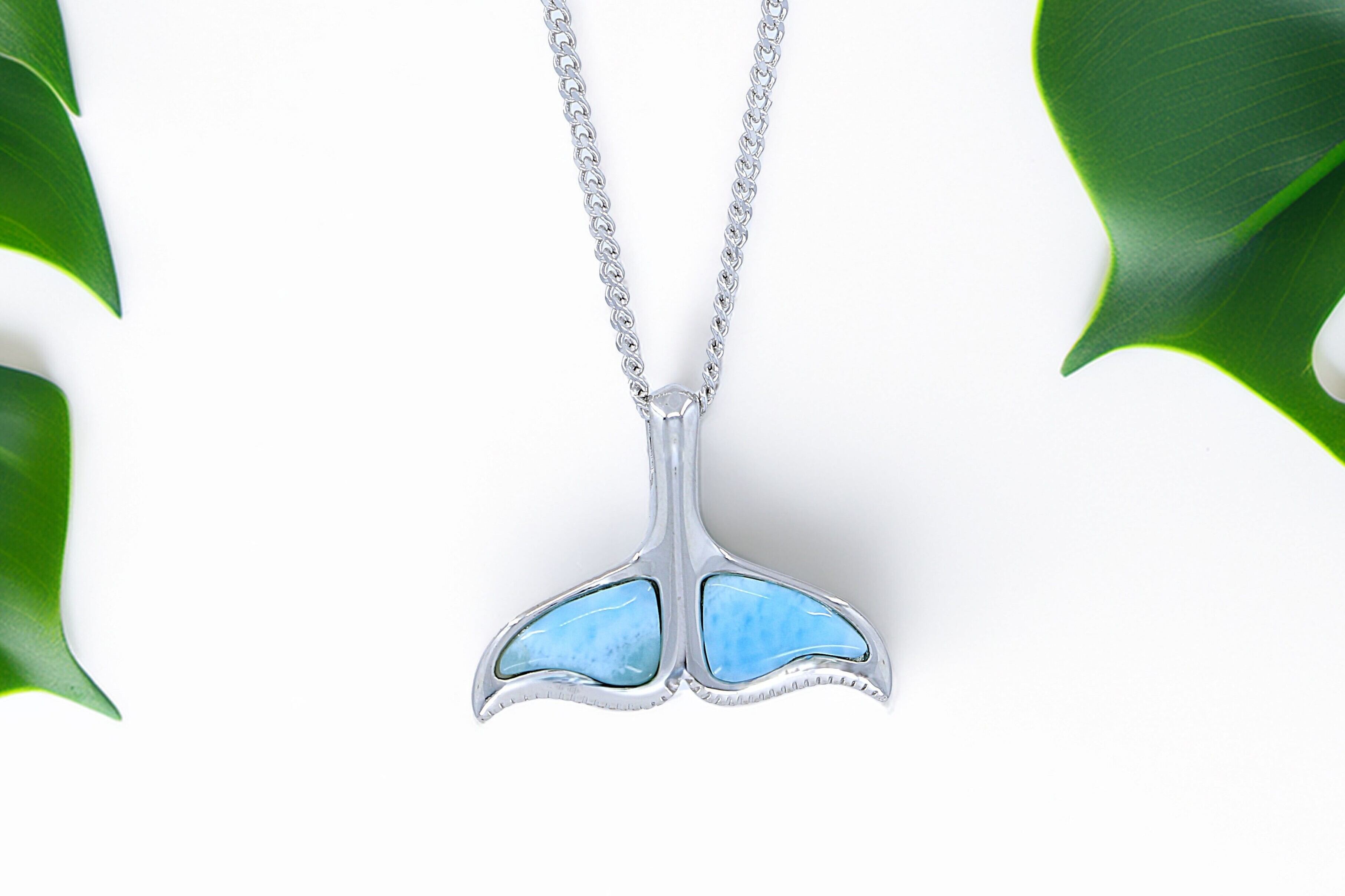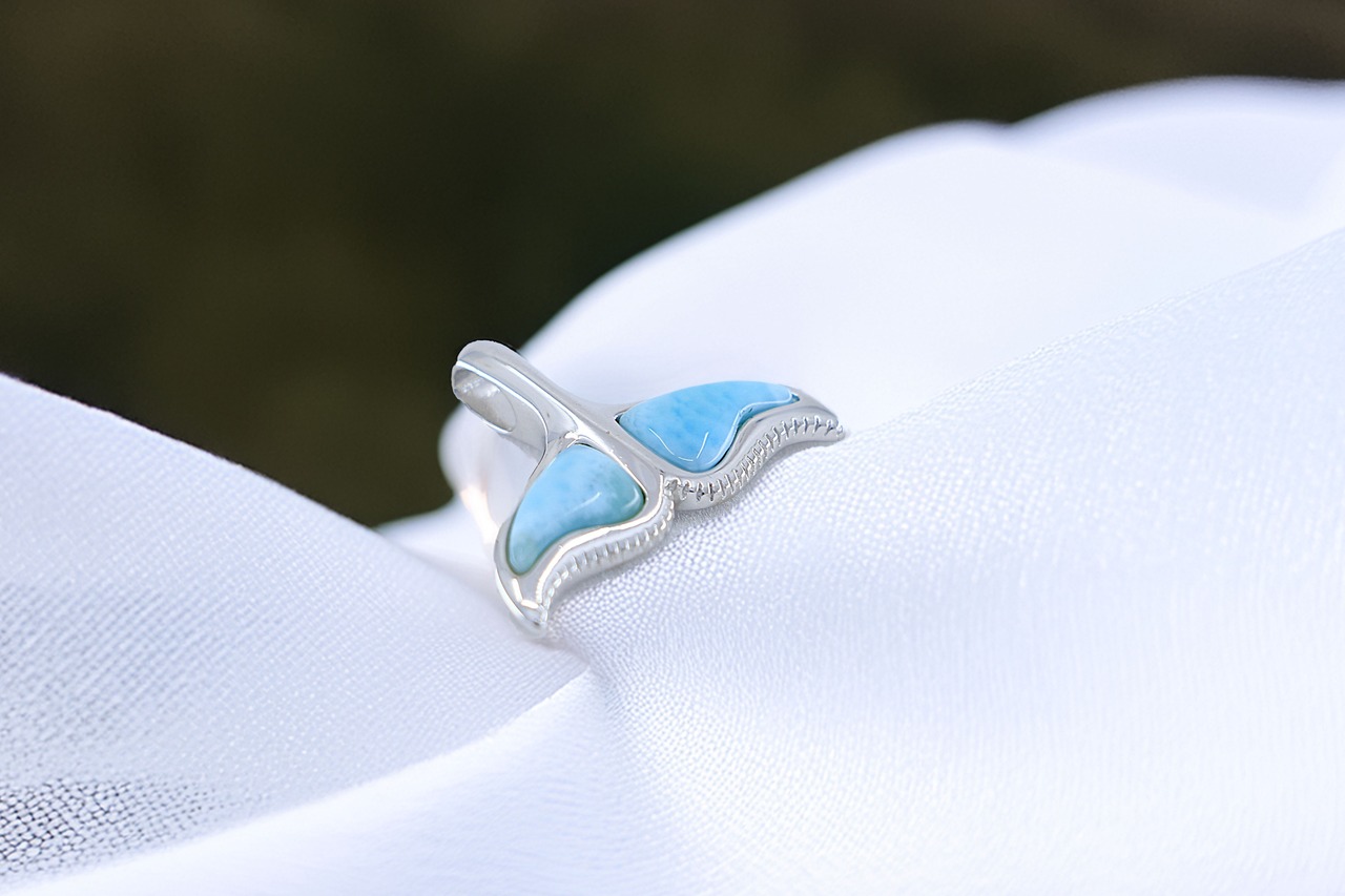 ラリマーは、その美しい青と白の模様が特徴の珍しい宝石で、カリブ海でしか採取できないと言われています。このペンダントにあしらわれたラリマーは、海のように深く美しい青色を持ち、見るたびに異なる表情を見せます。その独特の色合いが、ホエールテールのデザインと完璧に調和し、神秘的で幻想的な輝きを放ちます。ラリマーは「癒しの石」として知られ、ストレスを和らげ、心身のバランスを整える効果があると言われています。身に着けることで、ポジティブなエネルギーを感じることができます。