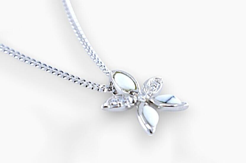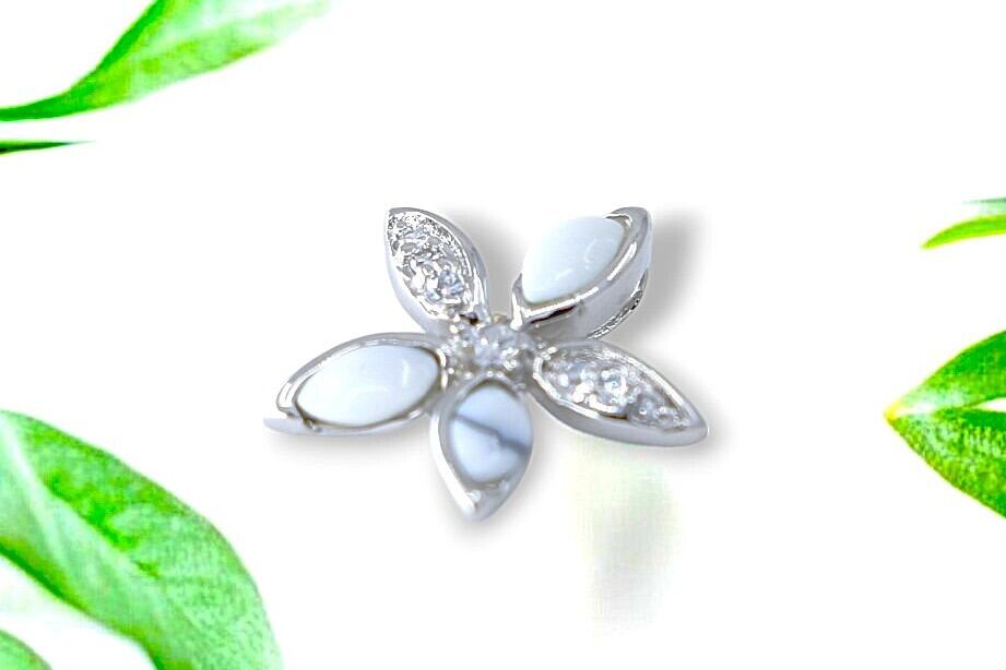 このプルメリアの花デザインのペンダントトップは、ハワイアンジュエリーの美しさを感じさせる、洗練された一品です。花弁にはホワイトターコイズとキュービックジルコニアが施され、シンプルながら華やかな輝きを放っています。シルバーのシャープで洗練された輝きが全体のデザインに上品さを加え、プルメリアの花が象徴する愛や幸運のエネルギーを感じさせます。どんなシーンにもぴったりな、上質で優雅なアクセサリーです。