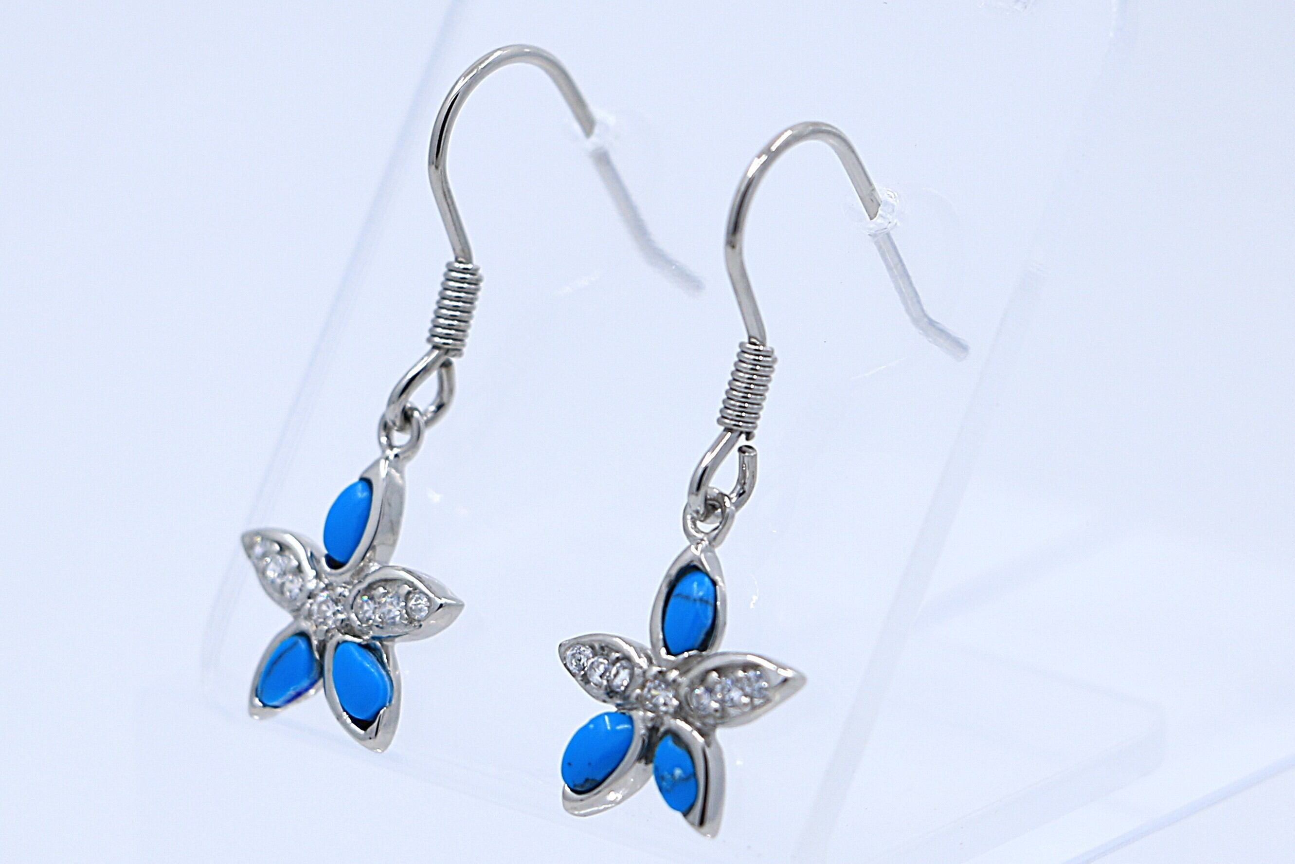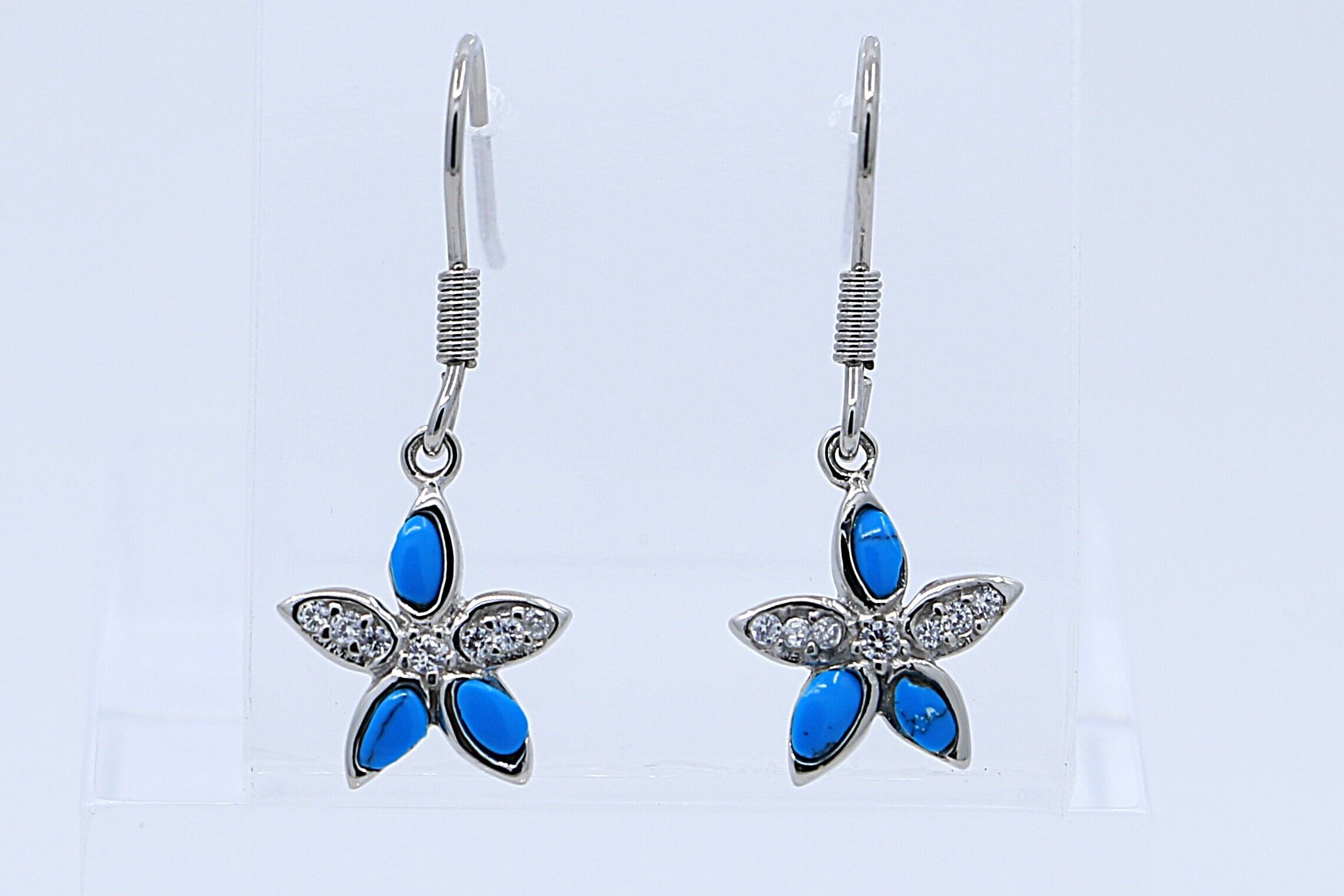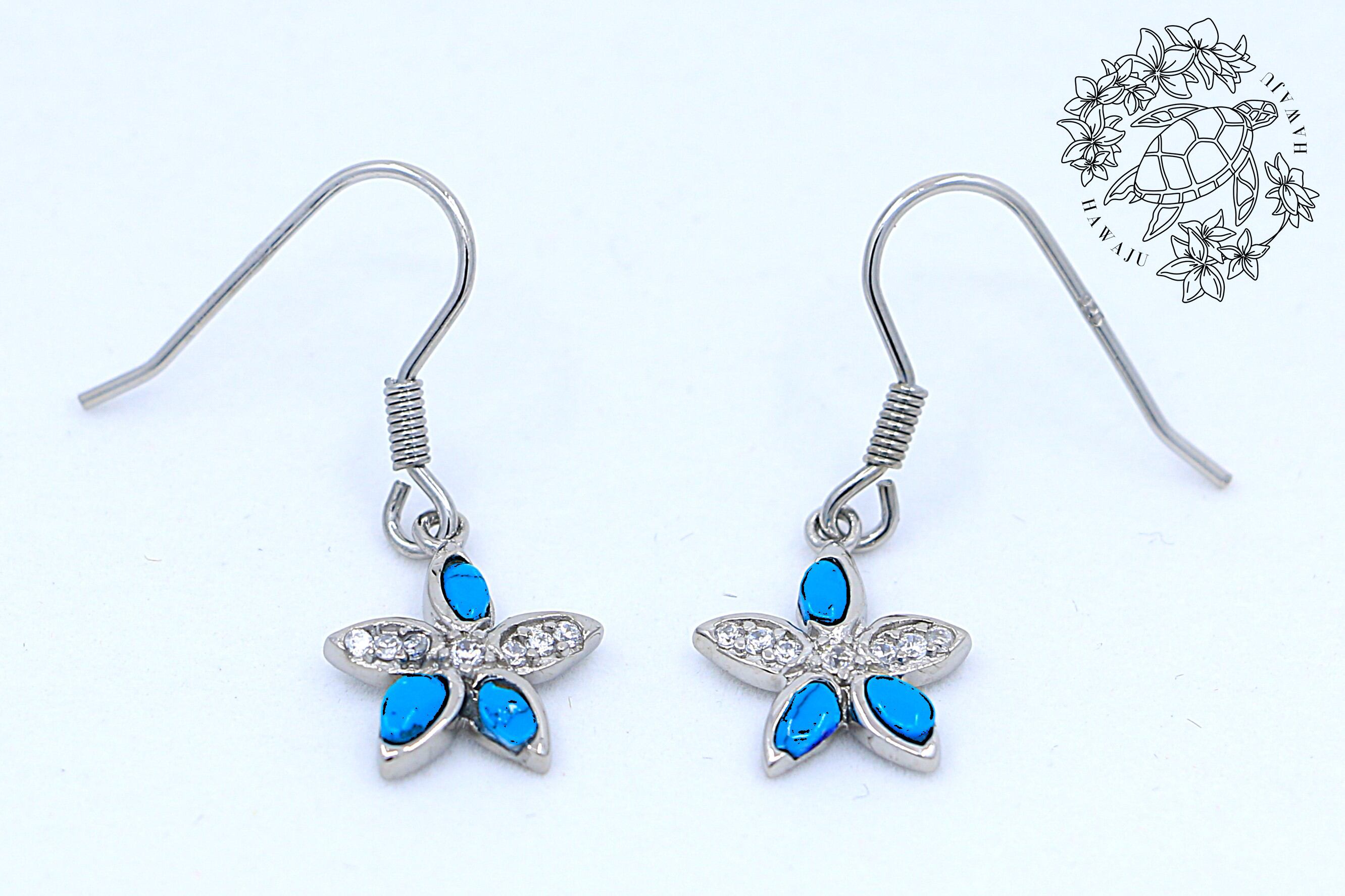 ハワイの自然の美しさと、心を癒す象徴的なデザインを凝縮した、プルメリアの花をモチーフにしたフックタイプのピアス。シルバー素材にブルーターコイズとキュービックジルコニアを贅沢にあしらい、華やかさと上品さを兼ね備えた逸品です。日常のコーディネートにぴったりでありながら、特別な日にもぴったりのアクセサリーです。