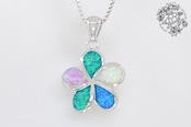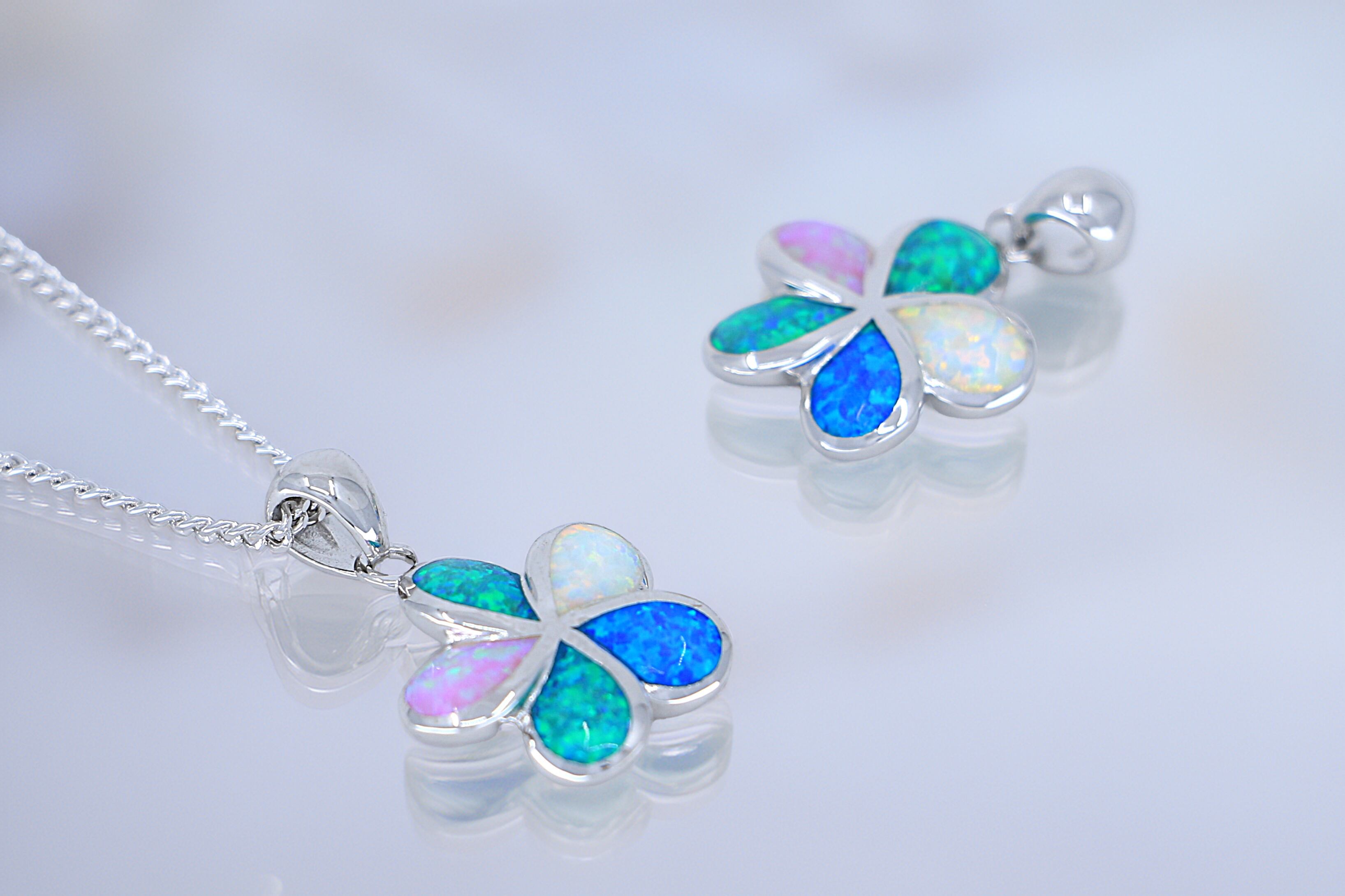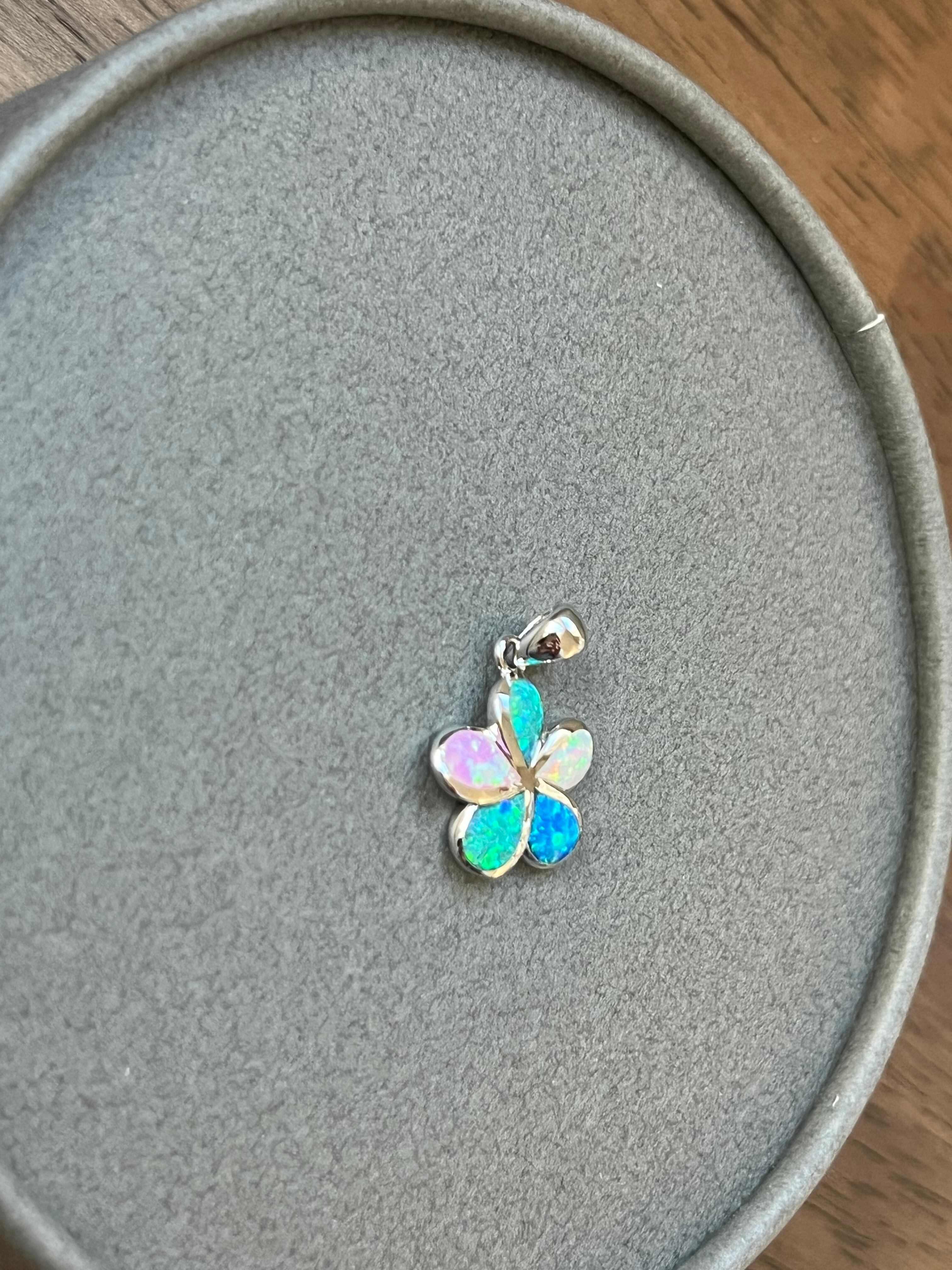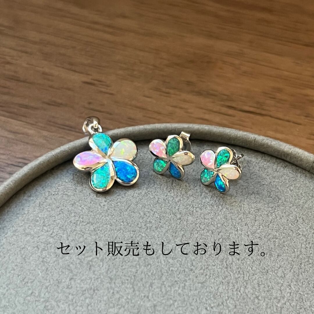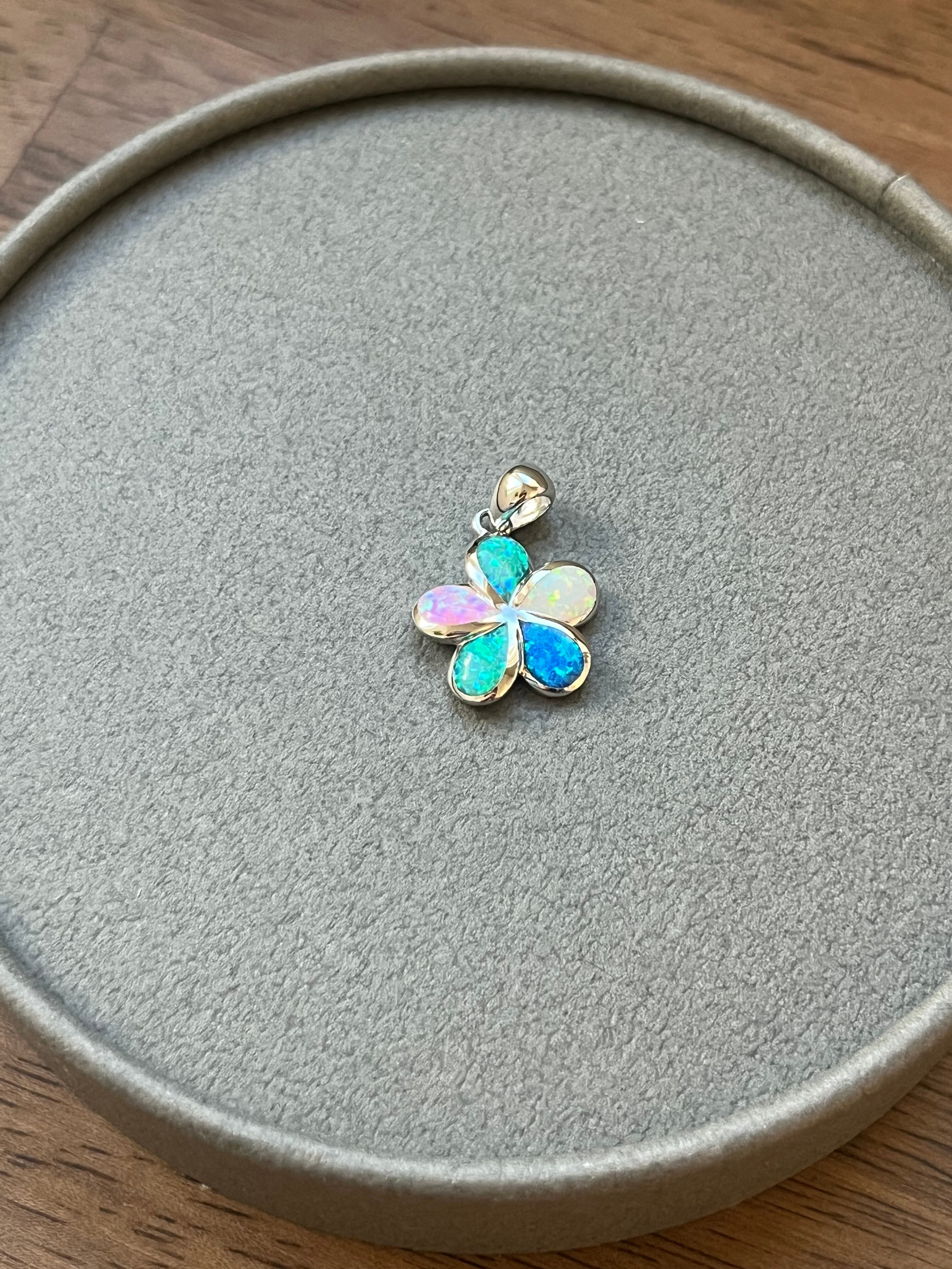 このプルメリアの花デザインペンダントトップは、ハワイアンジュエリーの中でも特に魅力的なアイテムです。花弁に施されたレインボーオパールが光の加減で幻想的な輝きを放ち、シンプルでありながら非常に存在感のあるデザインに仕上がっています。シルバーのシャープな輝きが花の優美さを引き立て、華やかでありながらも上品な印象を与えます。