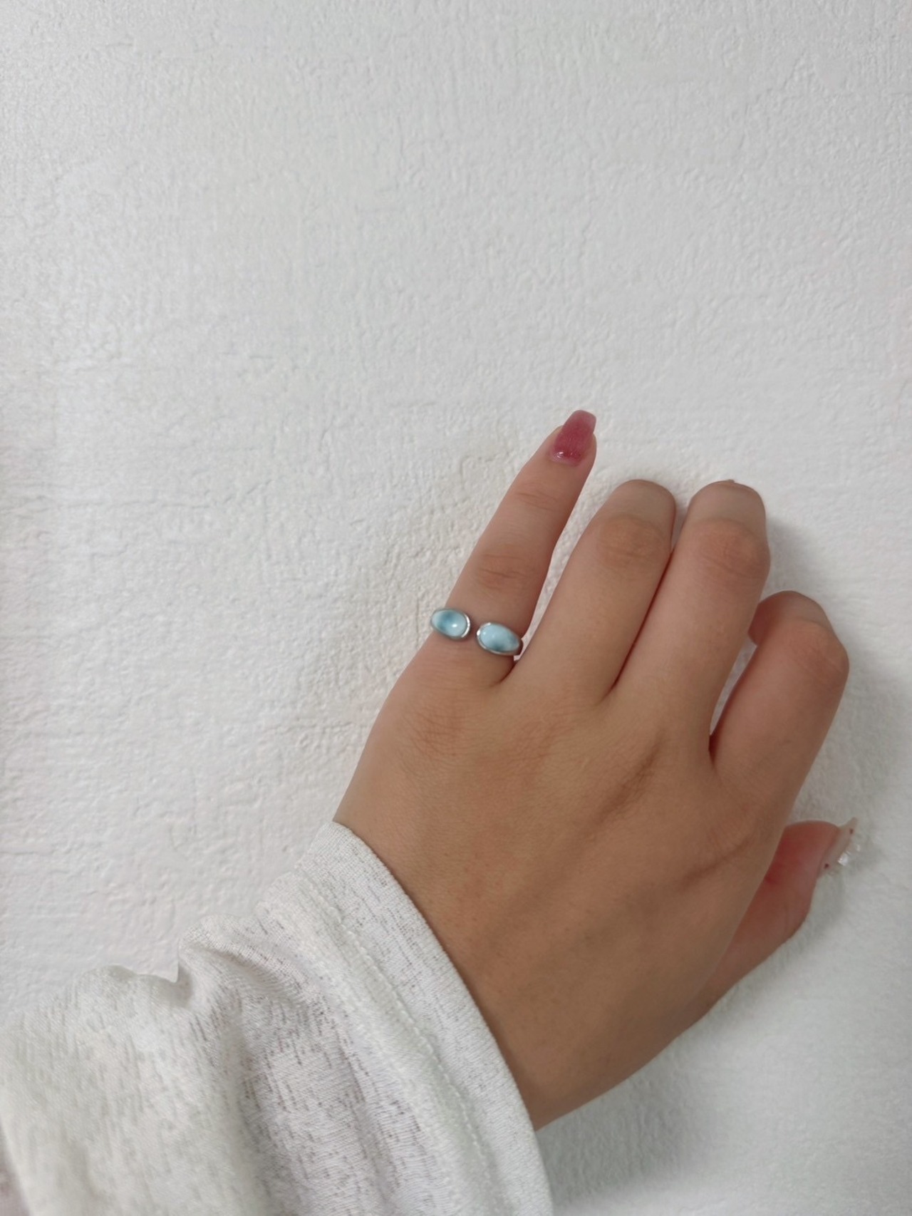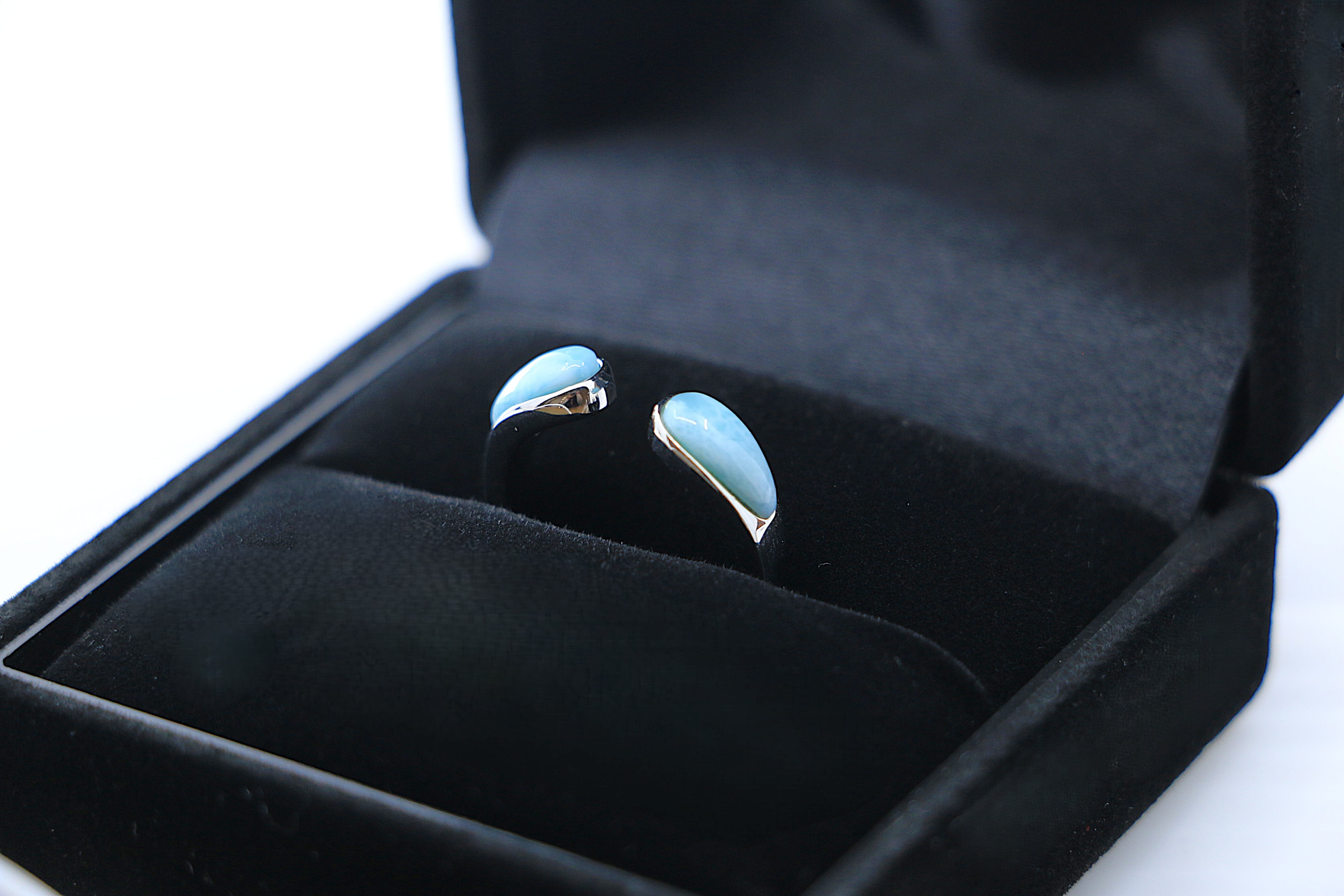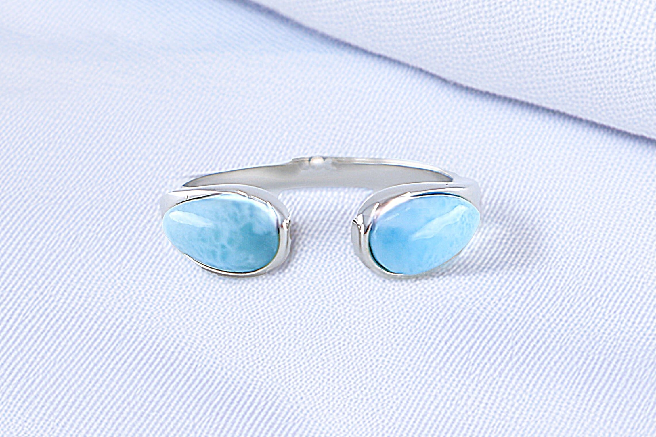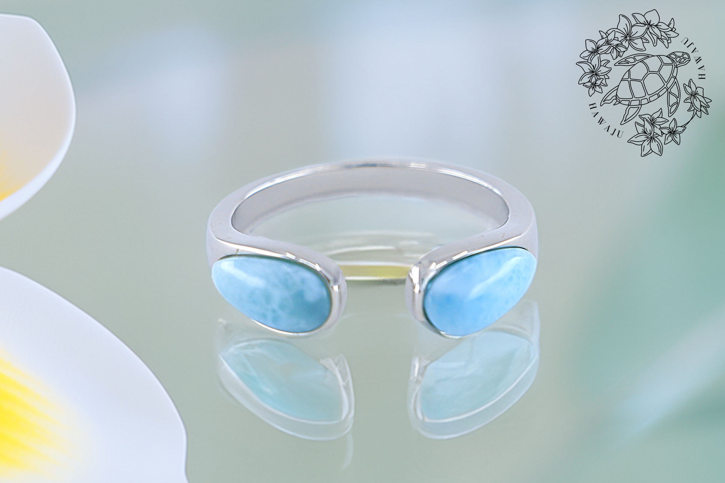 このシルバーリングは、オープンスタイルで指にフィットするようにデザインされており、着け心地が良く、どんな指にも美しく調和します。リングの両端に配置されたラリマーが、シルバーの輝きと相まって、優雅で印象的であり、目を引く存在感を放っています。シンプルでありながらも、ハワイアンジュエリーの力強い美しさを感じられるアイテムです。