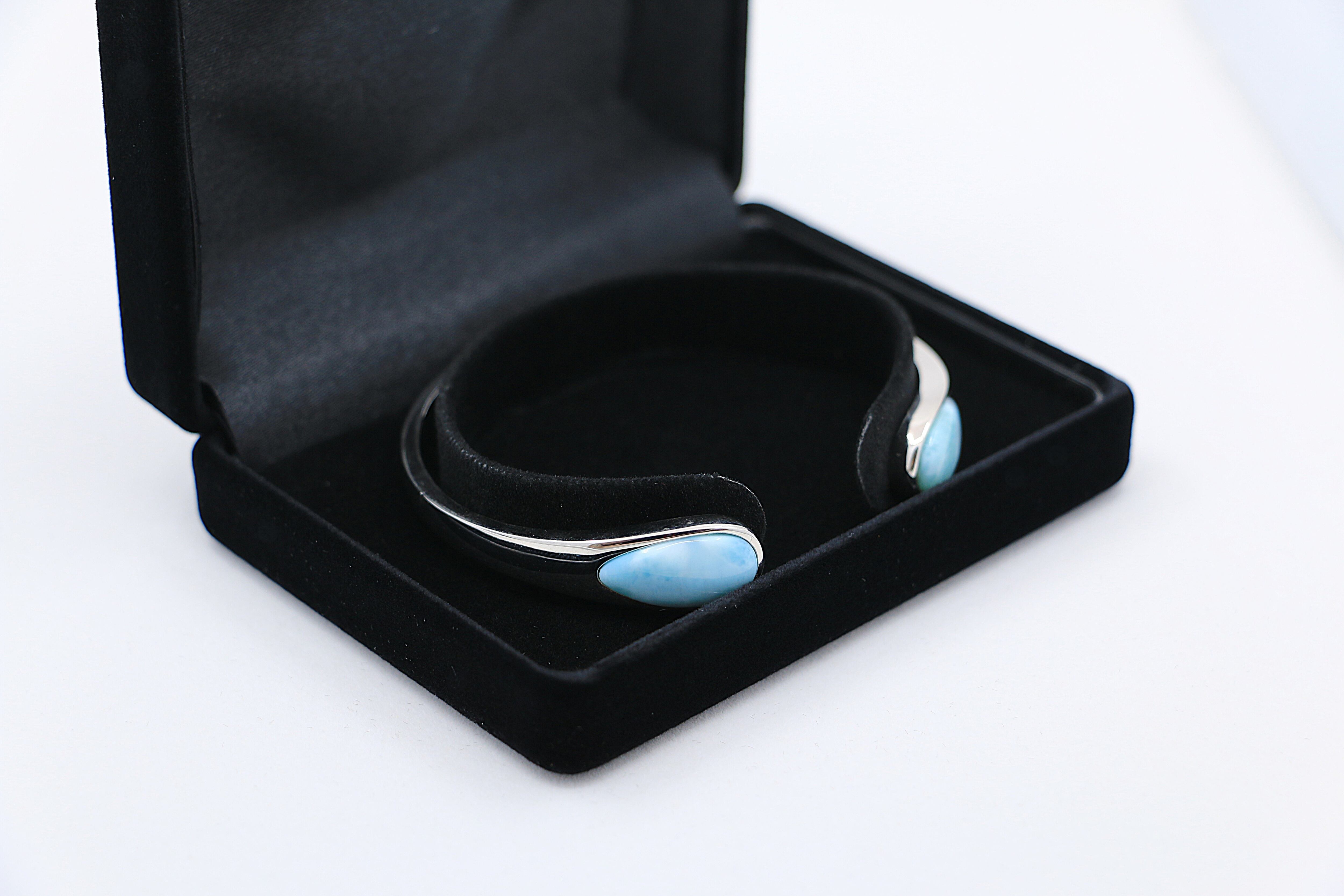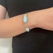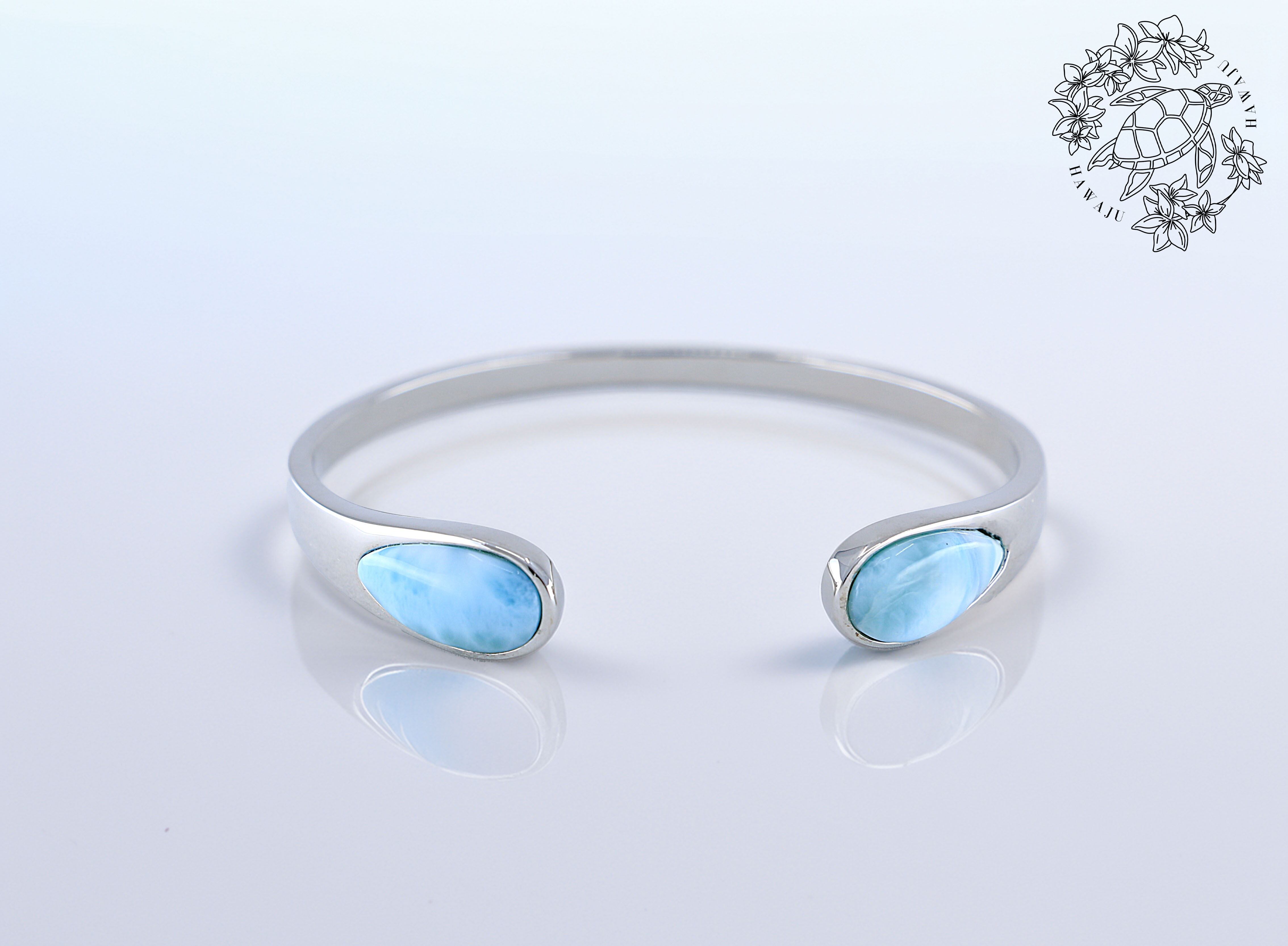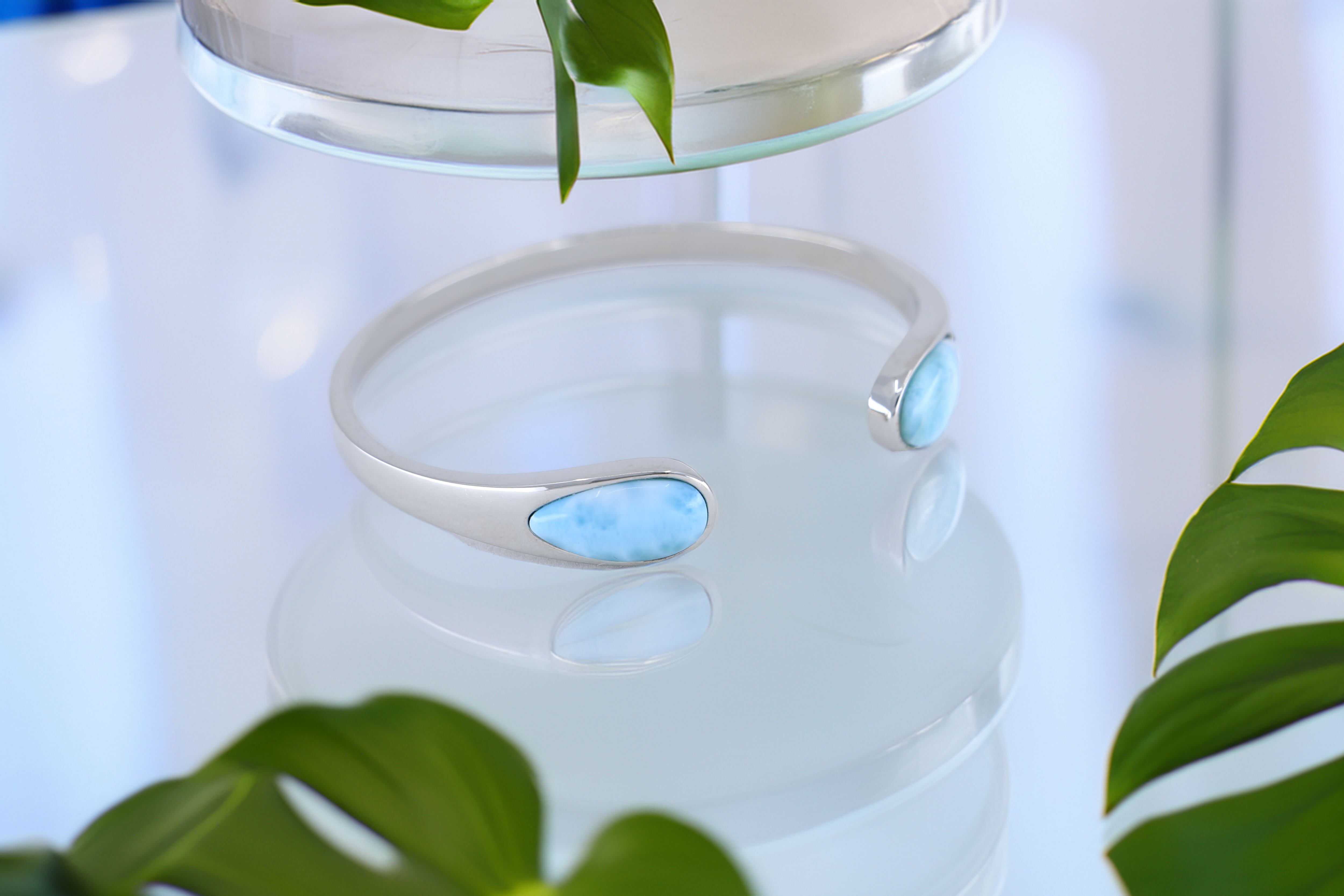 海のように美しく輝くラリマーを贅沢にあしらった、洗練されたデザインのシルバーバングル。開口部の両端にセットされた大粒のラリマーが、手元に上品なアクセントを加えます。シンプルながらも存在感のあるデザインで、カジュアルからエレガントなスタイルまで幅広くマッチします。南国の海のようなラリマーとシルバーの組み合わせが、上品で爽やかな印象を与え、大切な人への贈り物や、自分への特別なご褒美としてもおすすめです。