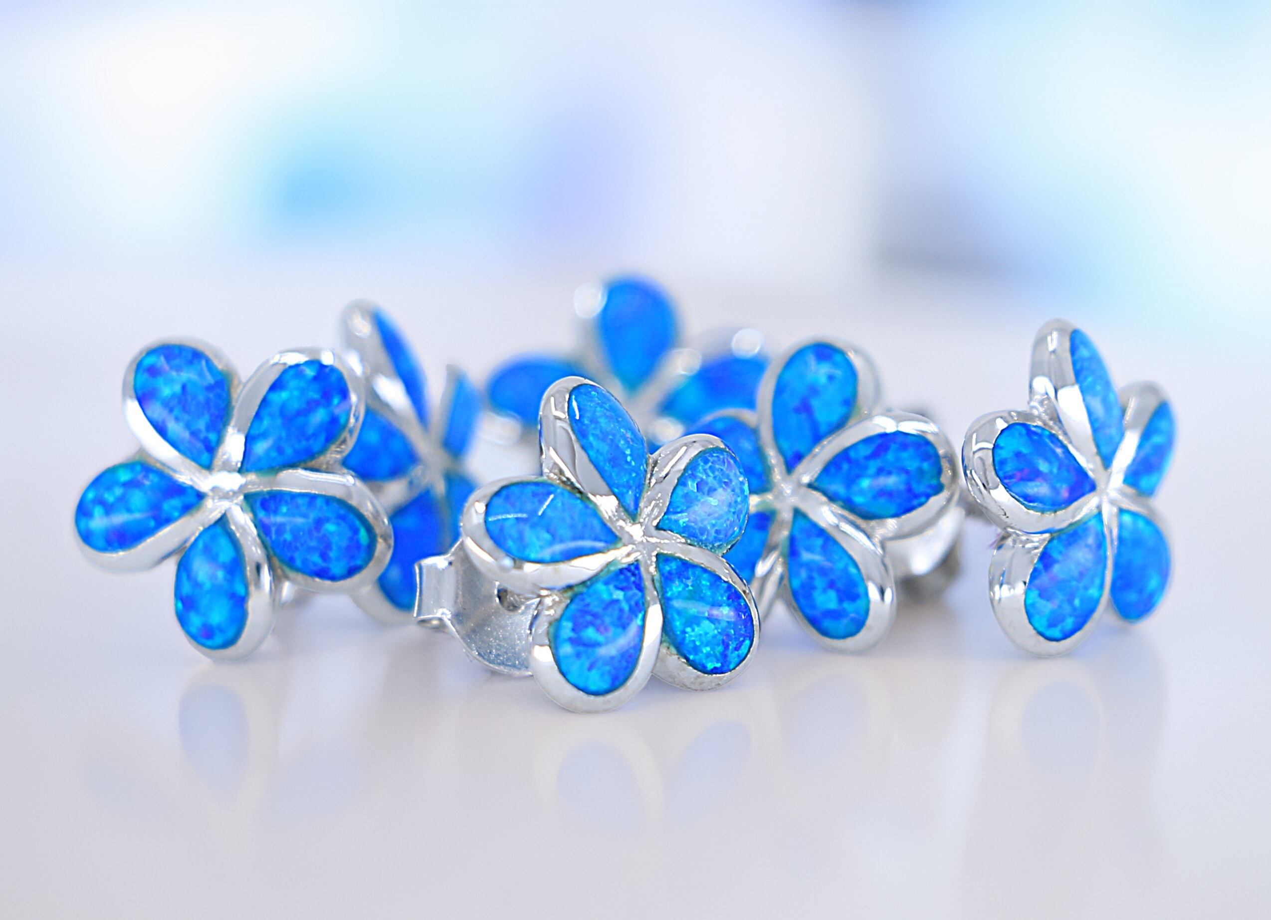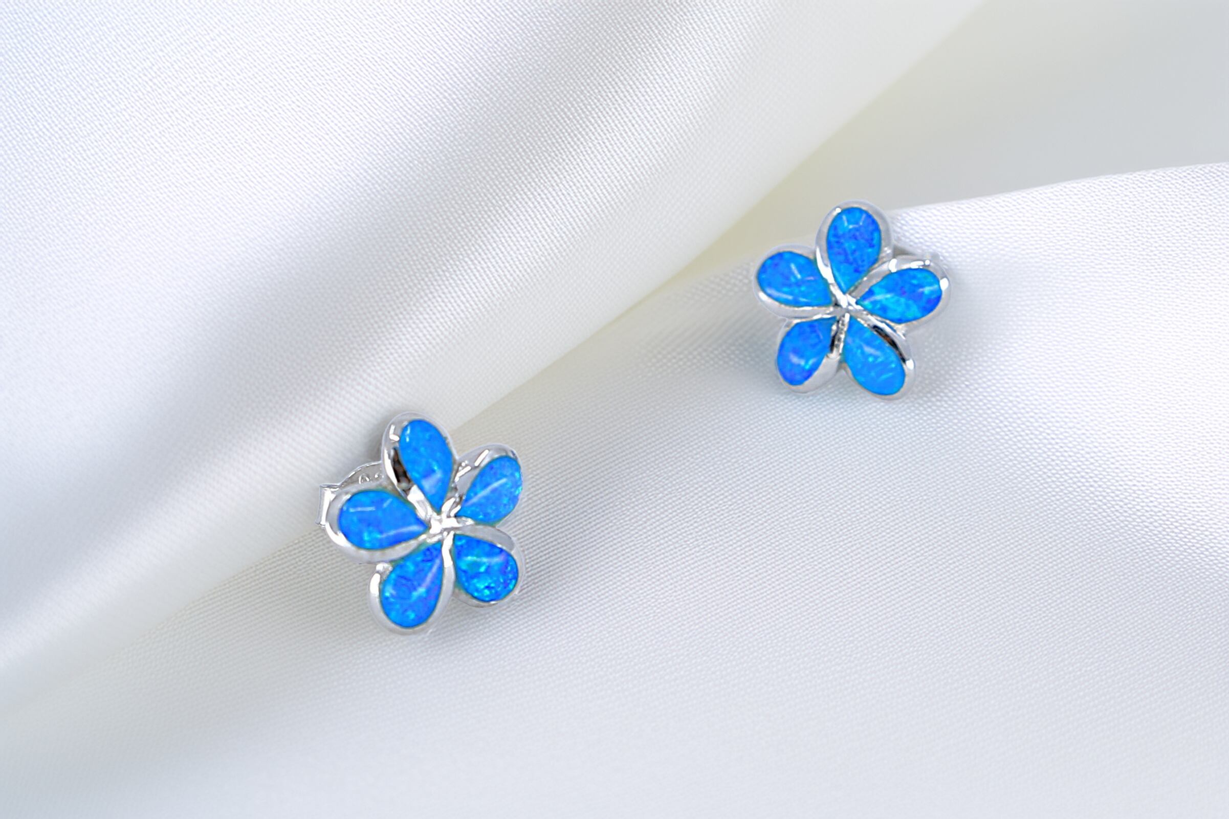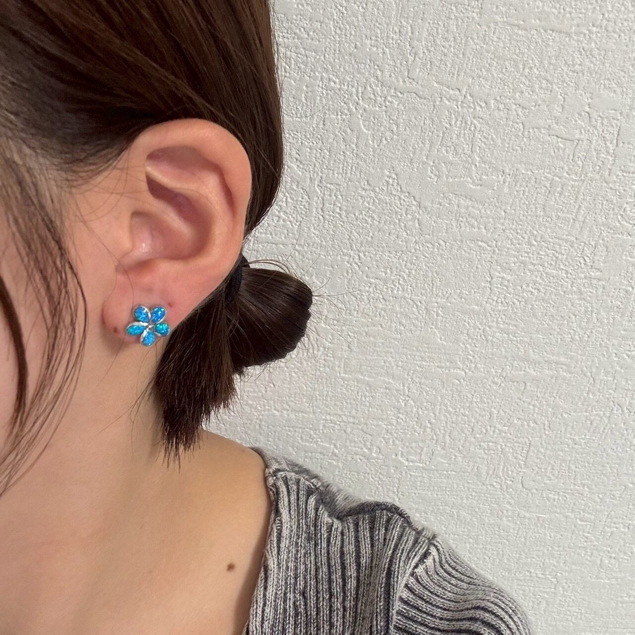 このピアスは、プルメリアの花がデザインされた、ポストタイプのピアスで、花弁にはブルーオパールが使用された、シルバー製のハワイアンジュエリーです。華やかで優雅なデザインが特徴で、特別な意味を込めたアイテムです。