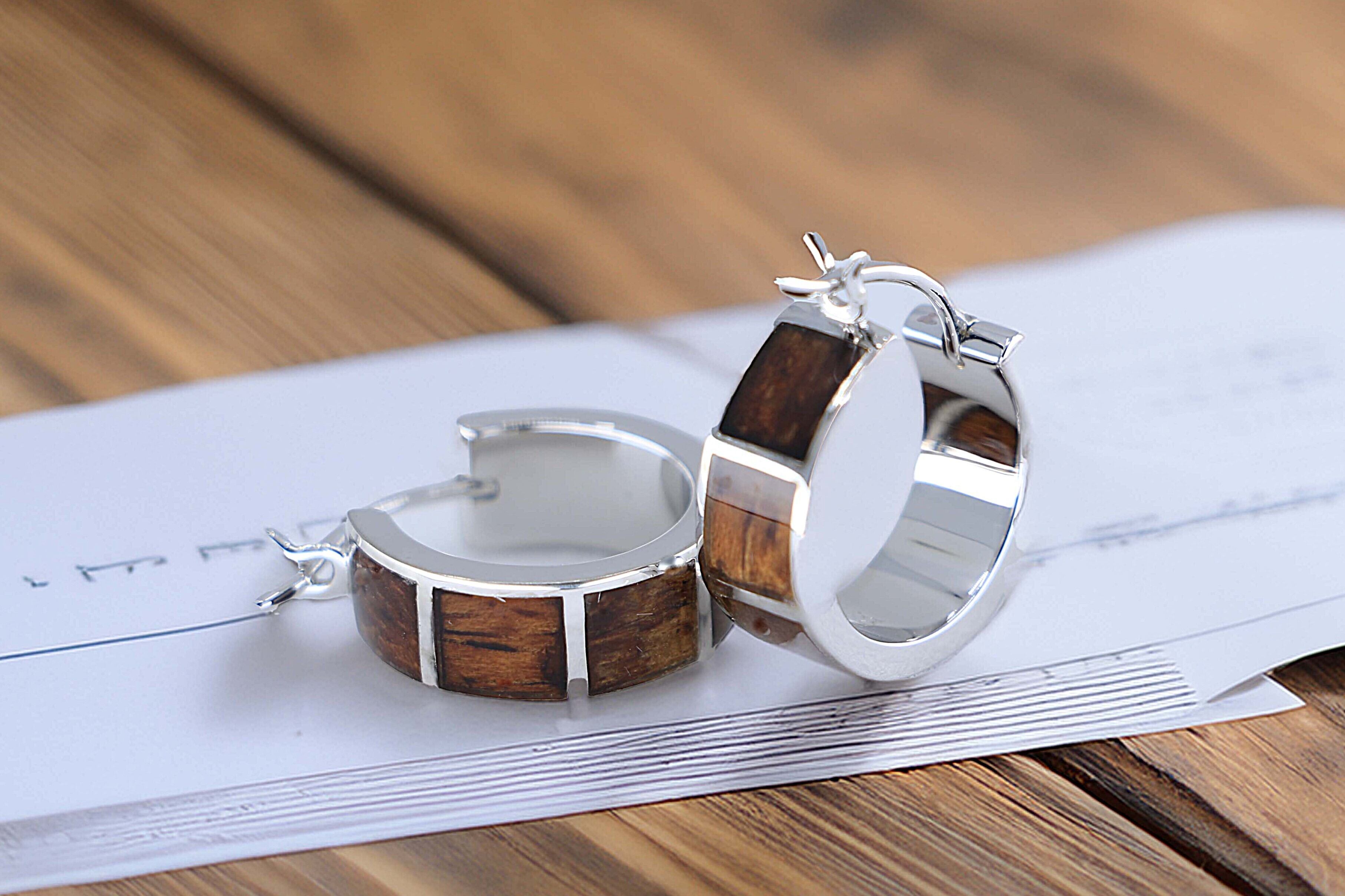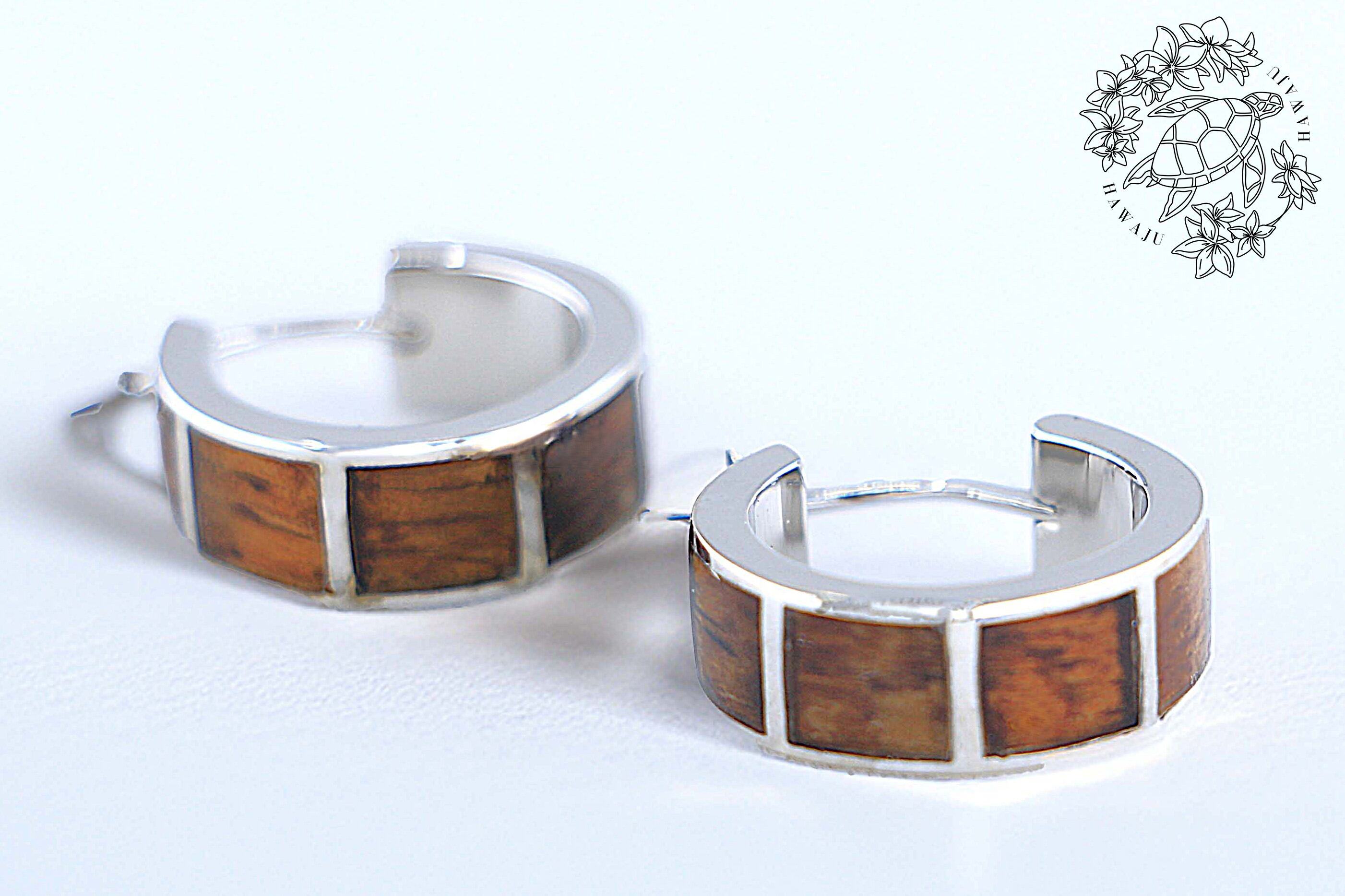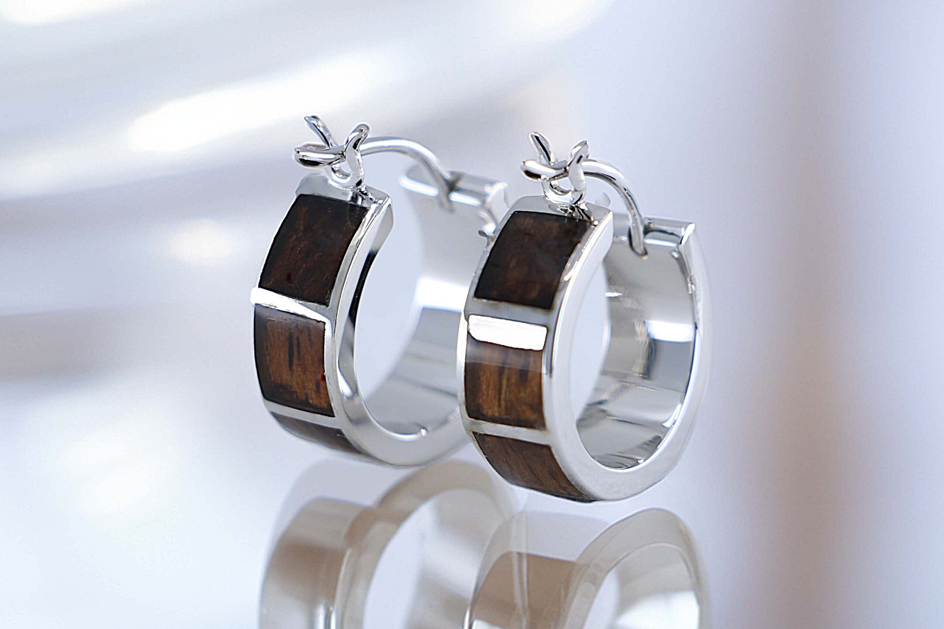 ハワイアンジュエリーの伝統と自然の美しさを融合させた、幅広デザインのリングタイプピアスです。ハワイ固有のコアウッドとシルバーを組み合わせた、高級感あふれるジュエリーで、シンプルなデザインながらしっかりとした存在感がある魅力的な一品です。