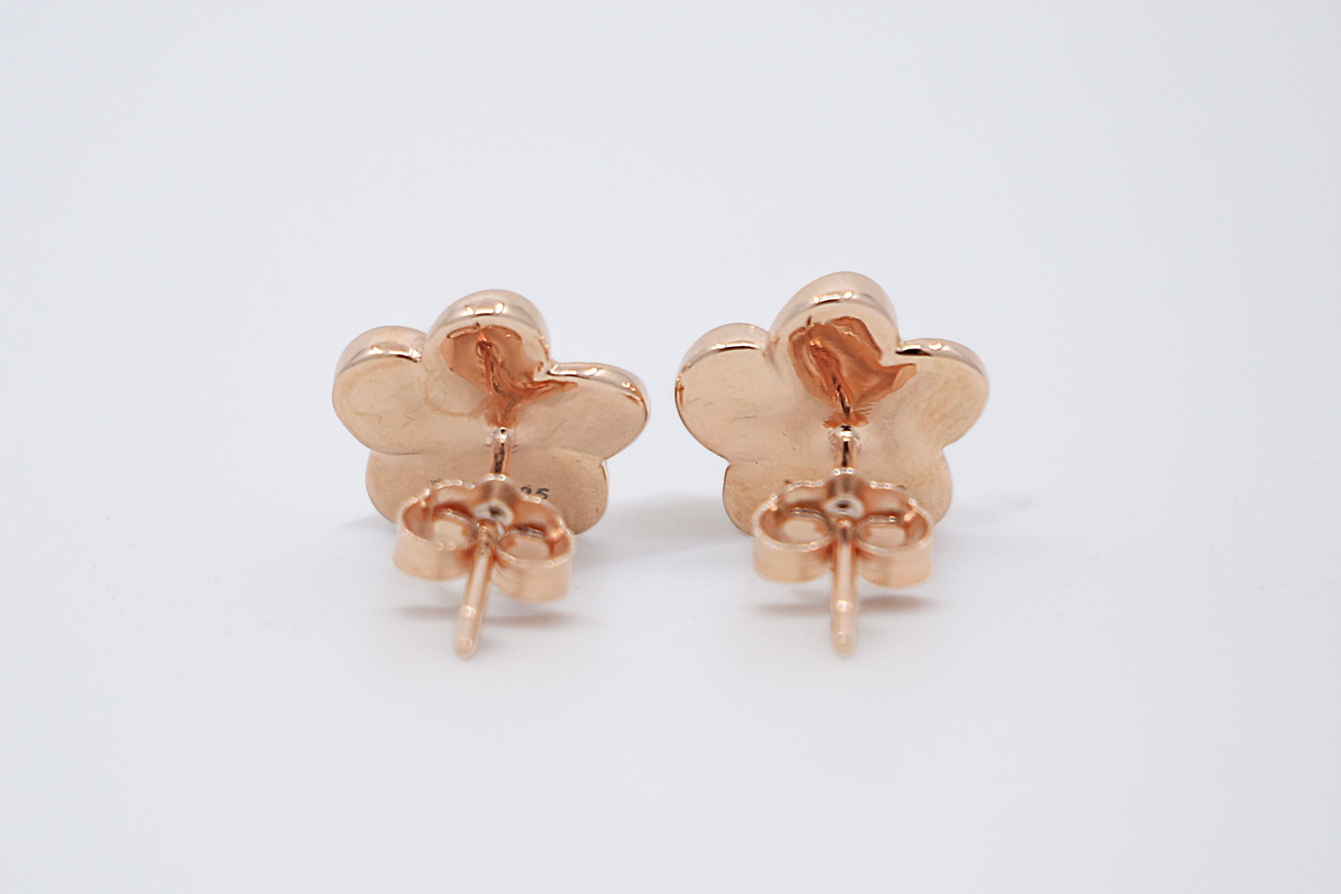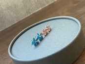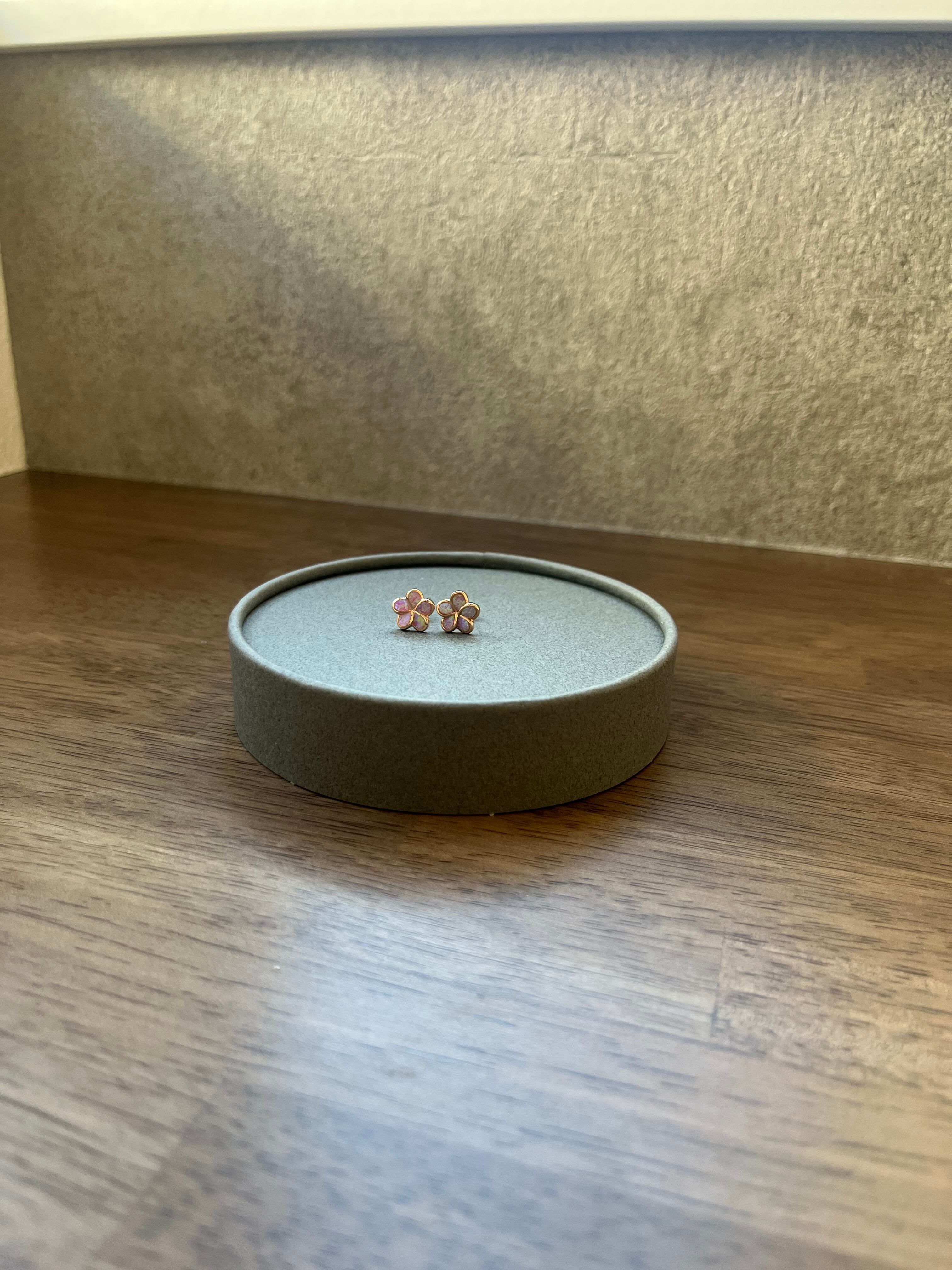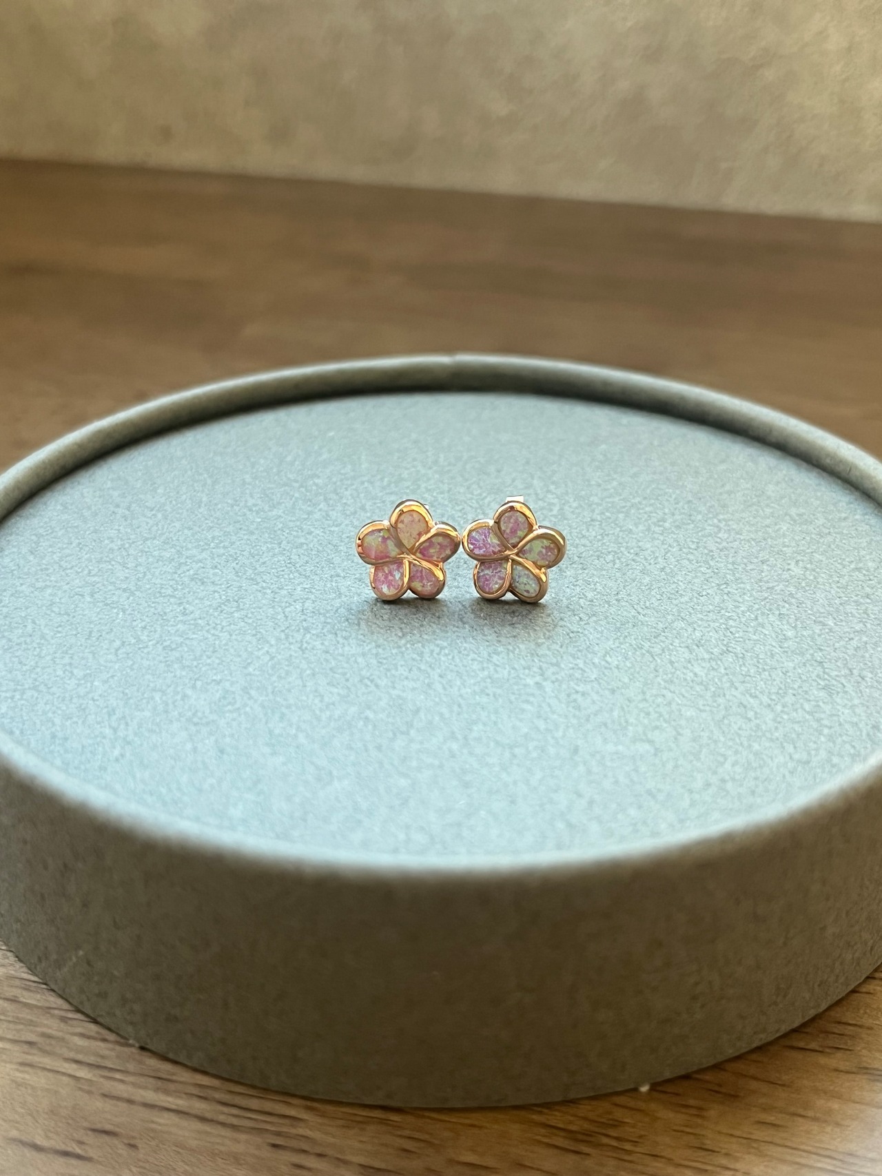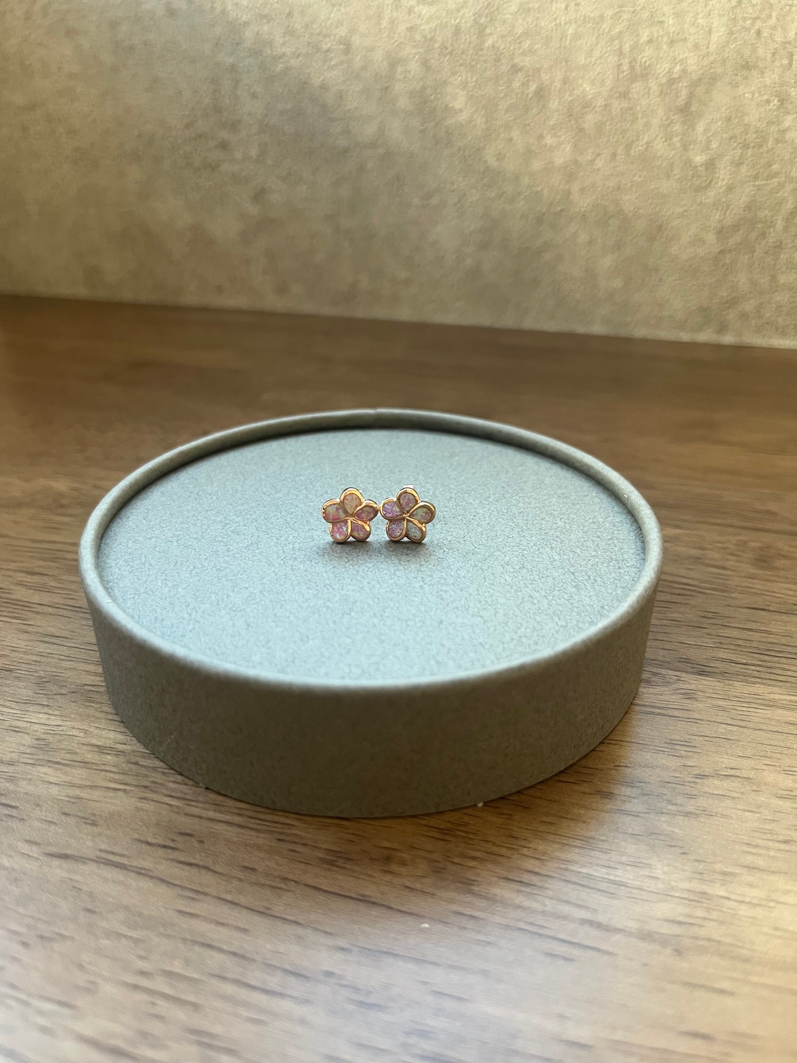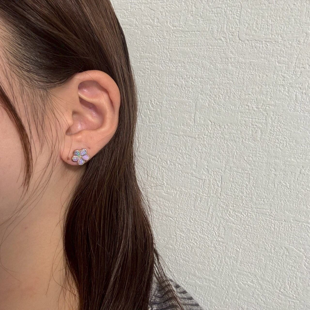 ピアス本体は、ピンクシルバー製で作られています。ピンクシルバーは、シルバーに微量の銅や金を加え、優しいピンク色を帯びた金属で、通常のシルバーよりも温かみを持っています。この色合いは、ピンクオパールの花弁と調和し、全体的に柔らかく華やかな印象を与えます。