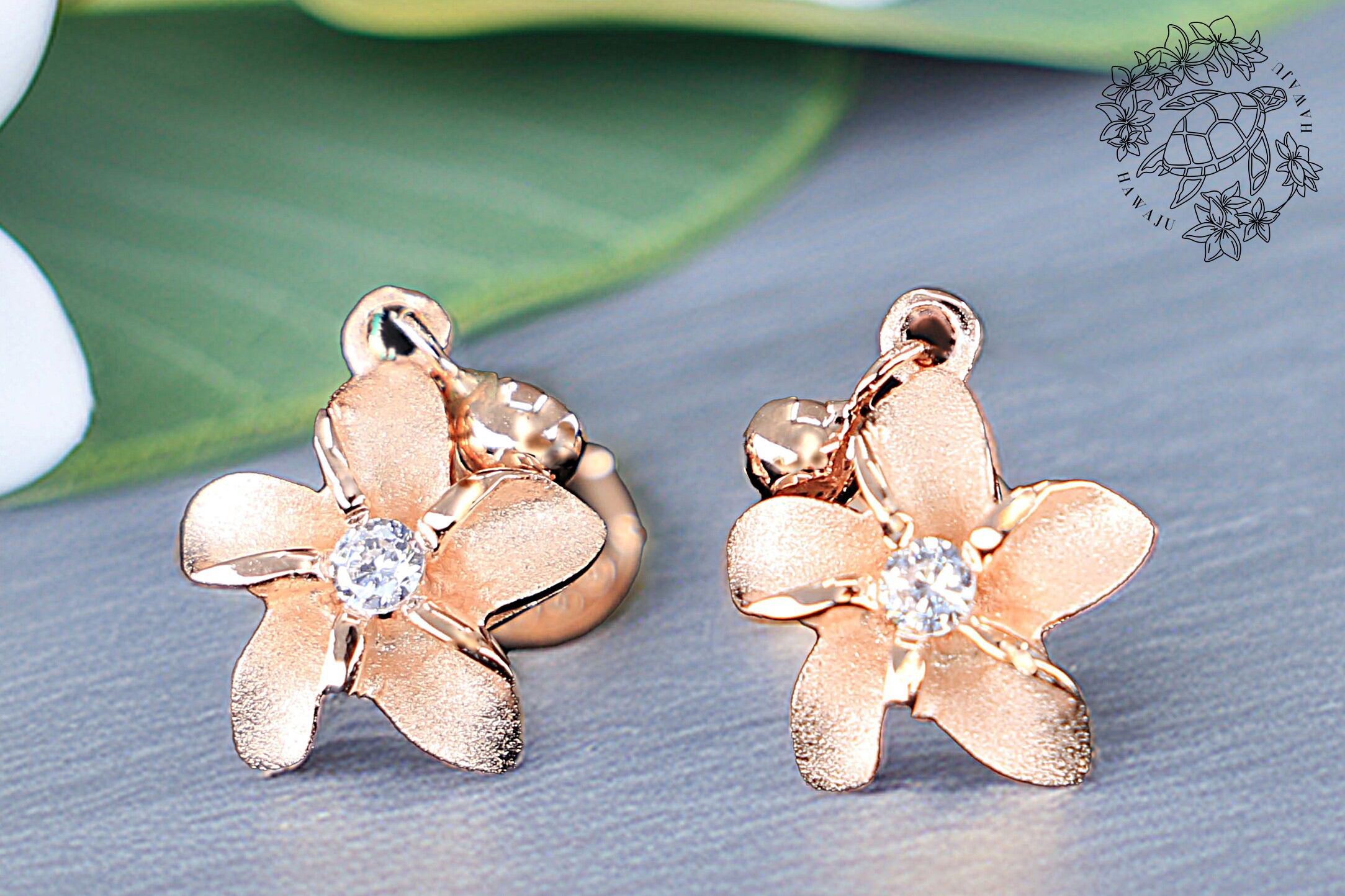 プルメリアの花の中央には、キュービックジルコニアがあしらわれています。キュービックジ