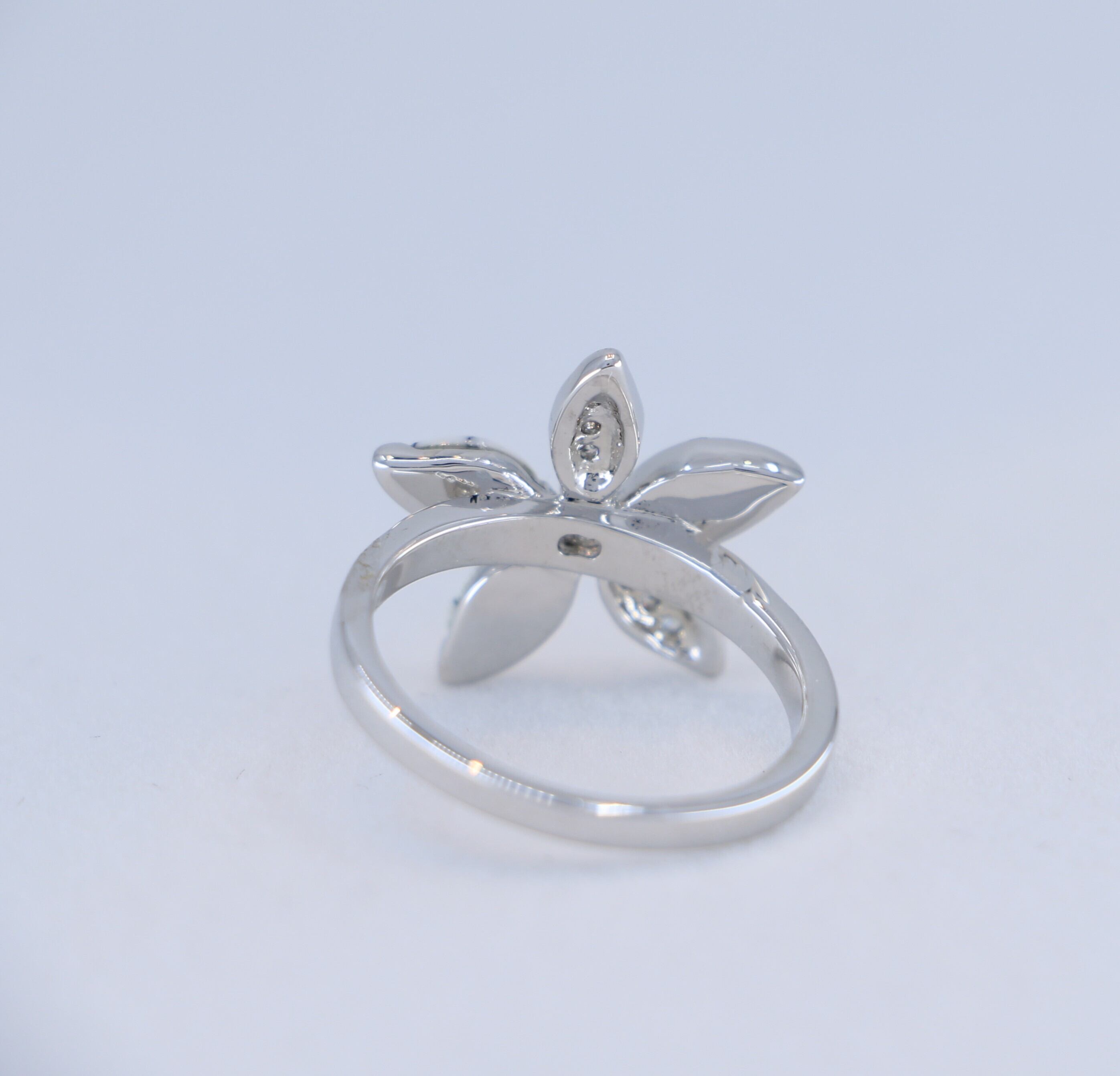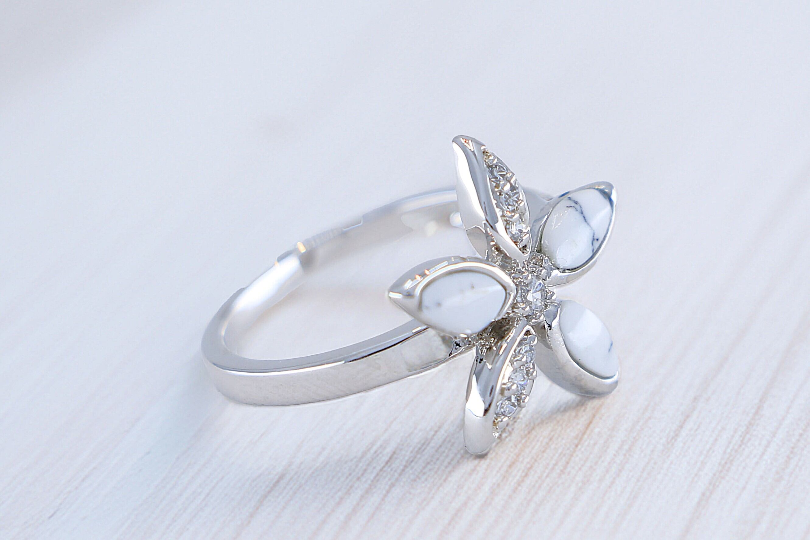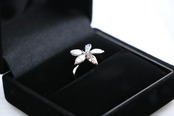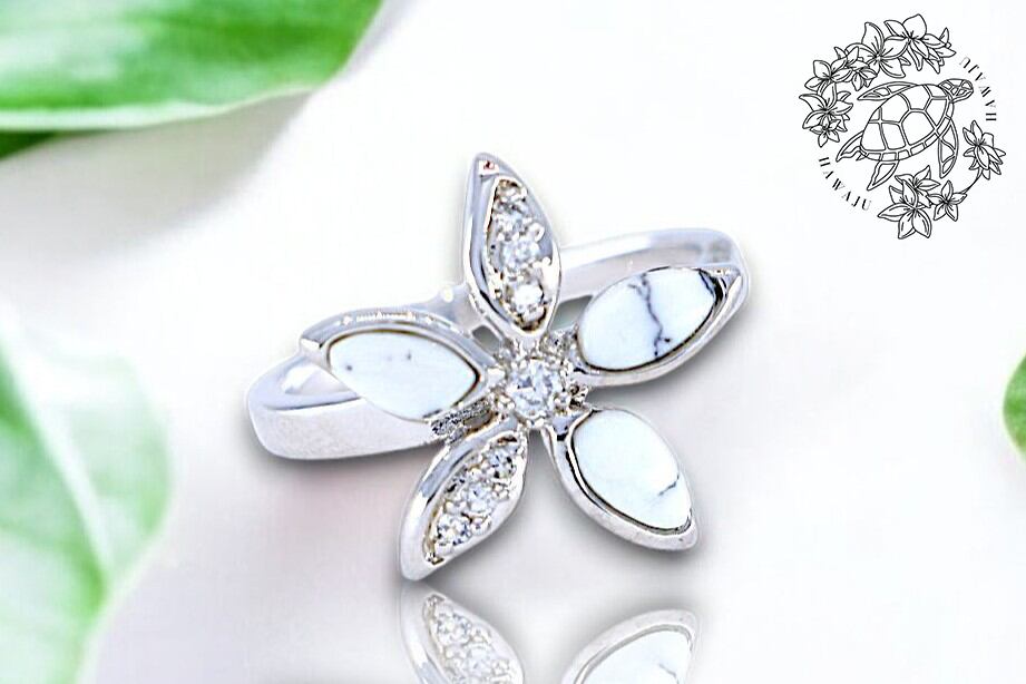 ハワイアンジュエリーの象徴である、プルメリアの花をモチーフにしたシルバーリング。美しい花弁にはホワイトターコイズとキュービックジルコニアをあしらい、華やかさと上品さを兼ね備えたデザインです。このリングは、愛・平和・幸運を象徴するプルメリアの花を指に輝かせることができ、特別な意味を持つアクセサリーです。