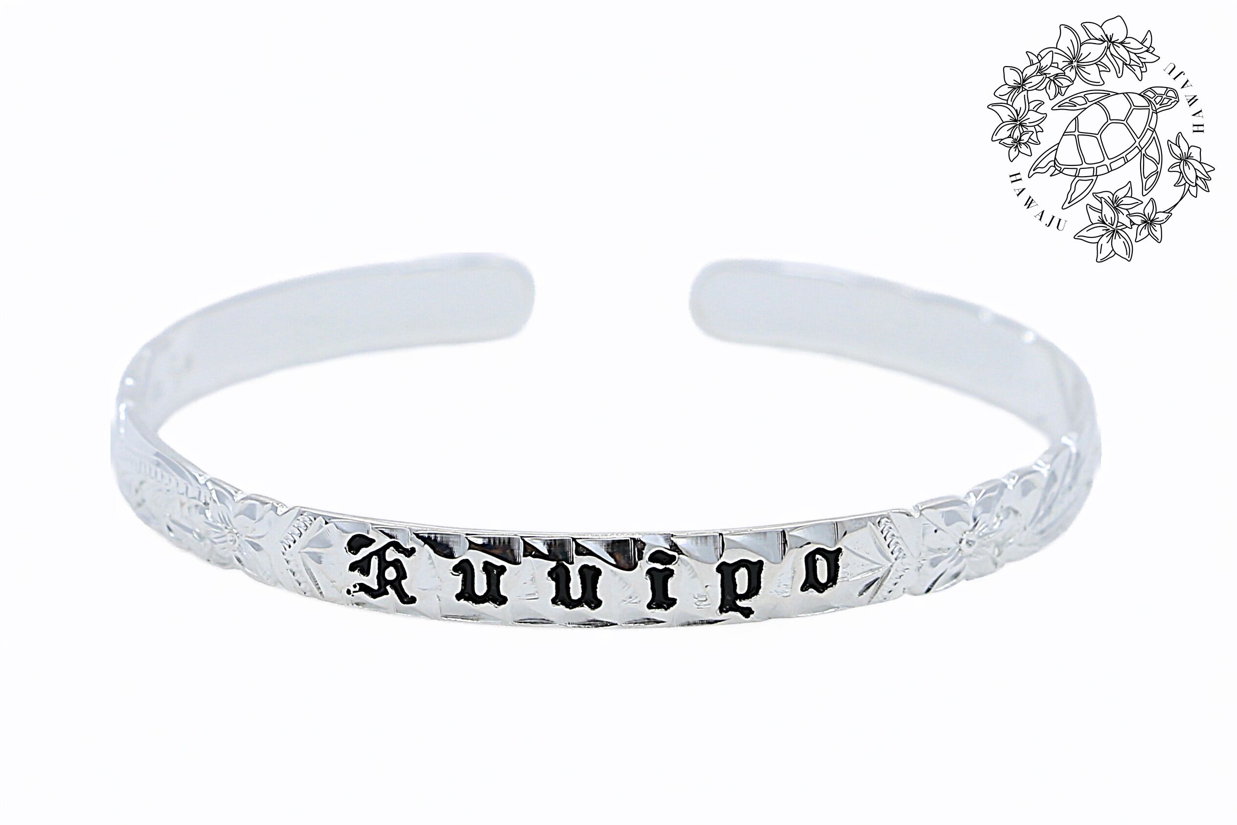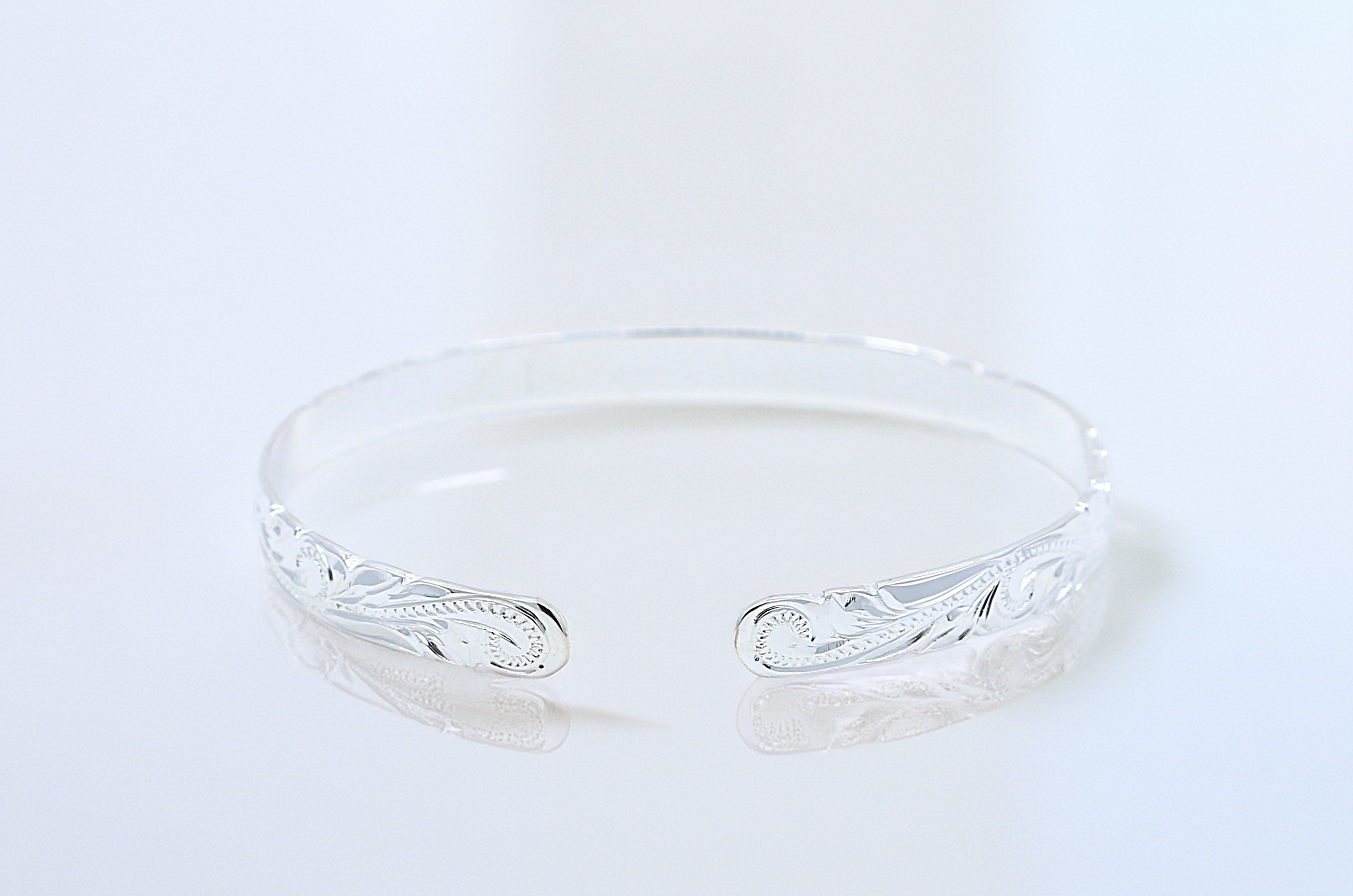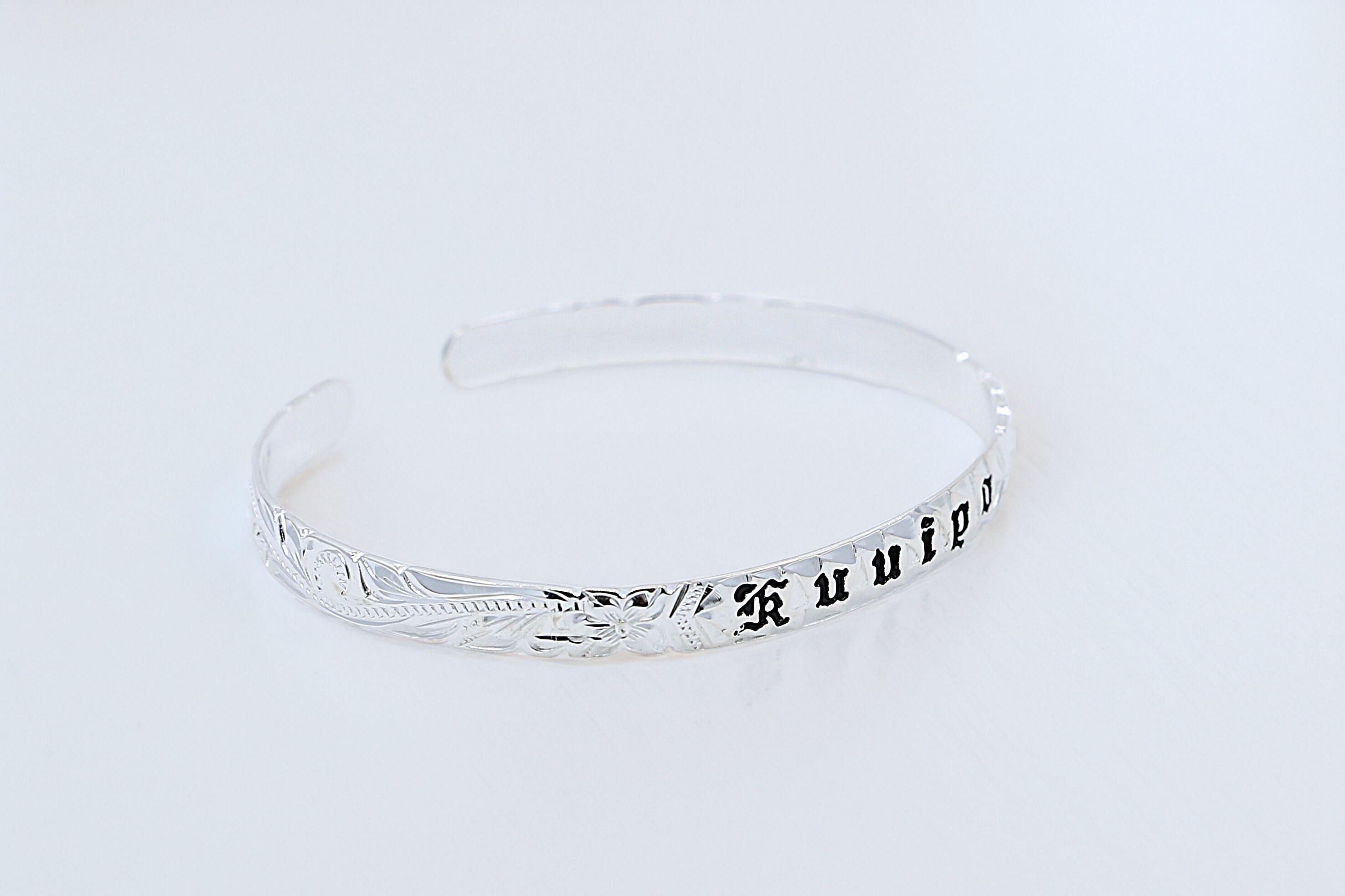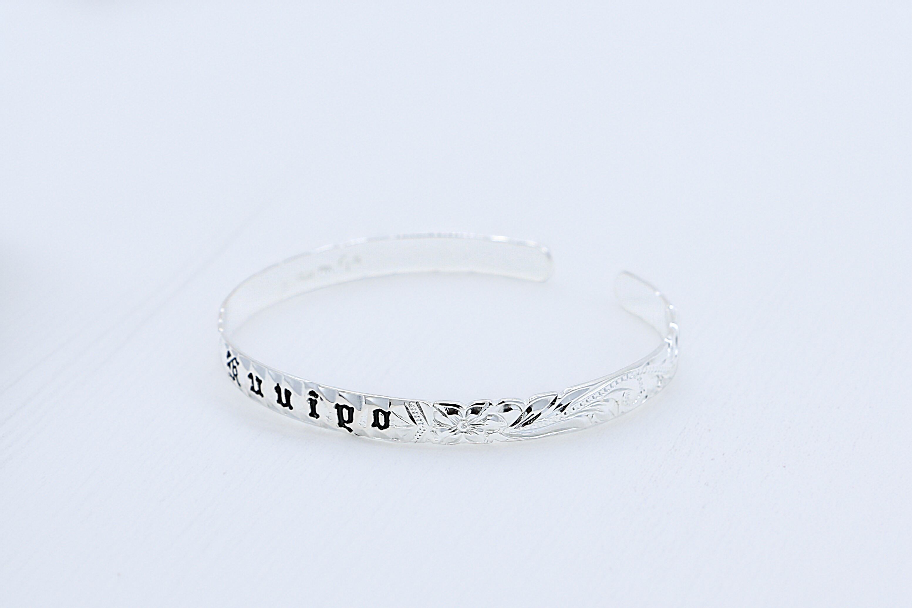 このバングルは、シルバーの上品な輝きに、ブラックエナメルで刻まれた「Kuuipo」の文字が映える洗練されたデザインで、幅6mmのスリムなフォルムが手元を美しく魅せ、ハワイアンジュエリーならではの伝統的なスクロール(波)模様やプルメリアの彫刻が施されています。
